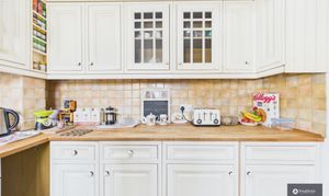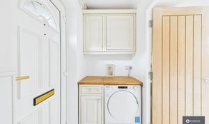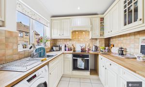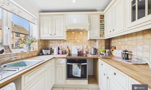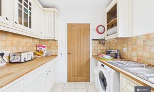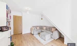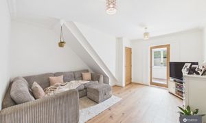 The ground floor offers a welcoming entrance hall leading through to a spacious, sociable and cosy living room, perfect for relaxing evenings. To the rear, a second reception room provides an ideal dining or family space, filled with natural light and opening directly onto the garden, creating a lovely indoor-outdoor flow. The kitchen is well fitted with stylish cabinetry, complemented by tiled splashbacks and a built-in wine rack, offering ample storage and workspace, with space for appliances and perfectly suited to both everyday living and entertaining.