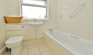 The modern bathroom comprises a panel enclosed bath, vanity wash hand basin, WC and a window to the rear.