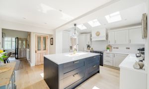 The heart of the home is the impressive bespoke kitchen, designed with a vaulted ceiling to enhance the natural light. It boasts a large central breakfast island, sleek quartz worktops, a range of high-quality fitted units, and integrated appliances. A separate utility room offers added practicality and includes a single external door leading to the side of the property.