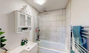 - Bathroom fitted with a white a white suite and a bath with a waterfall shower over