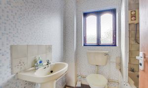 With window to the front elevation, bath with shower over, pedestal wash hand basin, low-level WC, radiator.