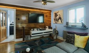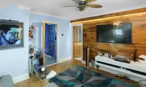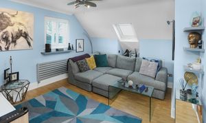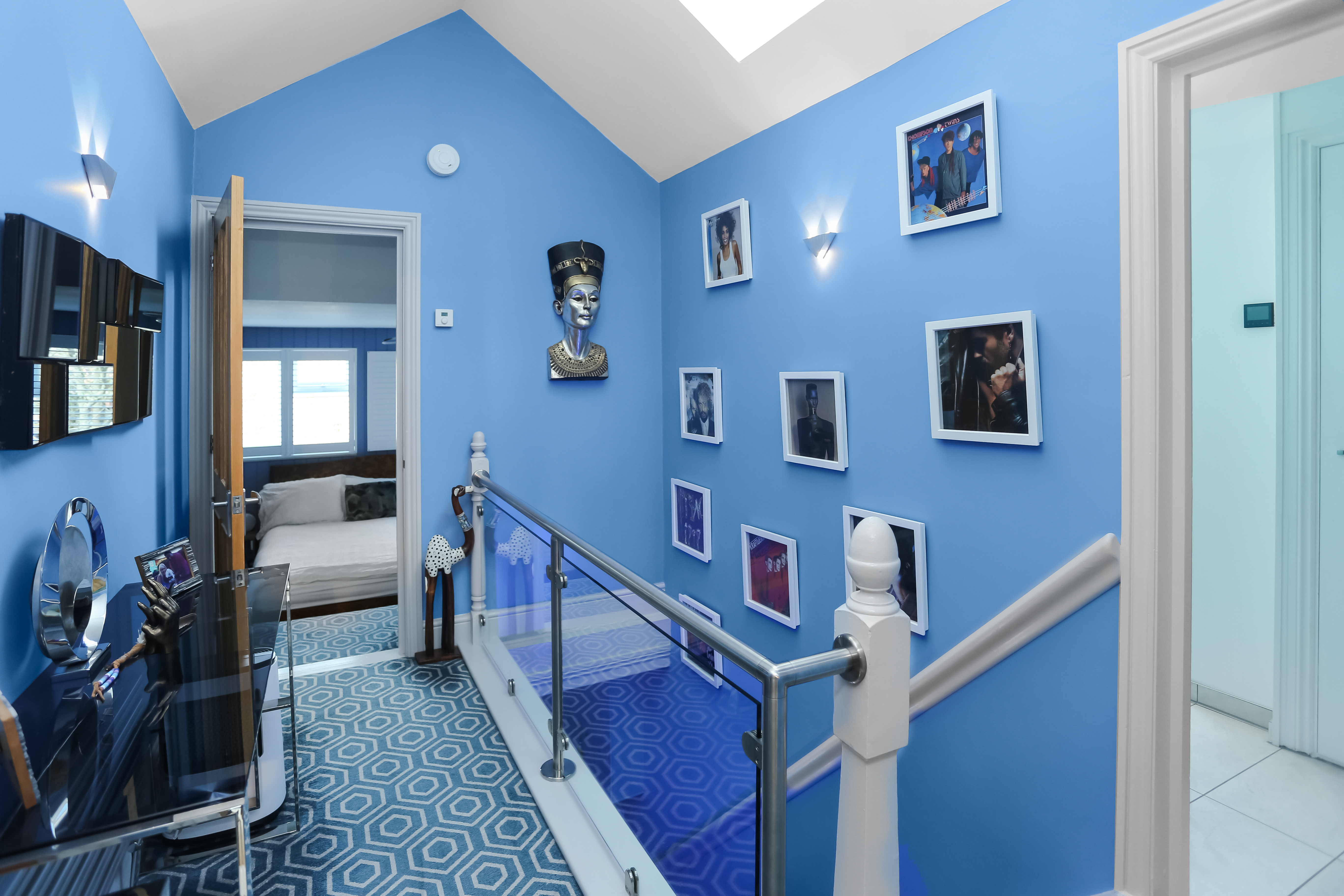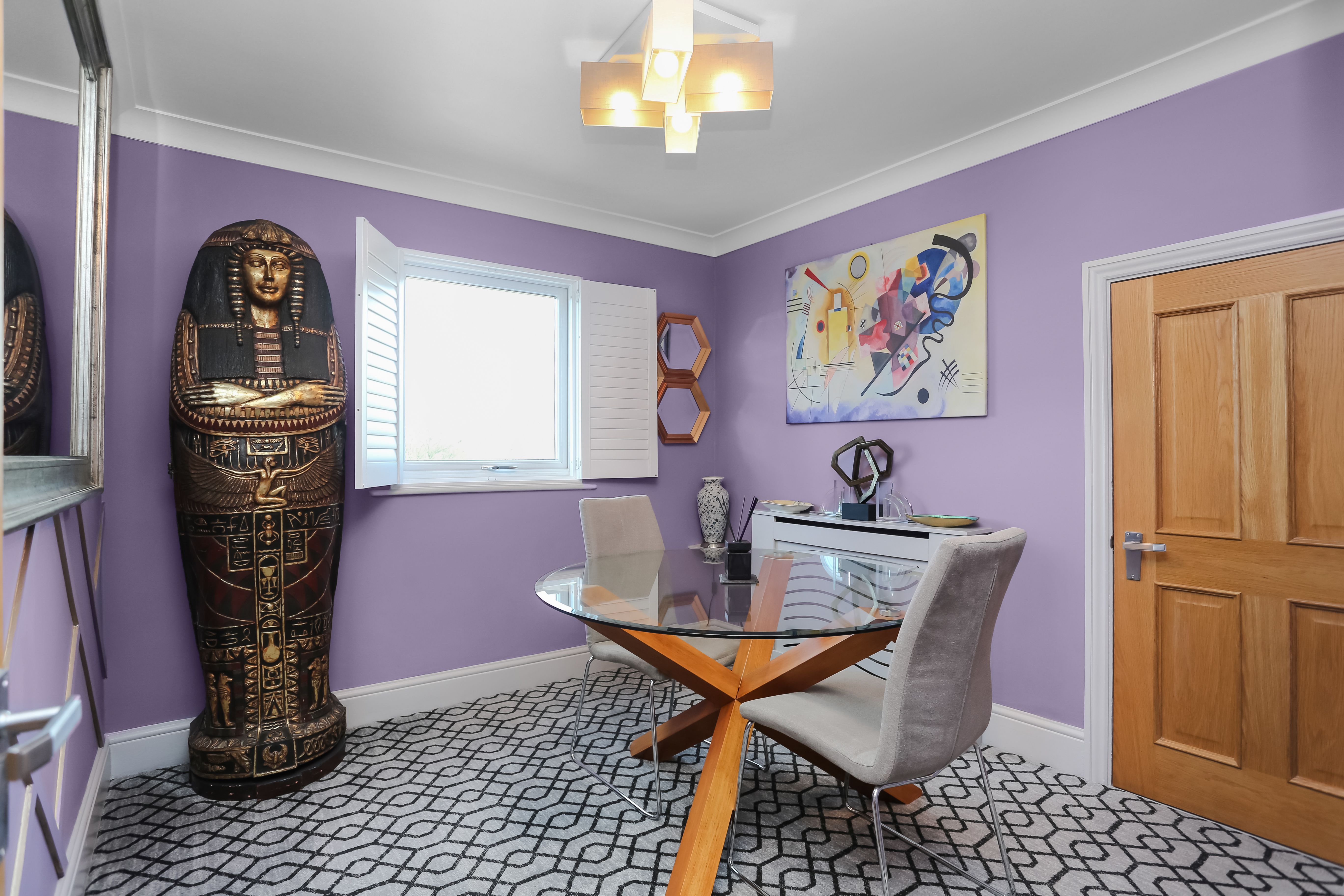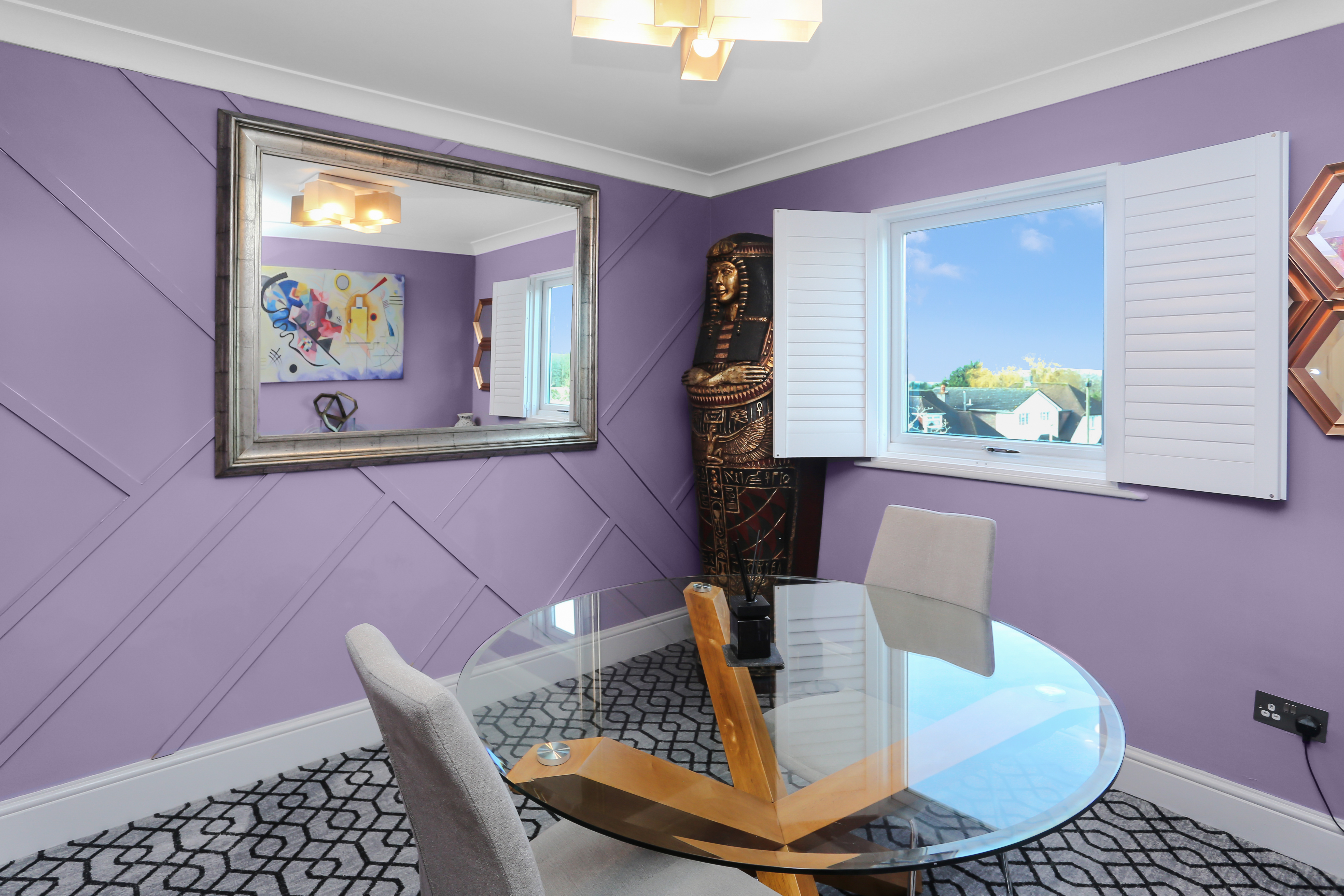 Upon arrival, a beautifully curated entrance hallway immediately sets the mood, with elegant staircase lighting introducing the contemporary sophistication that continues throughout the home. The expansive lounge is flooded with natural light, enhanced by tinted double-glazed windows installed in 2019 and stylish fitted shutters. Remote-controlled Velux windows with integrated blackout blinds and automatic close rain sensor which provides both convenience and privacy, creating an inviting yet tranquil living space.