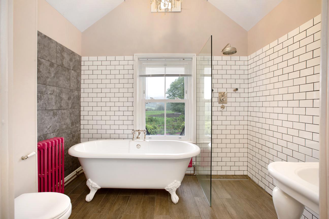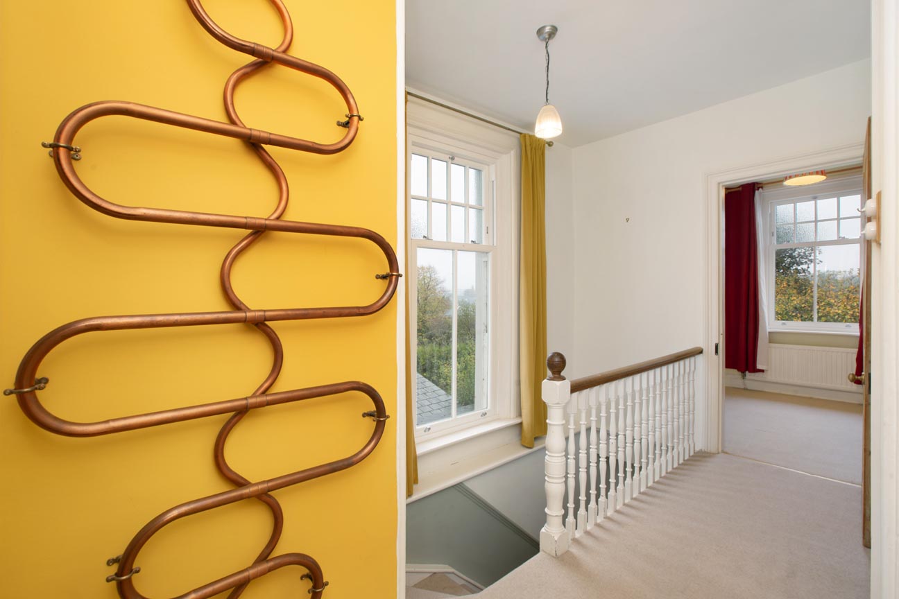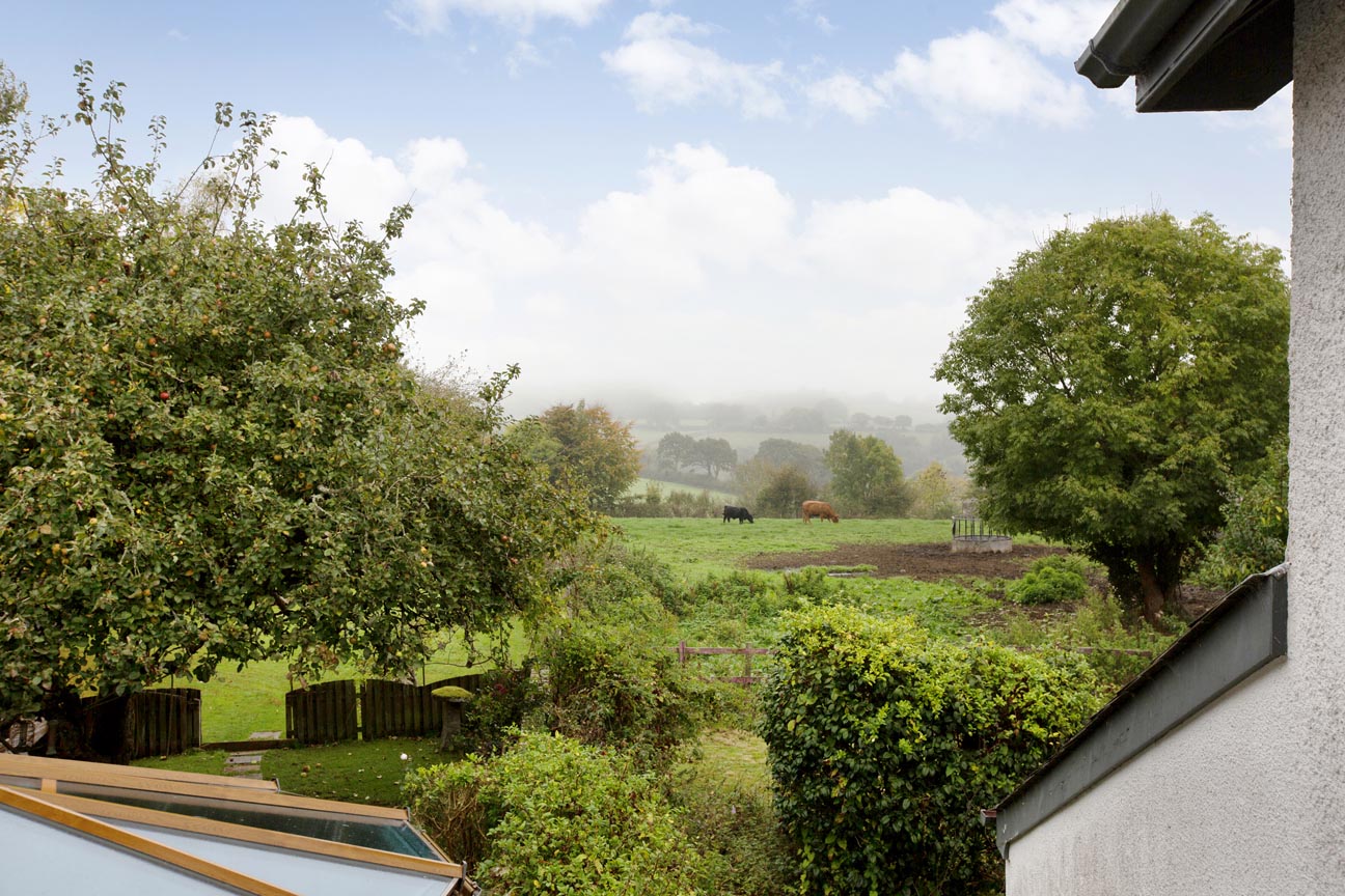 Upstairs, a wide and airy landing leads to four bedrooms. The two front bedrooms enjoy stunning views across Dartmoor, while the two at the rear look out over the fields behind the house. All the bedrooms are well-proportioned and filled with natural light. The family bathroom is well presented and includes both a bath and a separate shower, with generous windows that make the room feel bright and airy. Above the first floor is a large attic space with skylights, currently used for storage but offering great potential for further use.