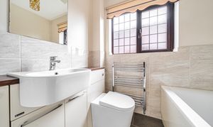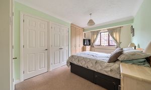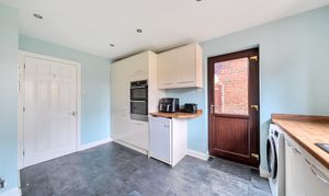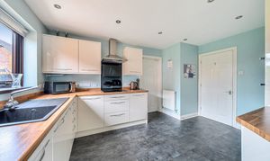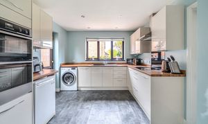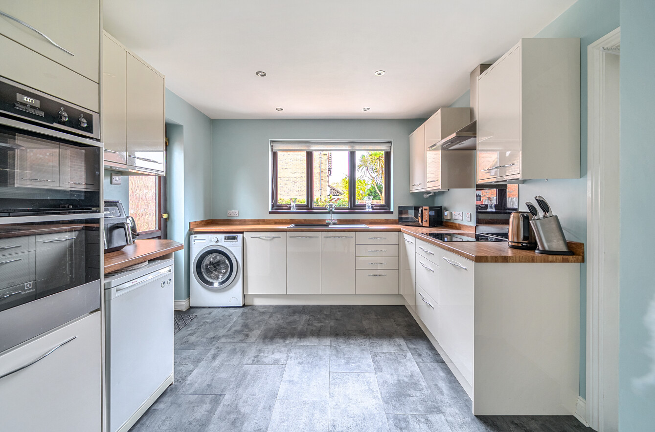 The modern fitted kitchen offers ample worktop and cupboard space, along with integrated appliances and a pleasant outlook over the garden. There is also convenient access to the side of the property and garage.