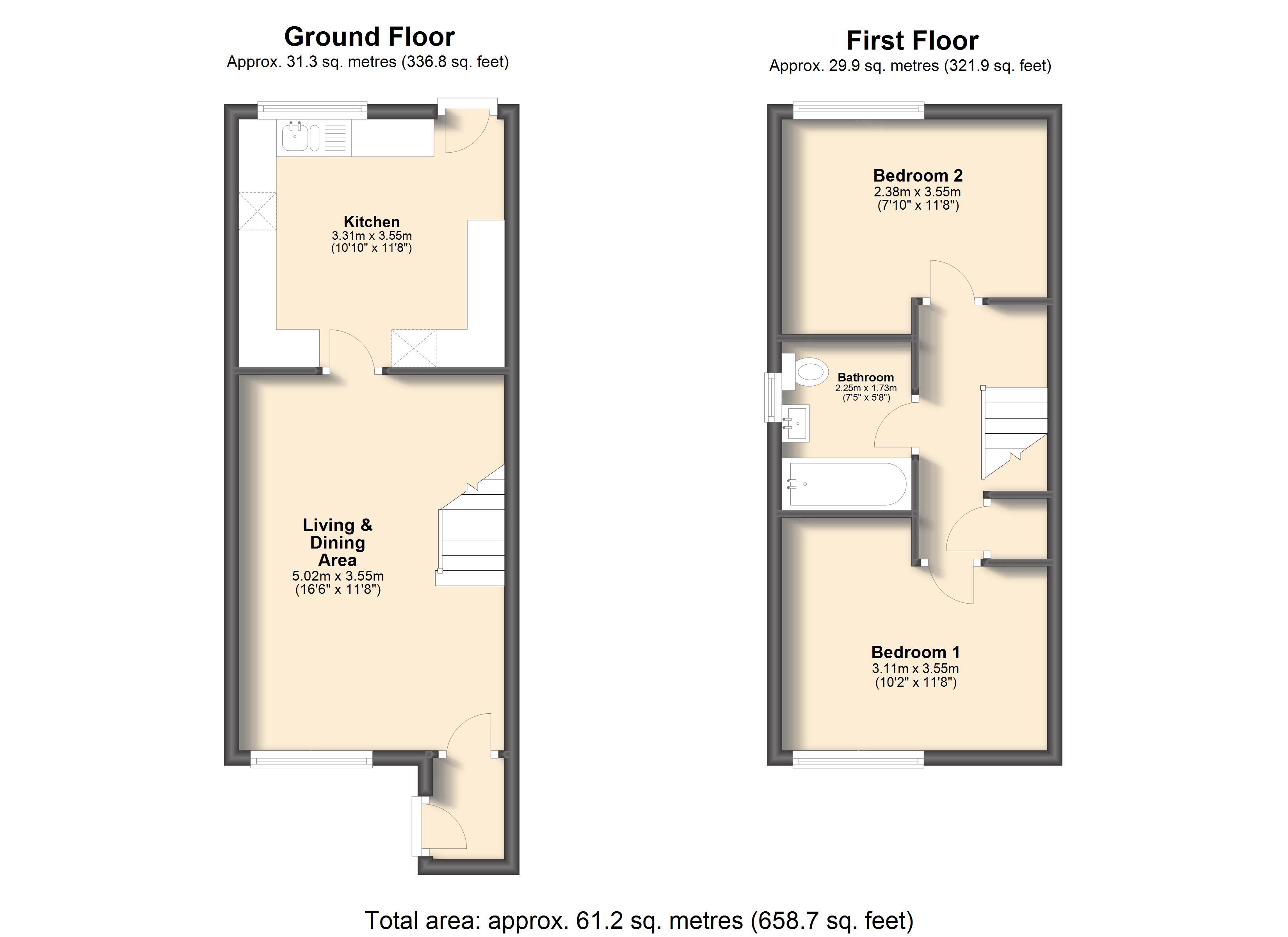 Inside, the home features a modern, fitted kitchen with contemporary finishes, alongside a spacious, open-plan living and dining area that provides an inviting setting for everyday living, hosting guests, and relaxing in comfort. Both bedrooms are excellent doubles, each offering plenty of space for stand-alone or fitted furniture. A beautifully designed bathroom, complete with a sleek three-piece suite, complements the accommodation.