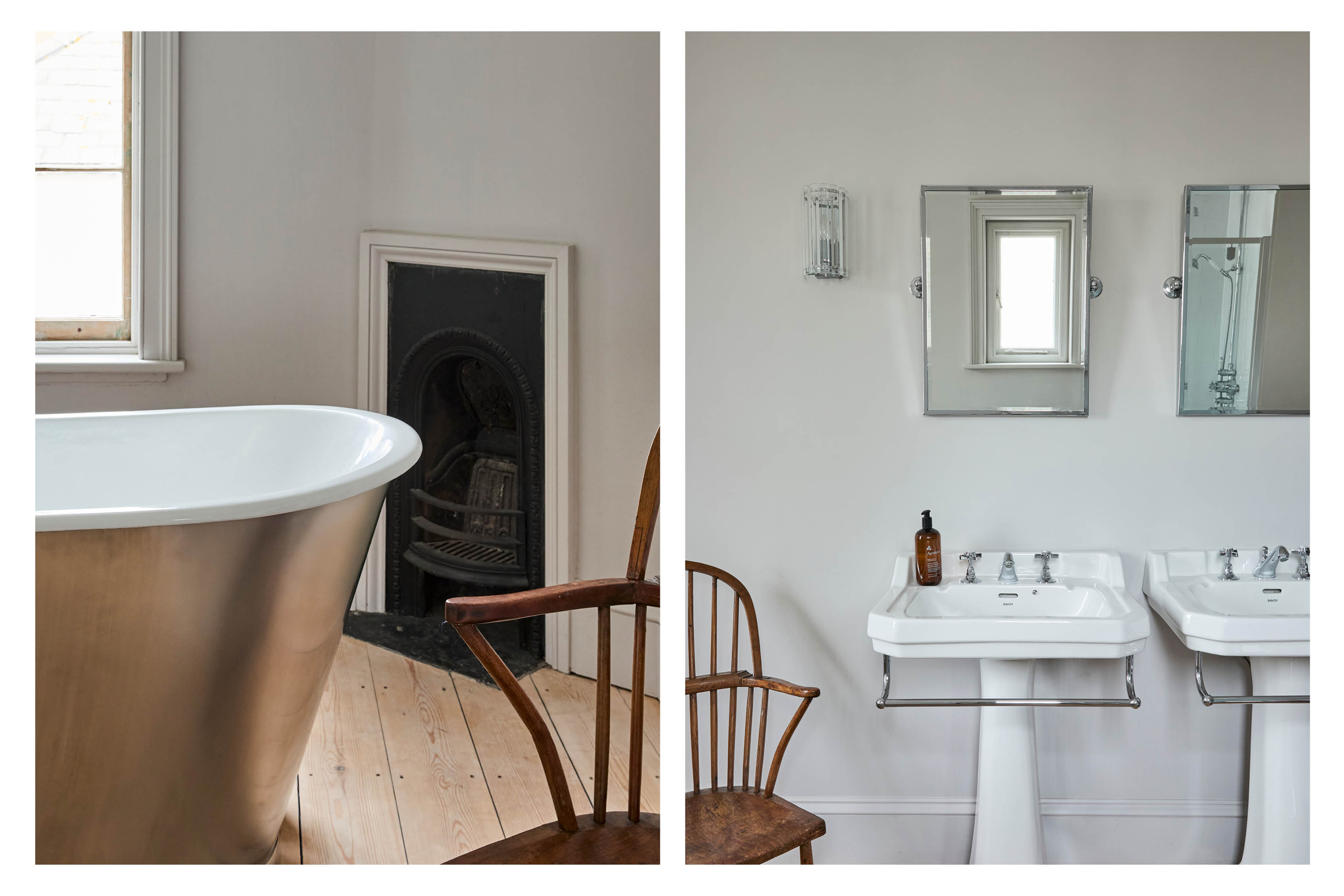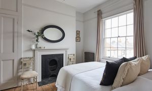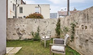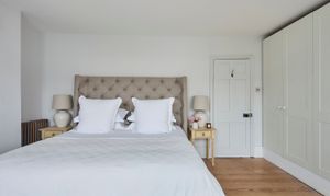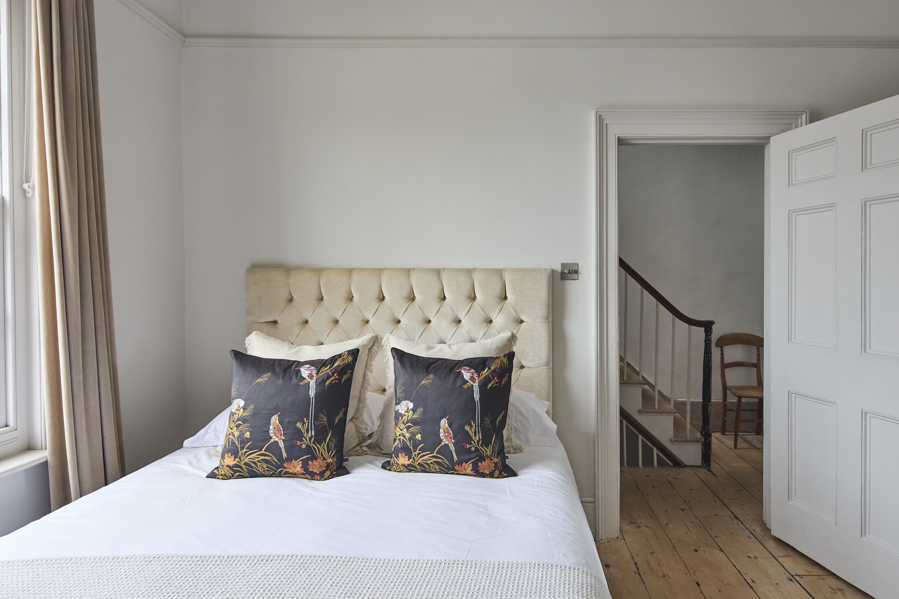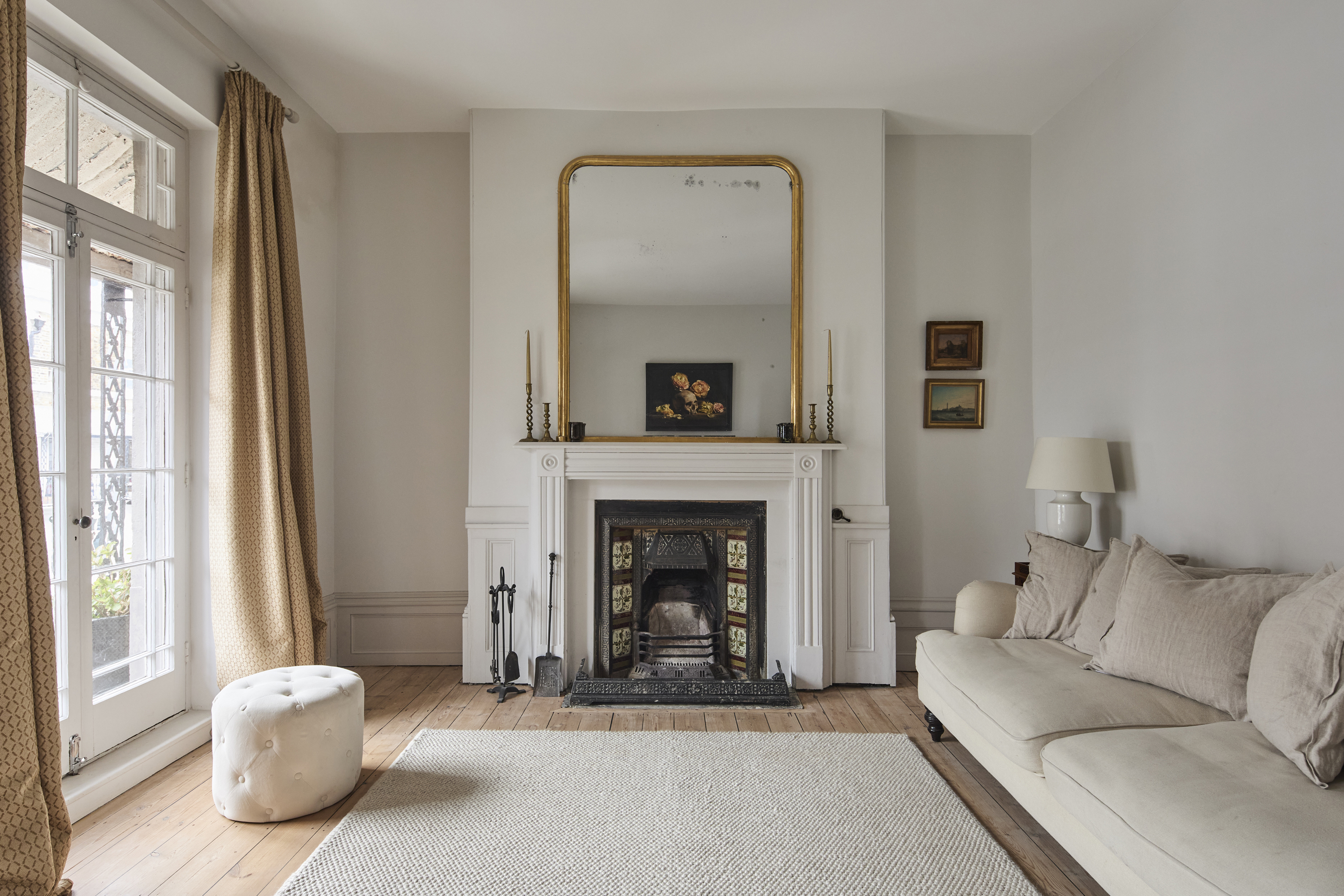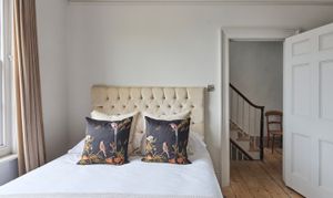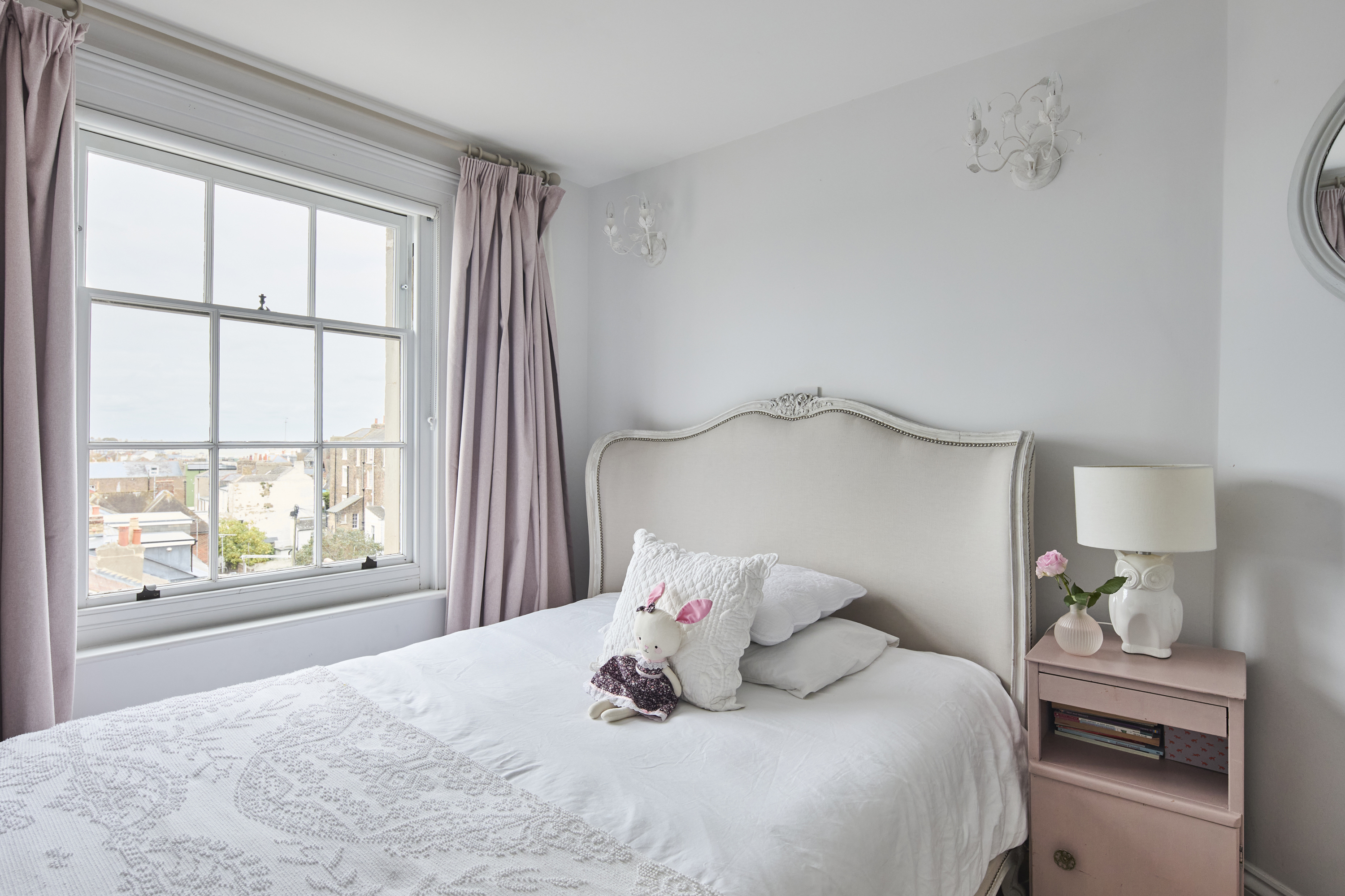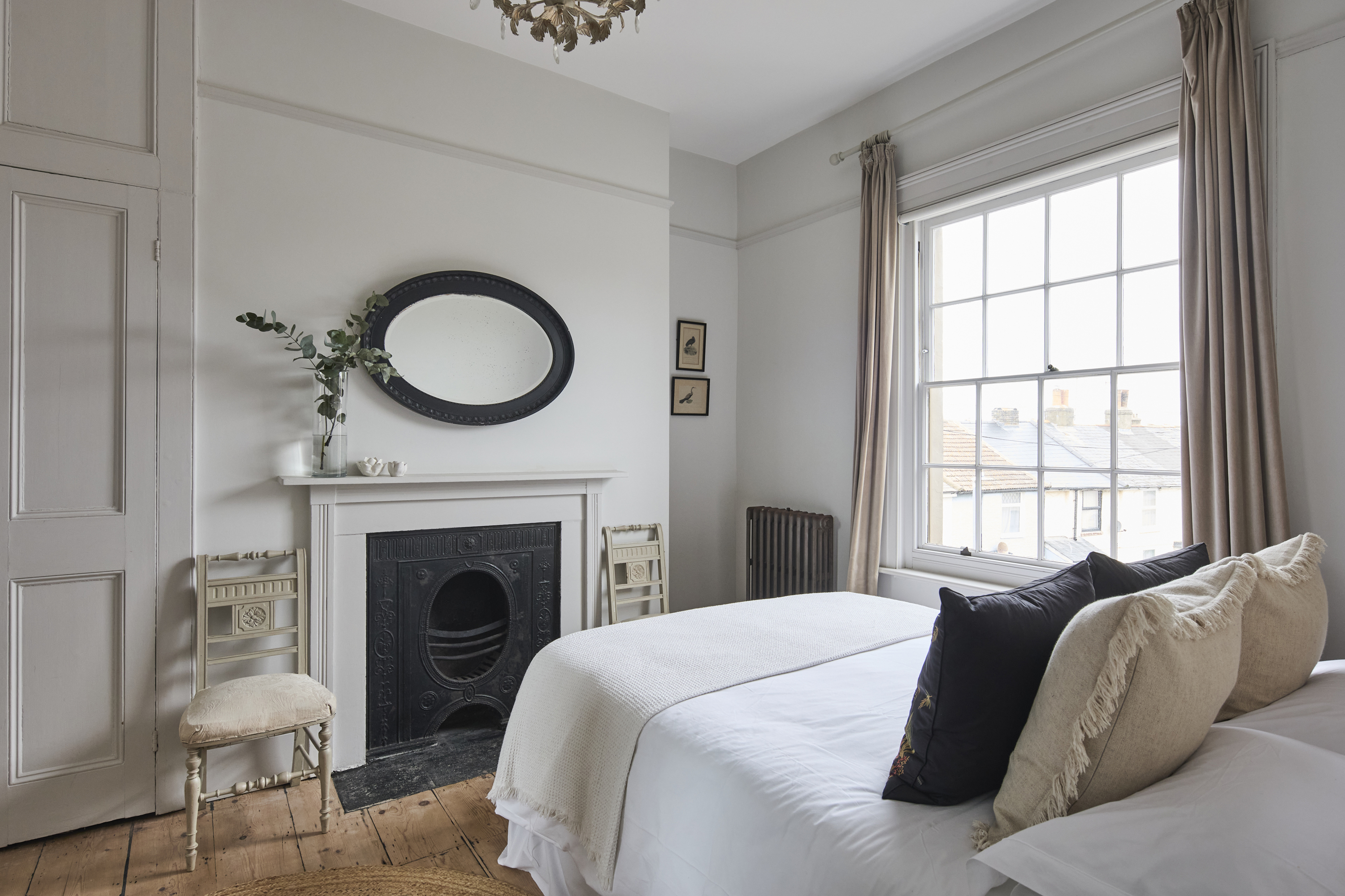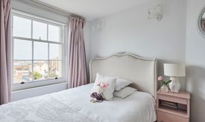 Each floor of the house has a distinct feel. The sizeable main bedroom, with its original fireplace, large windows, and fitted wardrobes, is paired with a lush bathroom with a copper bath, a walk-in shower finished in Carrara marble, and another original fireplace. Upstairs, high-ceilinged reception rooms and a balcony with Channel views provide the ideal retreat for afternoon tea or a relaxing sundowner, while the cosy bedrooms on the top floor exude charm and offer stunning views over the historic town and the sea.