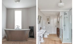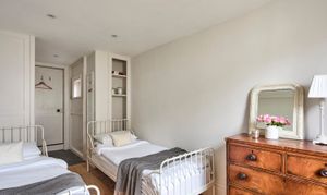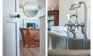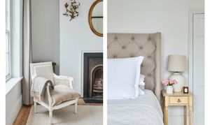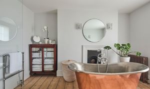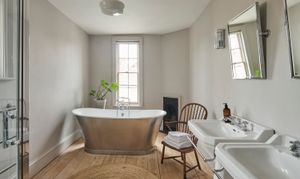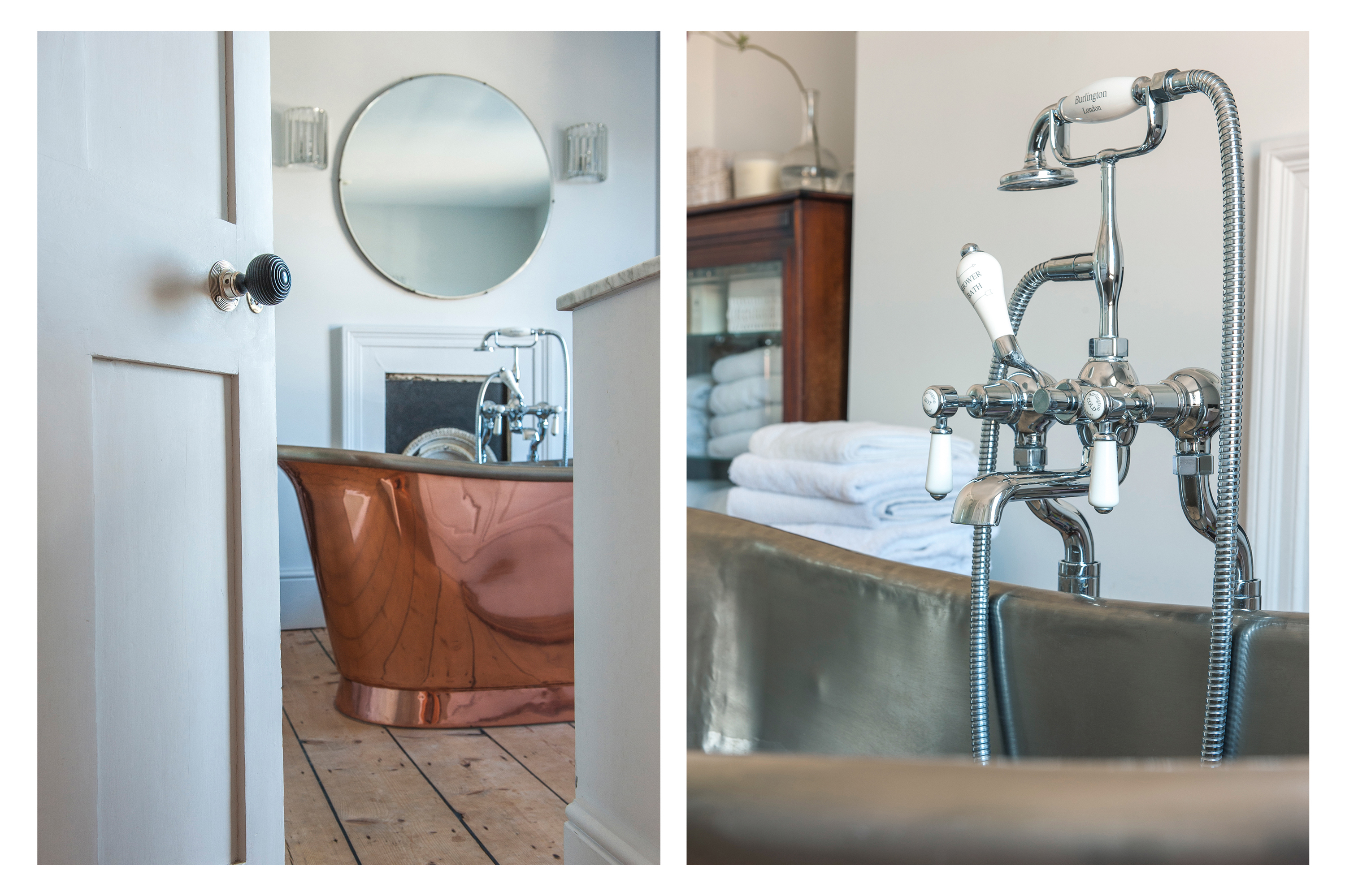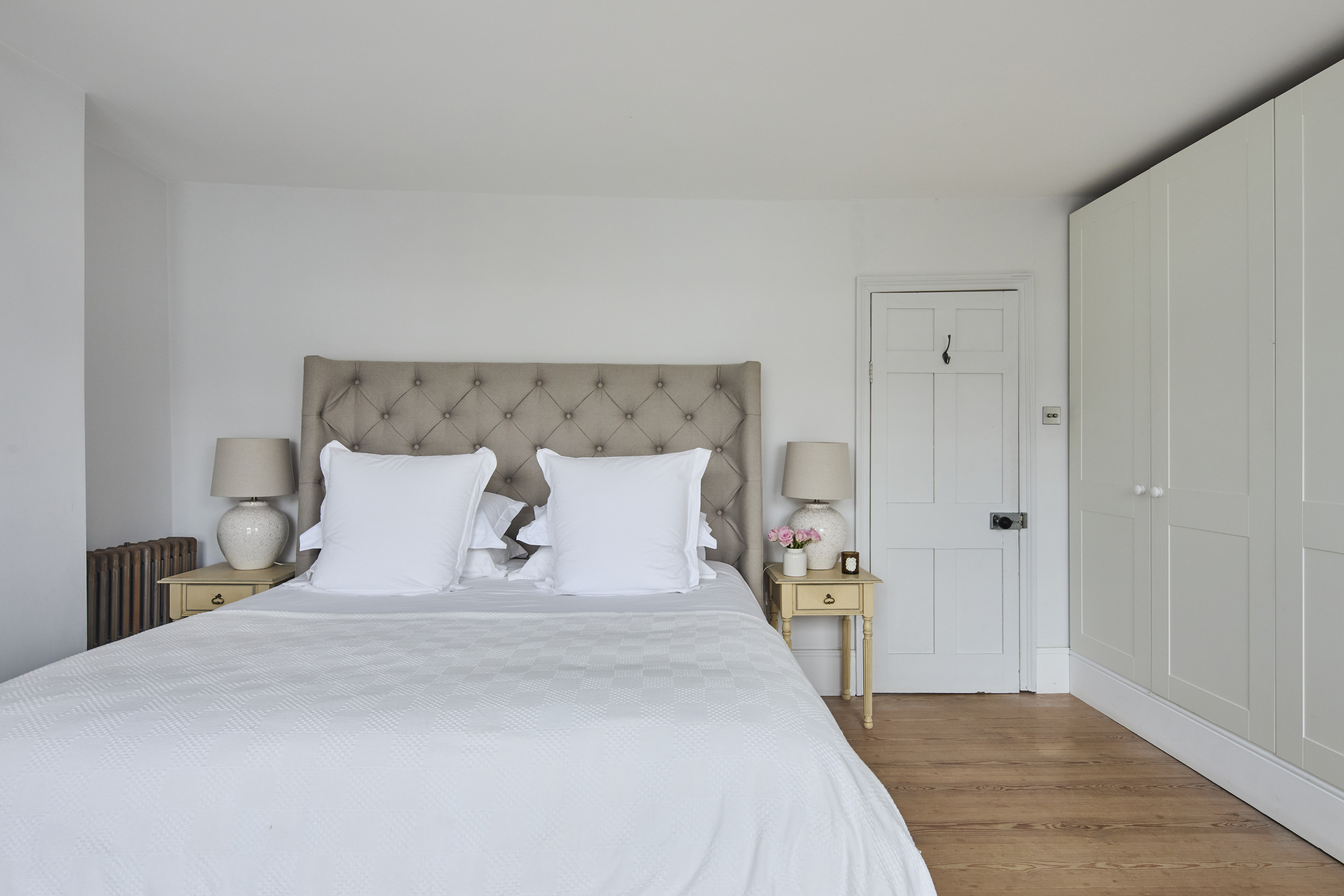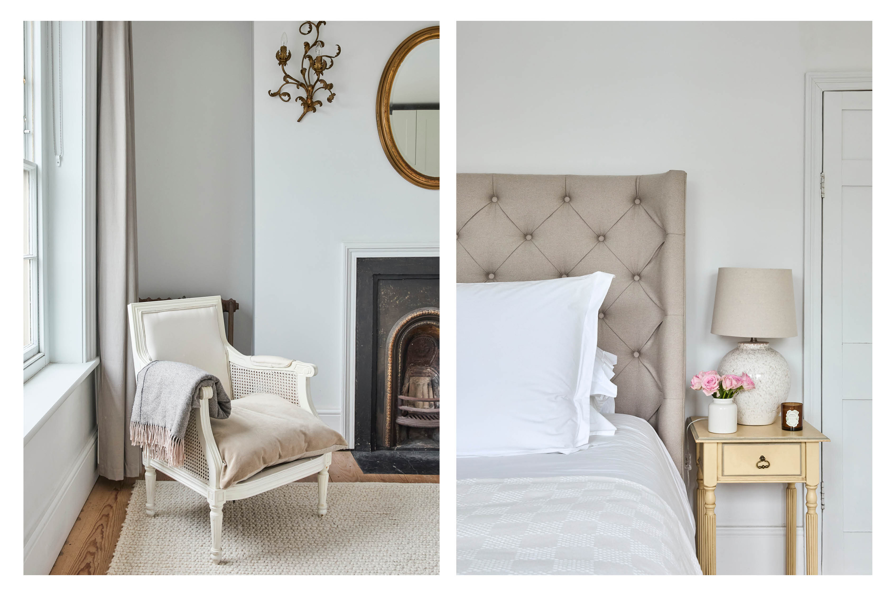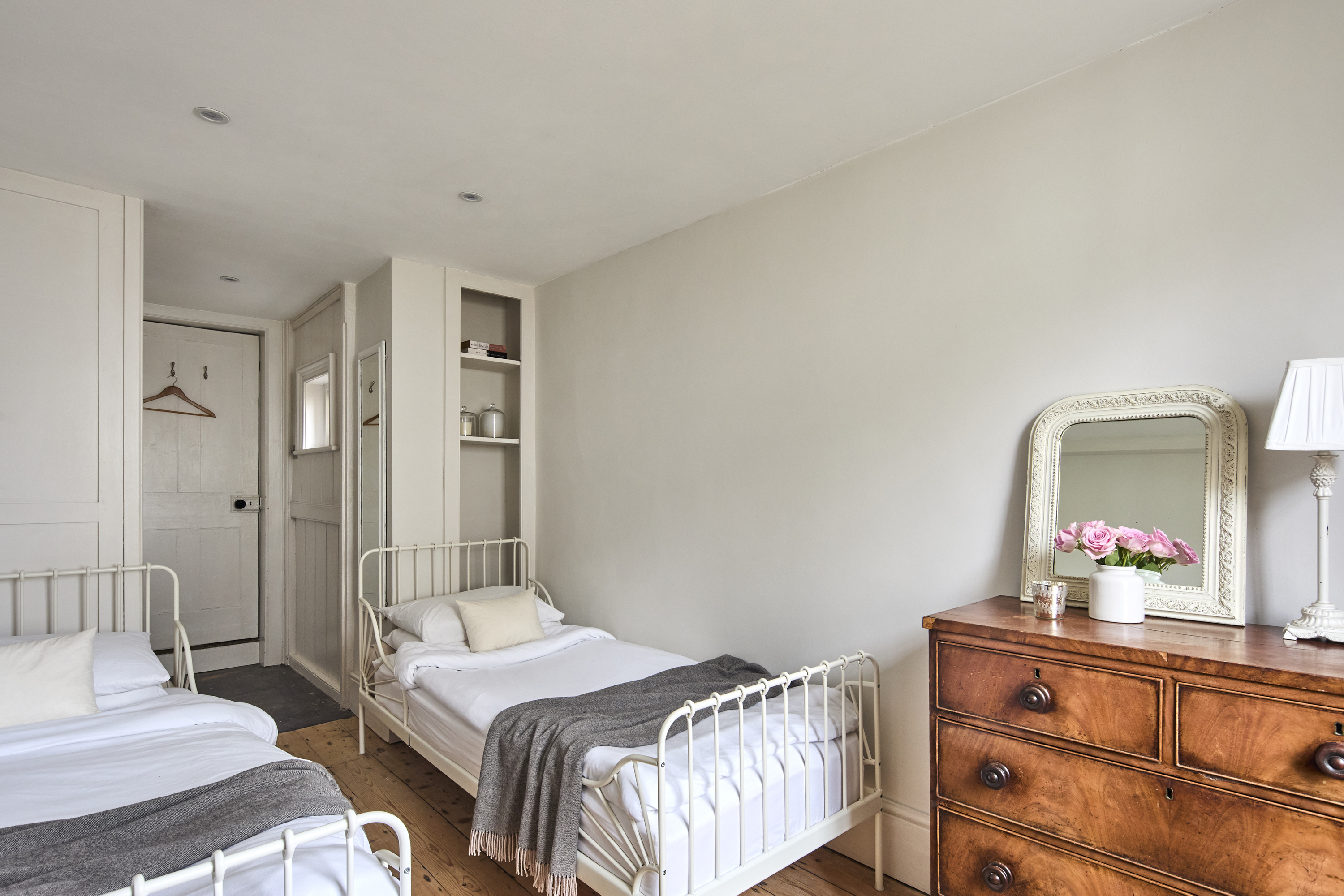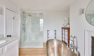 Each floor of the house has a distinct feel. The sizeable main bedroom, with its original fireplace, large windows, and fitted wardrobes, is paired with a lush bathroom with a copper bath, a walk-in shower finished in Carrara marble, and another original fireplace. Upstairs, high-ceilinged reception rooms and a balcony with Channel views provide the ideal retreat for afternoon tea or a relaxing sundowner, while the cosy bedrooms on the top floor exude charm and offer stunning views over the historic town and the sea.