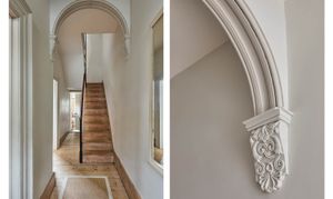 Throughout the home’s renovations, particular attention has been paid to the materials used to ensure historical accuracy while also allowing for breathability. For example, all the renders and stuccoes were recreated using hydraulic lime or Roman cement, as best suited to the restoration, and painted with breathable, historically accurate linseed oil paints. The lower-ground floor was stripped back to brickwork, rendered in lime, and then painted with natural, breathable paints.