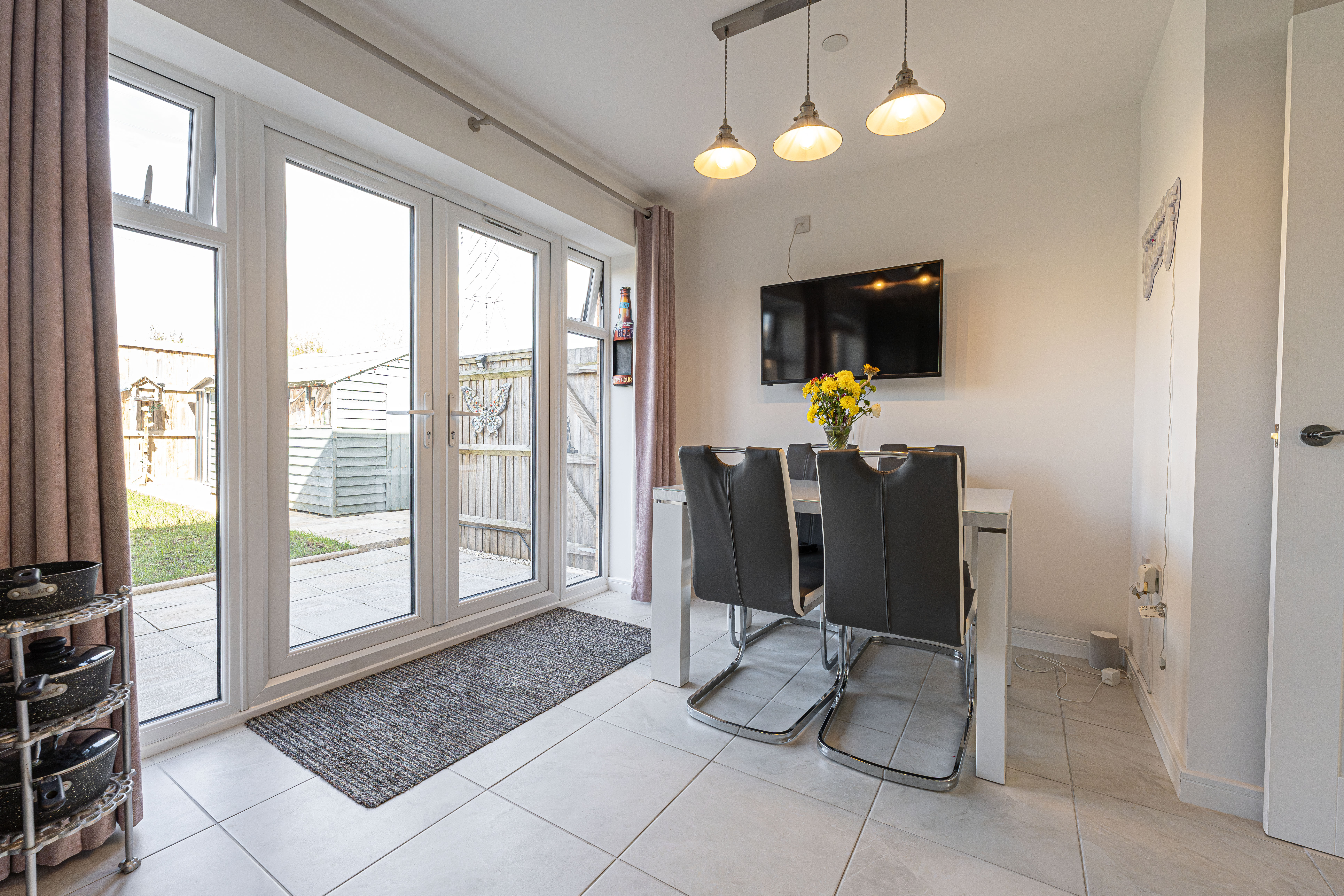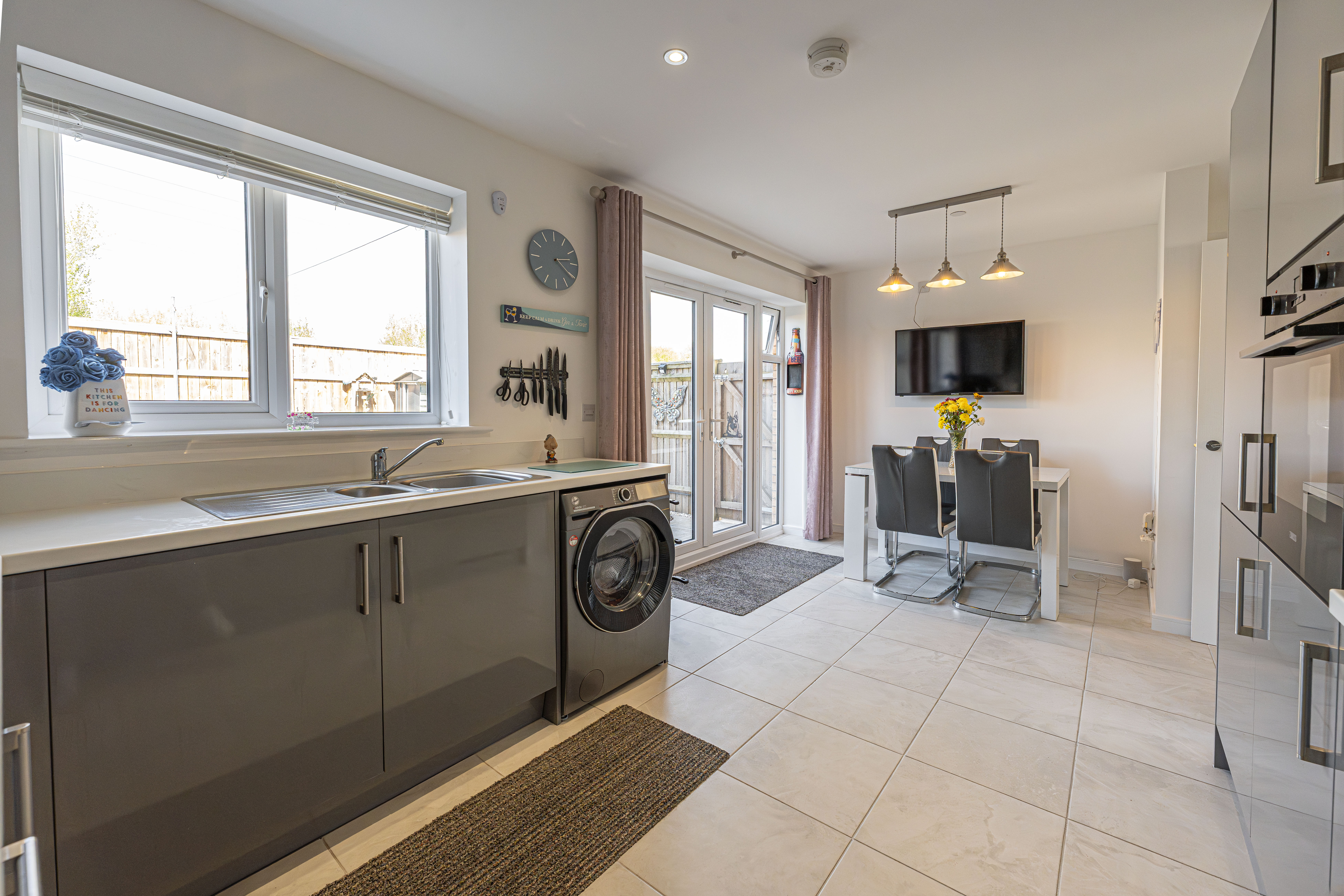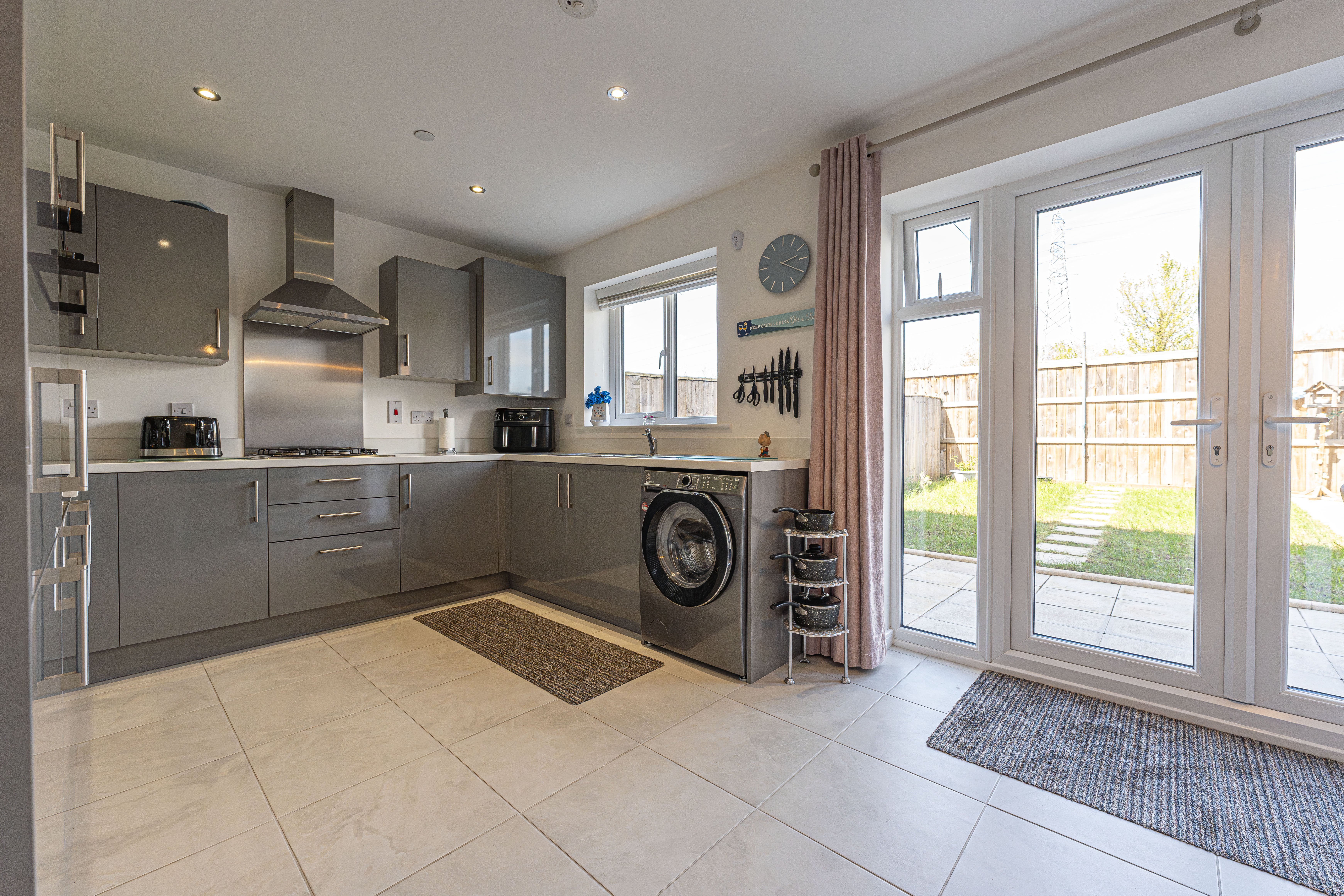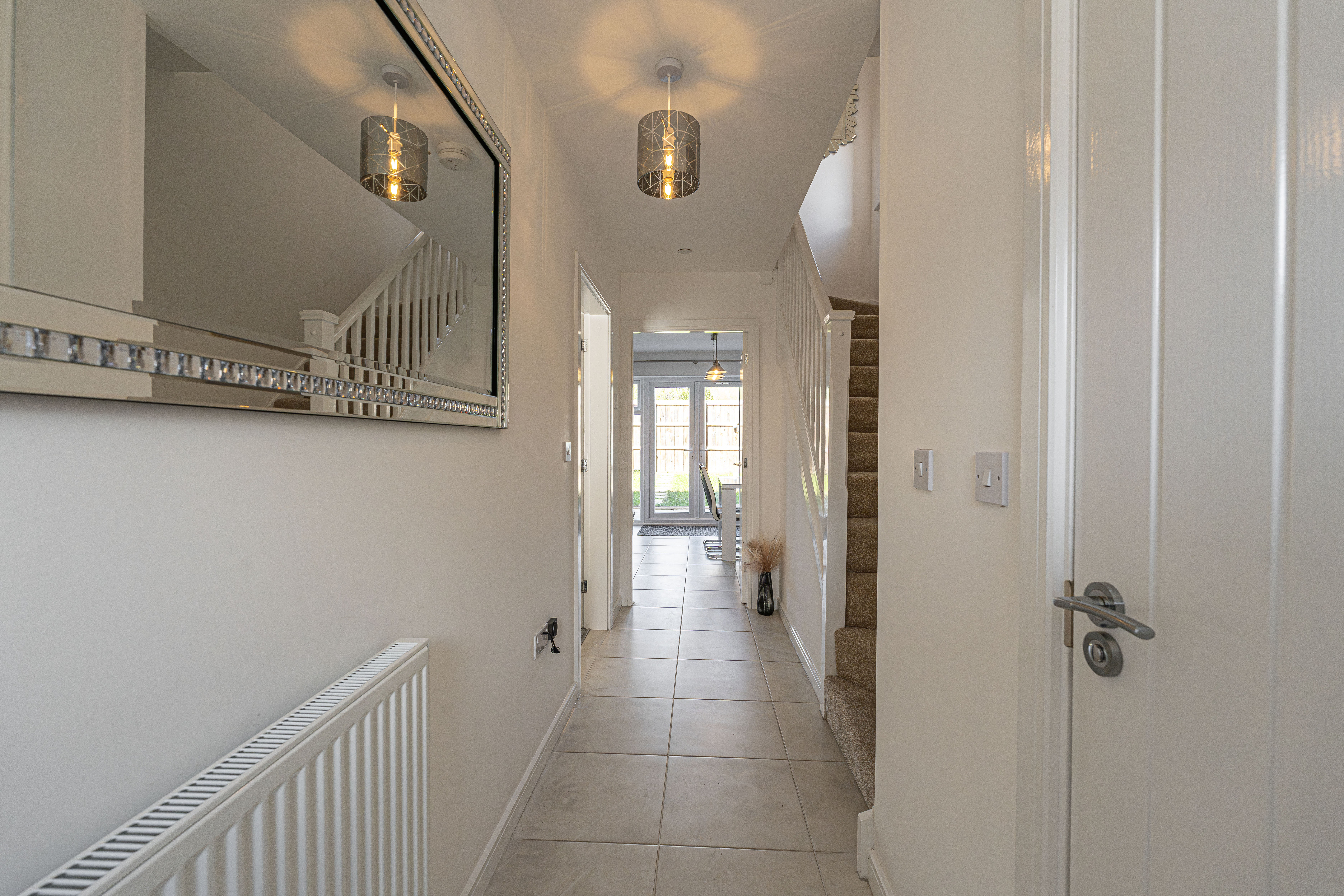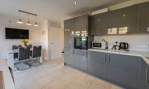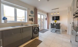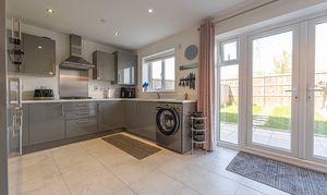 This incredible family home is presented to a beautiful standard throughout, and welcomes us in through the hallway and into an impressive living room, which is lit up by bay-fronted windows and highlights an ideal space for relaxing and entertaining. The property features a contemporary open plan kitchen and dining area to the rear of the house, complete with sleek high-gloss units offering ample storage options and several integrated appliances. Additional storage can be found with an understairs cupboard, while the dining area is lit up by pendant lighting and French doors that seamlessly open to the garden. From the hallway we can also find a W.C before ascending upstairs.
