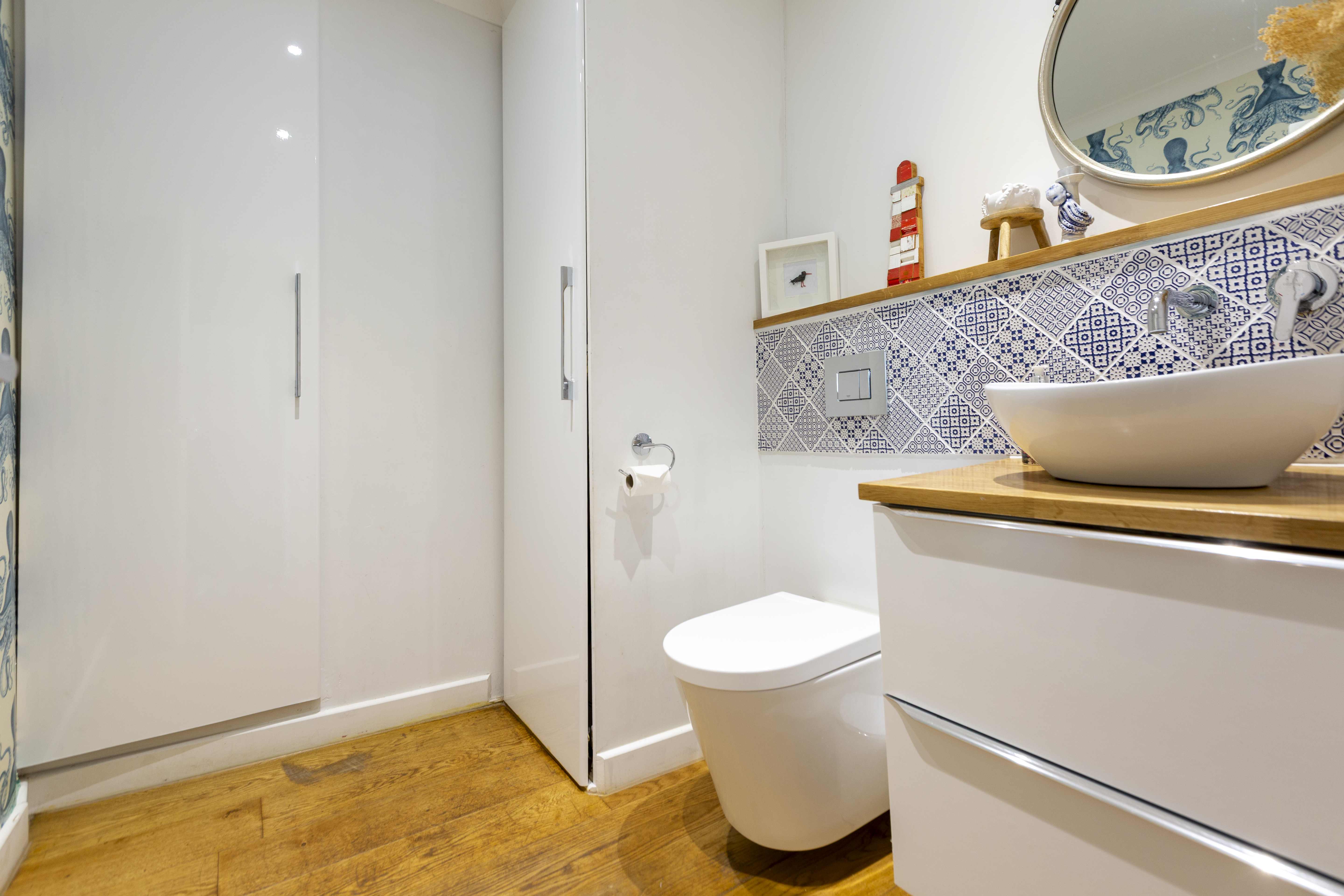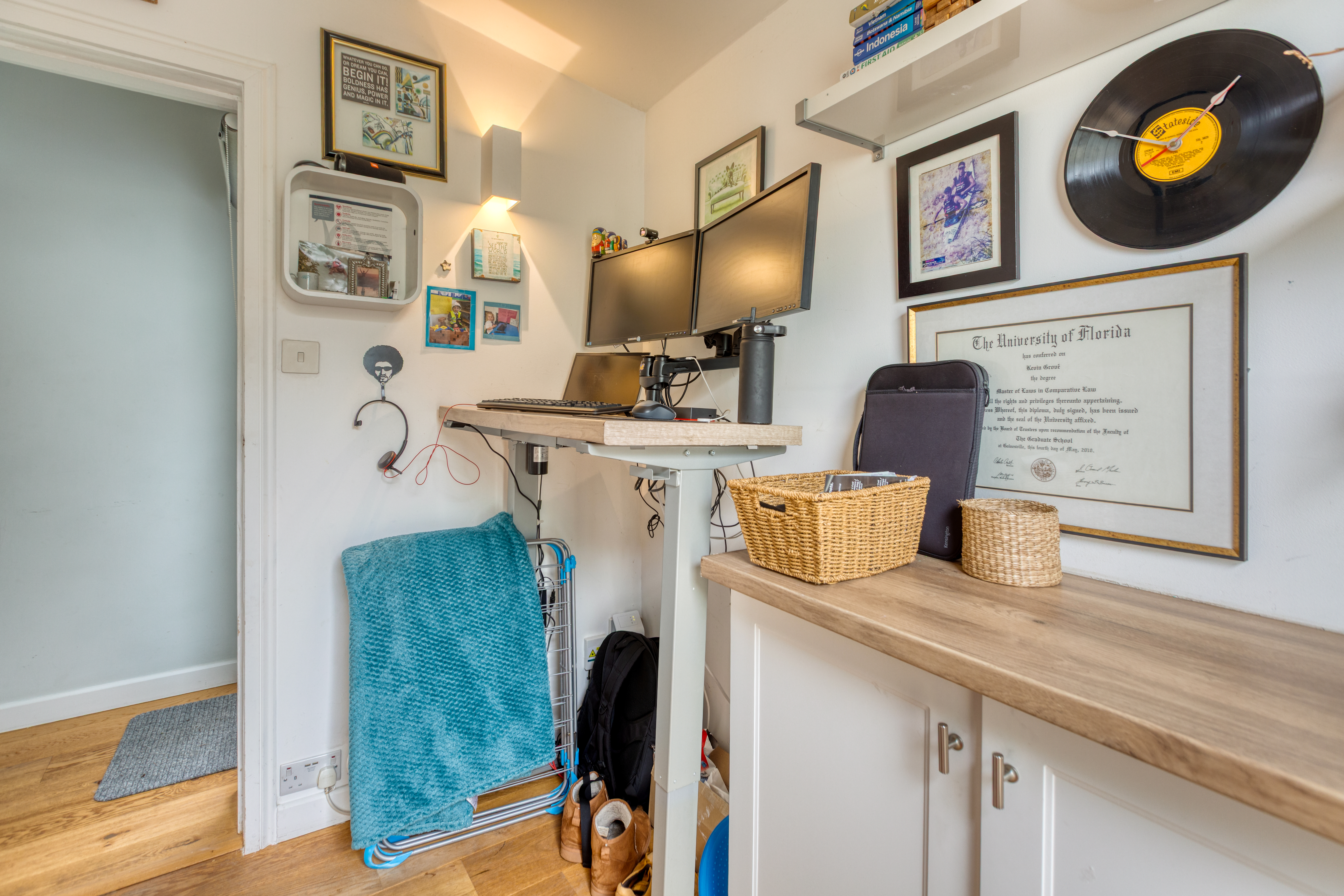Upstairs, there are three well-proportioned bedrooms and a study—ideal as a home office—with direct access to a sun terrace. A stylish four-piece family bathroom serves this floor.
