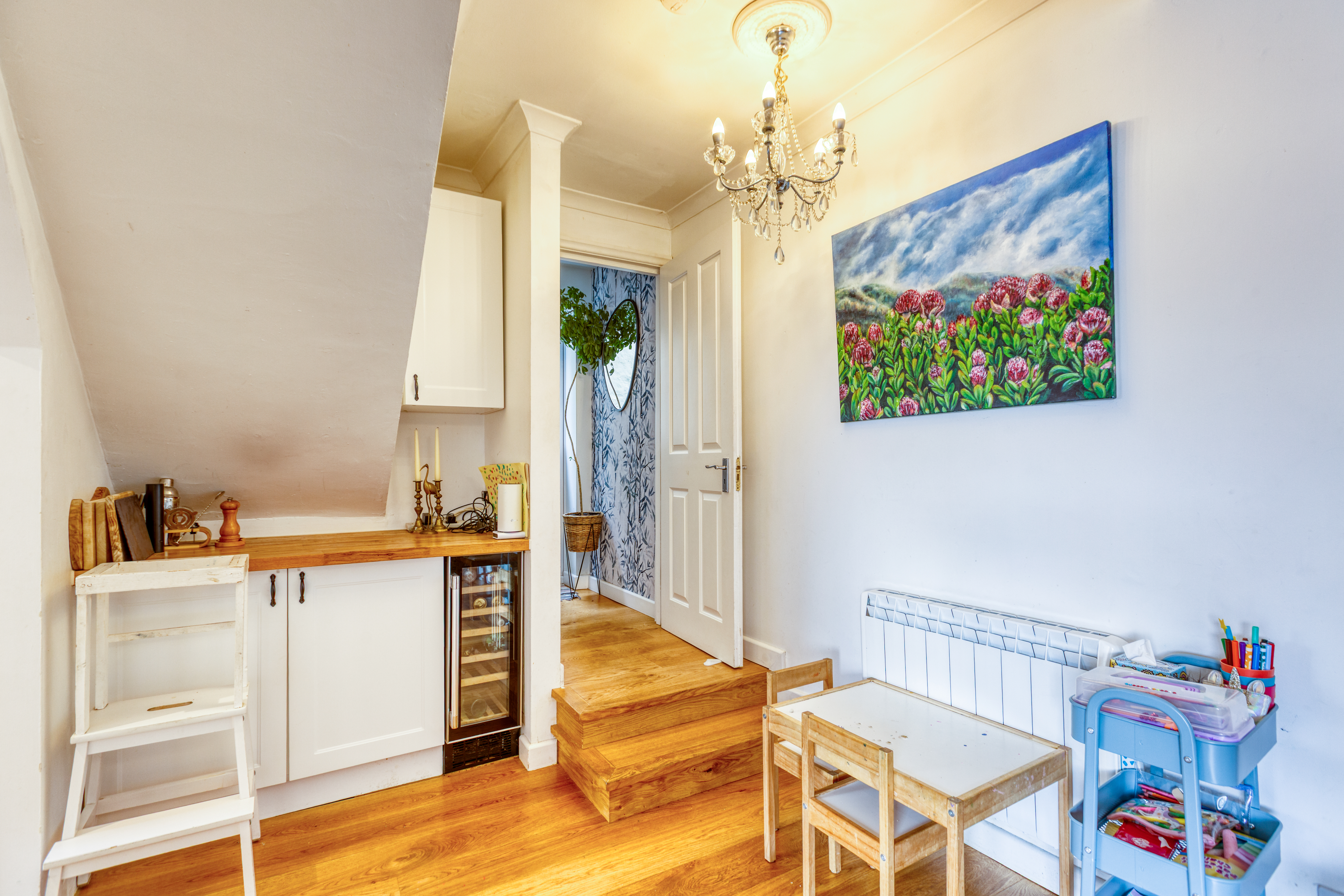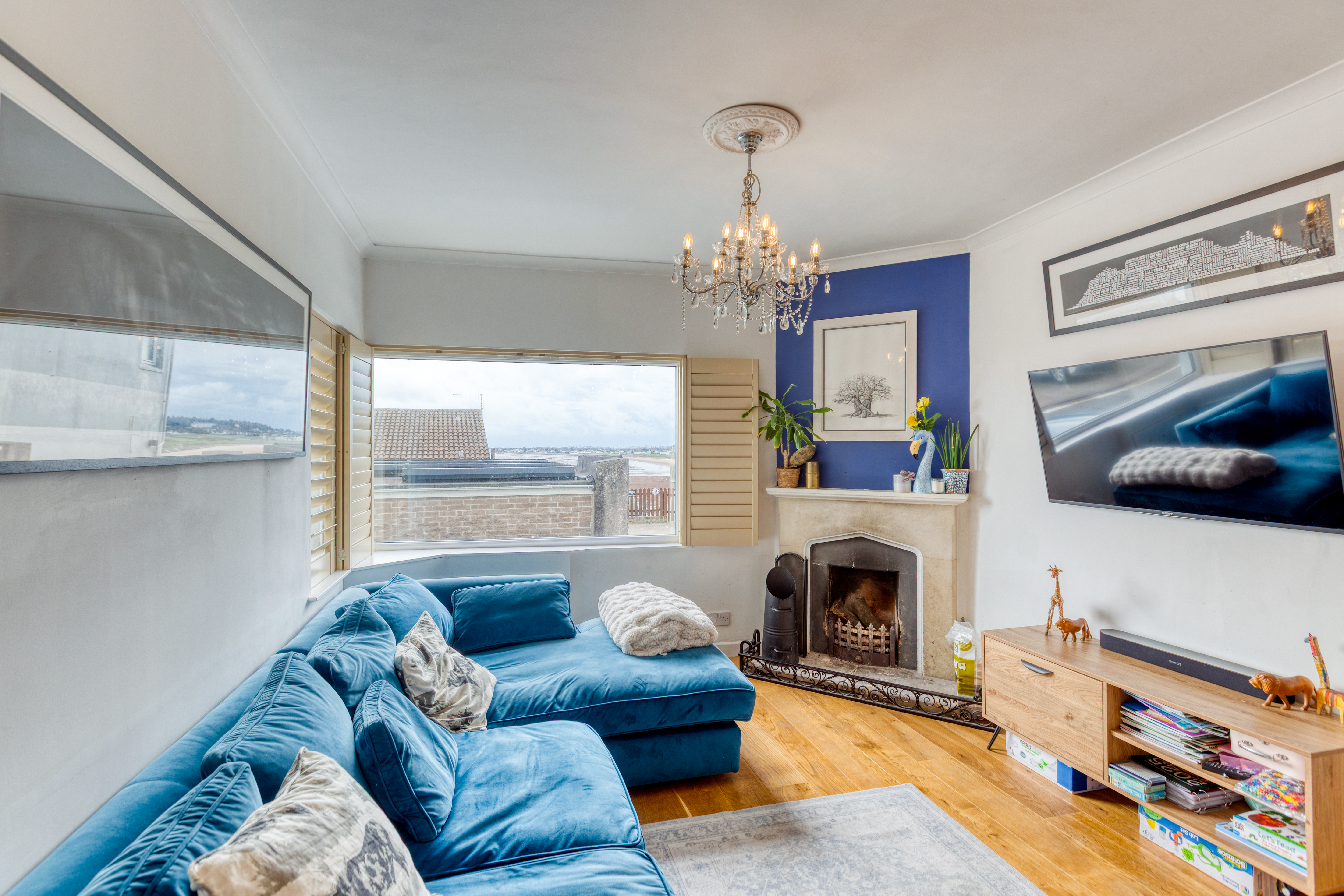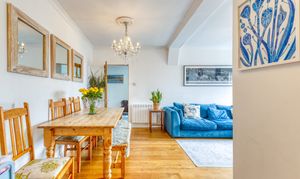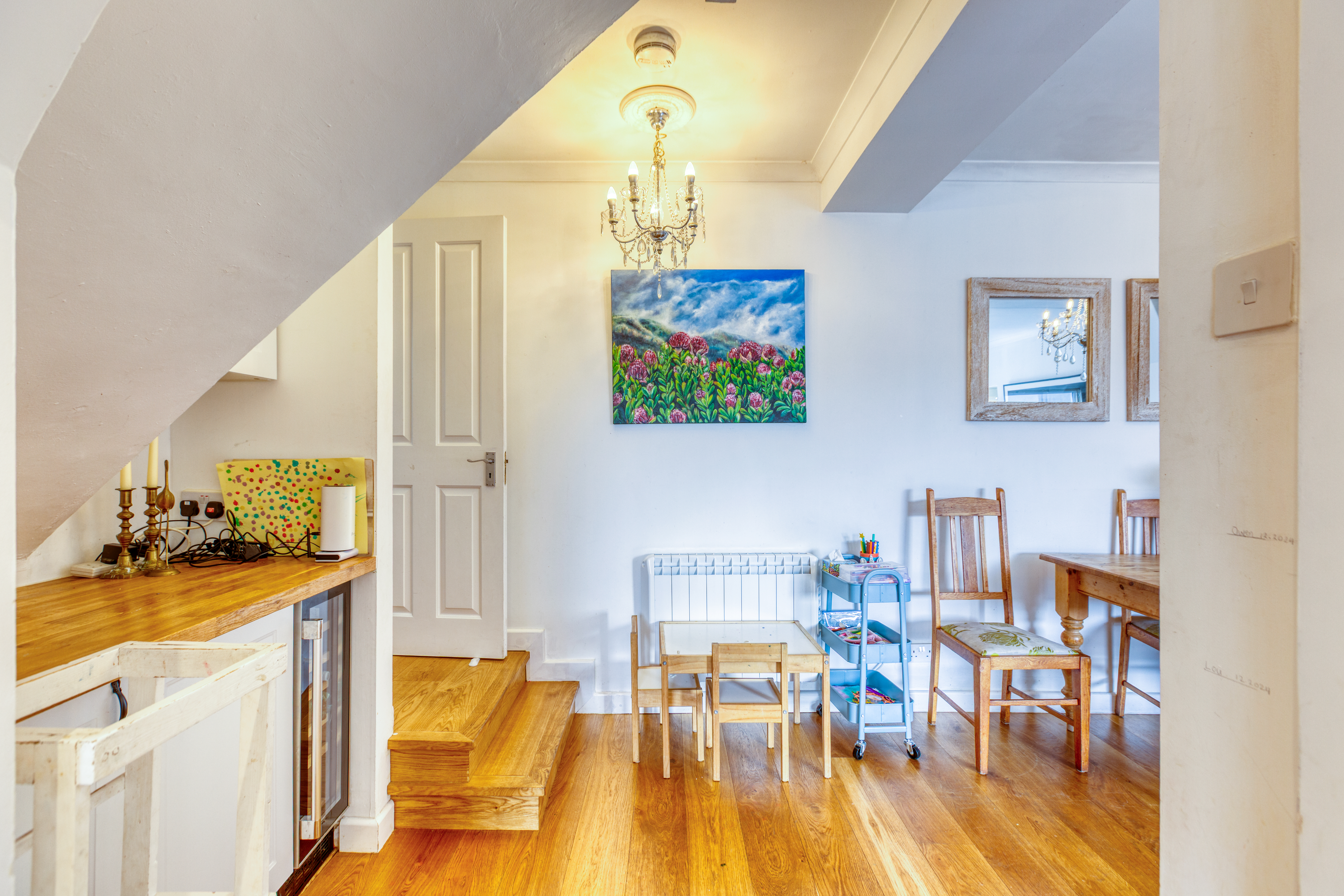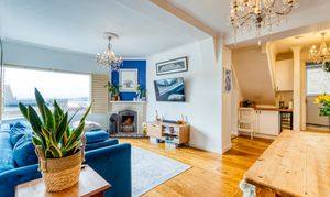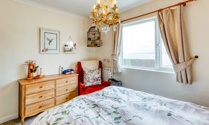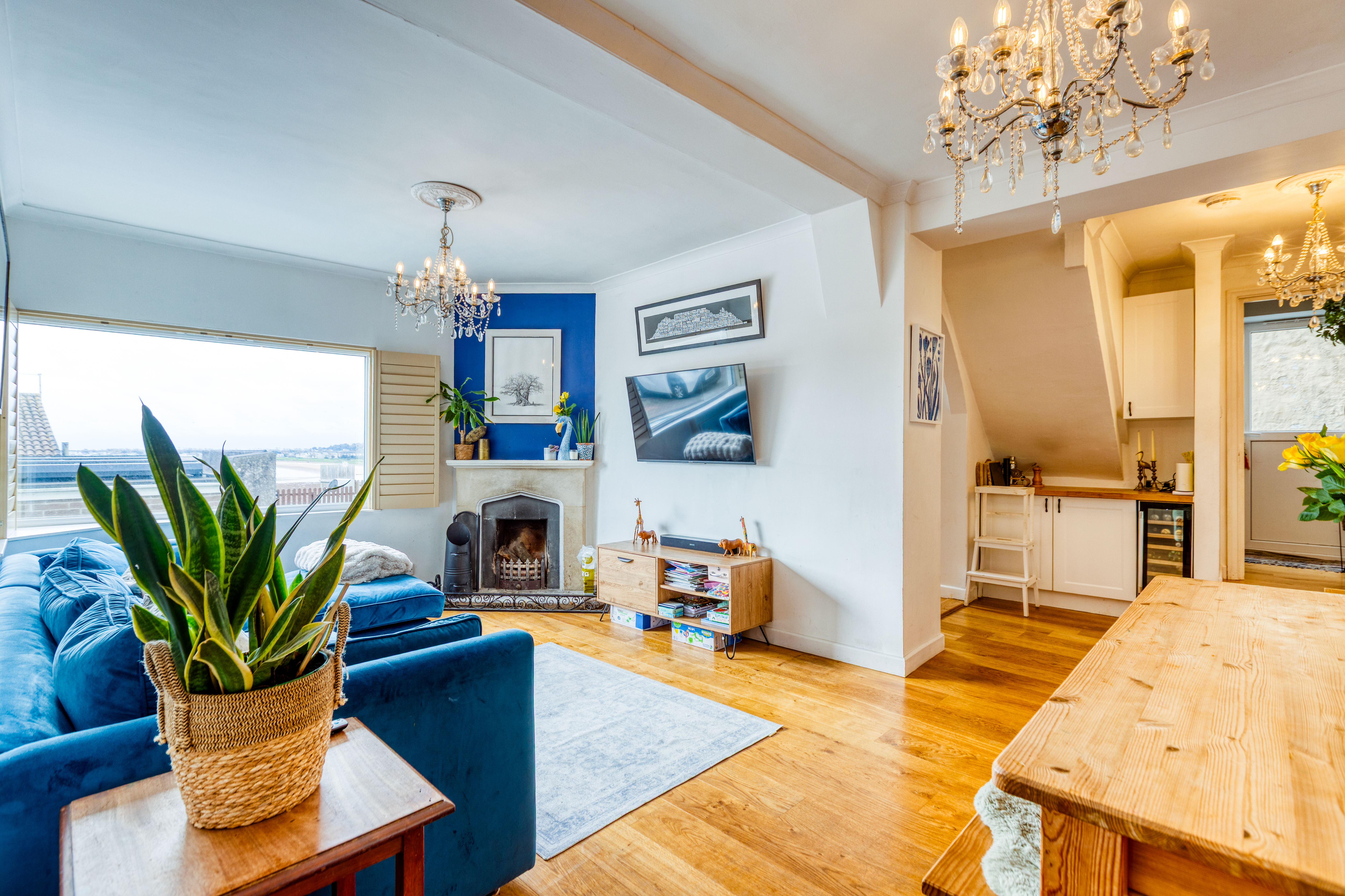 Upon entering the hallway, the ground floor features a spacious lounge and dining area with a working fireplace and picture windows framing the coastal outlook. The separate kitchen also benefits from sea views, while a convenient cloakroom completes this level. The current owners have carried out extensive renovations, thoughtfully updating the home while retaining its period charm.