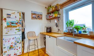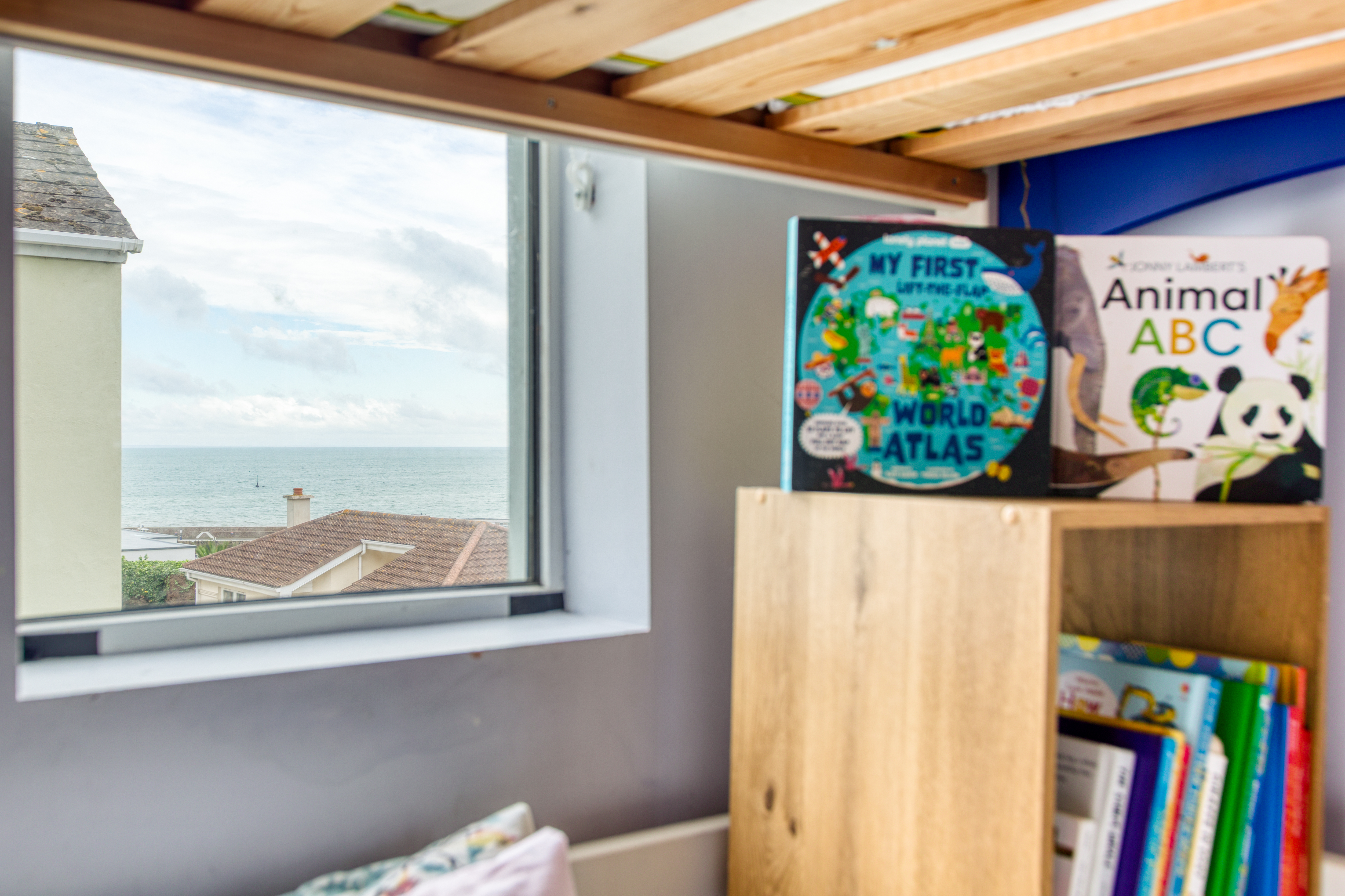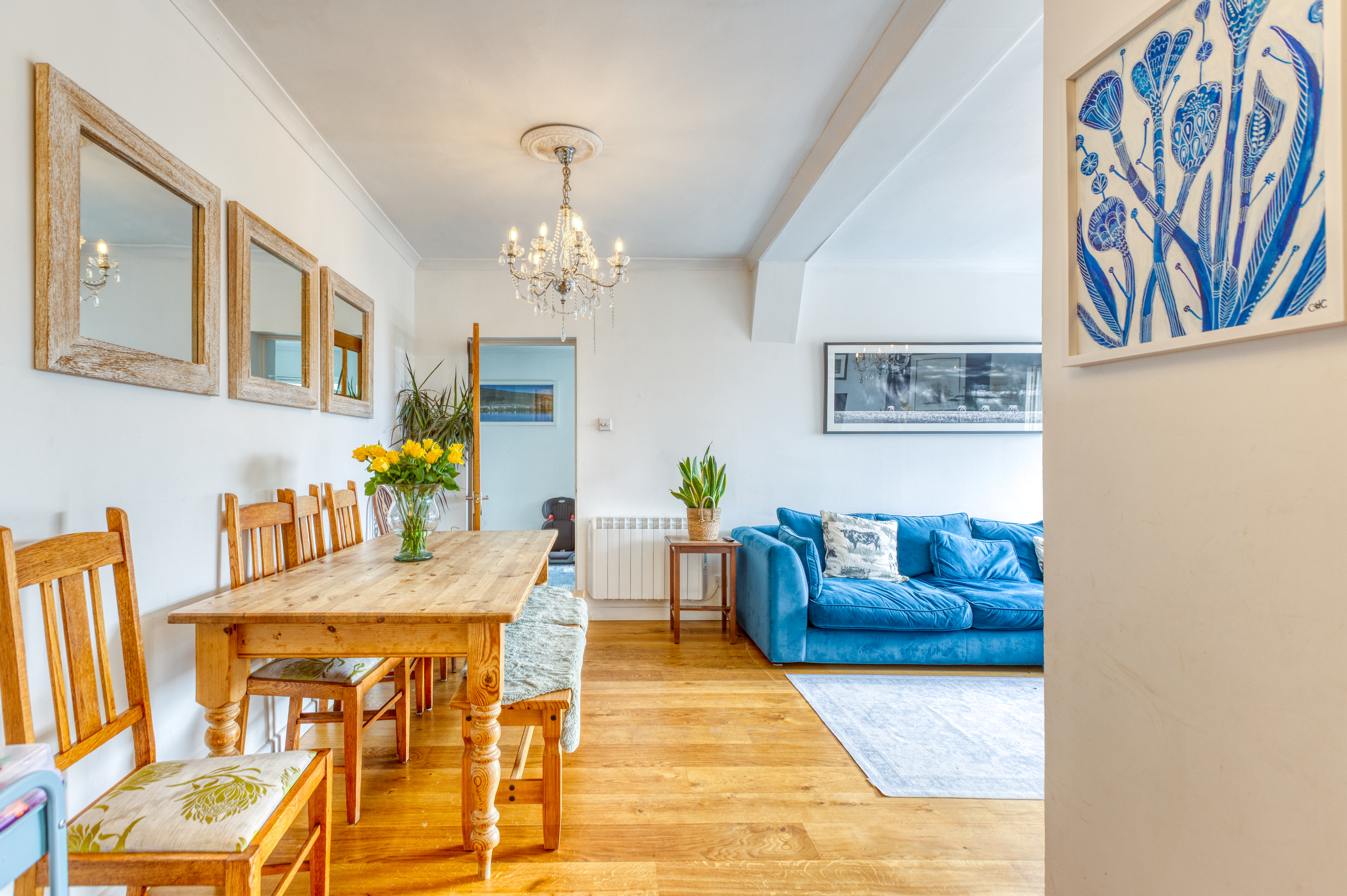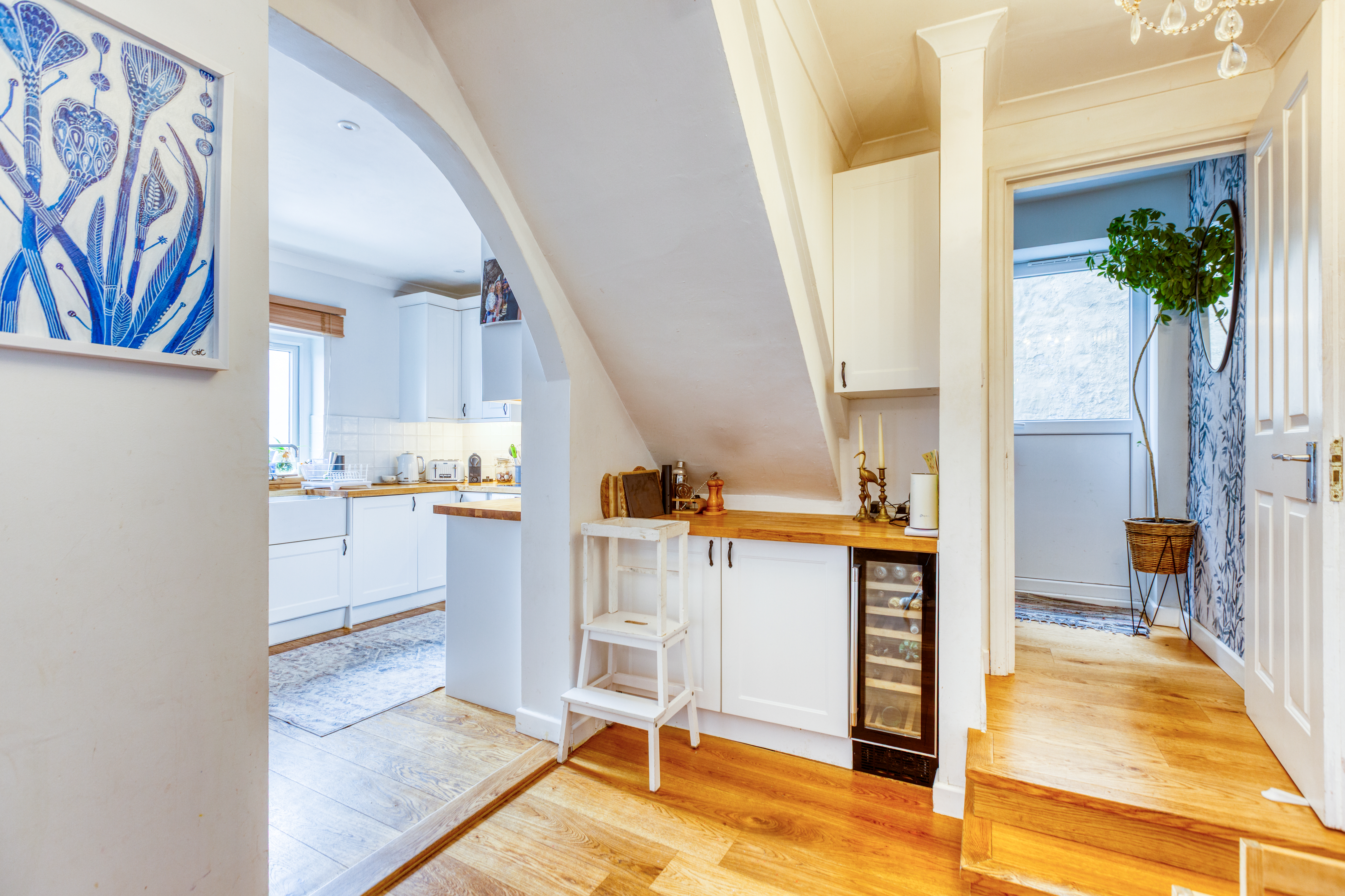 Upon entering the hallway, the ground floor features a spacious lounge and dining area with a working fireplace and picture windows framing the coastal outlook. The separate kitchen also benefits from sea views, while a convenient cloakroom completes this level. The current owners have carried out extensive renovations, thoughtfully updating the home while retaining its period charm.