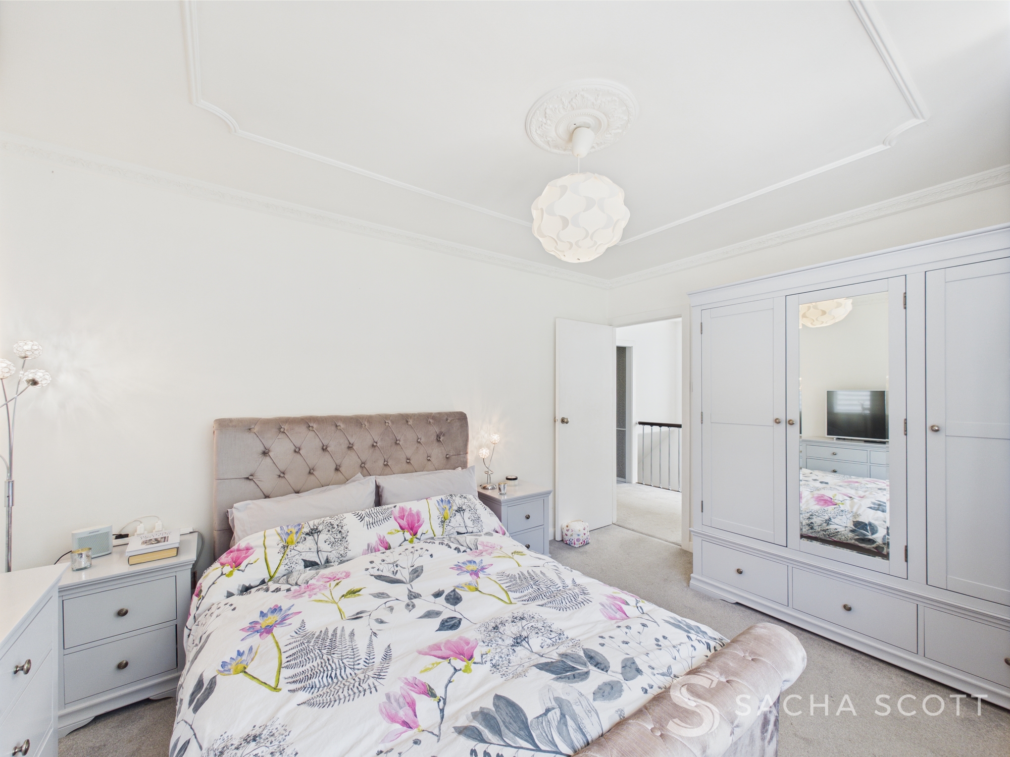 Neutrally presented, the primary bedroom is generous in size and offers thick grey carpet and views over the rear garden and Mole Valley beyond.
