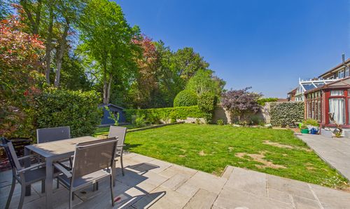 This secluded, sunny garden backs onto fields and a conservation area of woodland. Offering a generous sized patio area for entertaining, this gorgeous west facing garden is ideal for sun lovers. Measuring aprpox 95 x 45ft, the garden goes on to provide a large lawned area, a log cabin and two sheds. There are also external sockets, lighting and a tap.