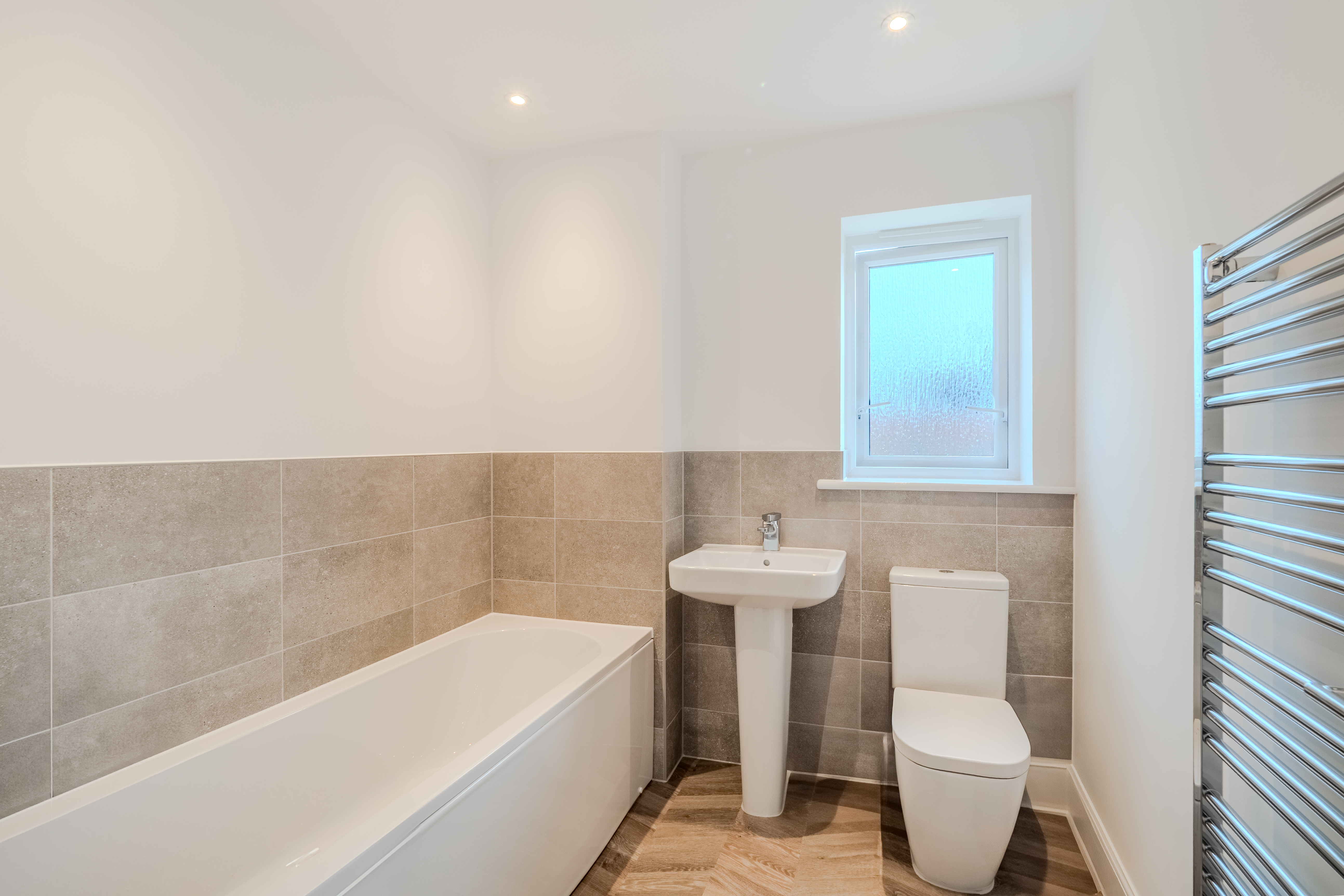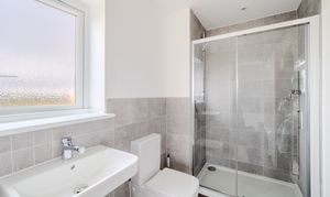 Upstairs, the generous landing leads to five well appointed bedrooms. Three of the bedrooms are spacious doubles, each benefitting from their own en-suite shower room, complete with shower, WC, and sink, as well as fitted wardrobes—ideal for guests, older children, or multigenerational living. The remaining two bedrooms, both of good size, are served by a stylish and contemporary family bathroom featuring a bath, WC, and basin—perfect for a relaxing soak at the end of the day. An airing cupboard on the landing offers additional practical storage space.