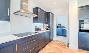 From the moment you step inside, the sense of space and natural light is immediately apparent. The welcoming entrance hall leads to a beautifully proportioned sitting room on the left, featuring a bay window and an additional side window, creating a bright and airy atmosphere, ideal for relaxing with family or entertaining guests. On the opposite side of the hall, a second bay-fronted reception room offers further versatility. With dual aspect windows, this room could easily serve as a formal dining room, second lounge, playroom, or even a snug, depending on your needs. To the rear of the property, the spacious kitchen/family room is the true heart of the home. Designed with both functionality and style in mind, it features Caesarstone quartz worktops, a range of integrated appliances including a dishwasher and fridge freezer, Neff slide-and-hide ovens, and a large induction hob. There’s ample space for both dining and relaxed seating, making it a perfect space for everyday life and entertaining. Bi-fold doors open directly onto the garden, allowing for seamless indoor outdoor living during warmer months. Just off the kitchen is a dedicated study, with a window overlooking the rear garden, perfect for those working from home. A separate utility room houses a built in washing machine and provides access to the driveway. A downstairs cloakroom and a useful under stairs cupboard for coats and shoes complete the ground floor.