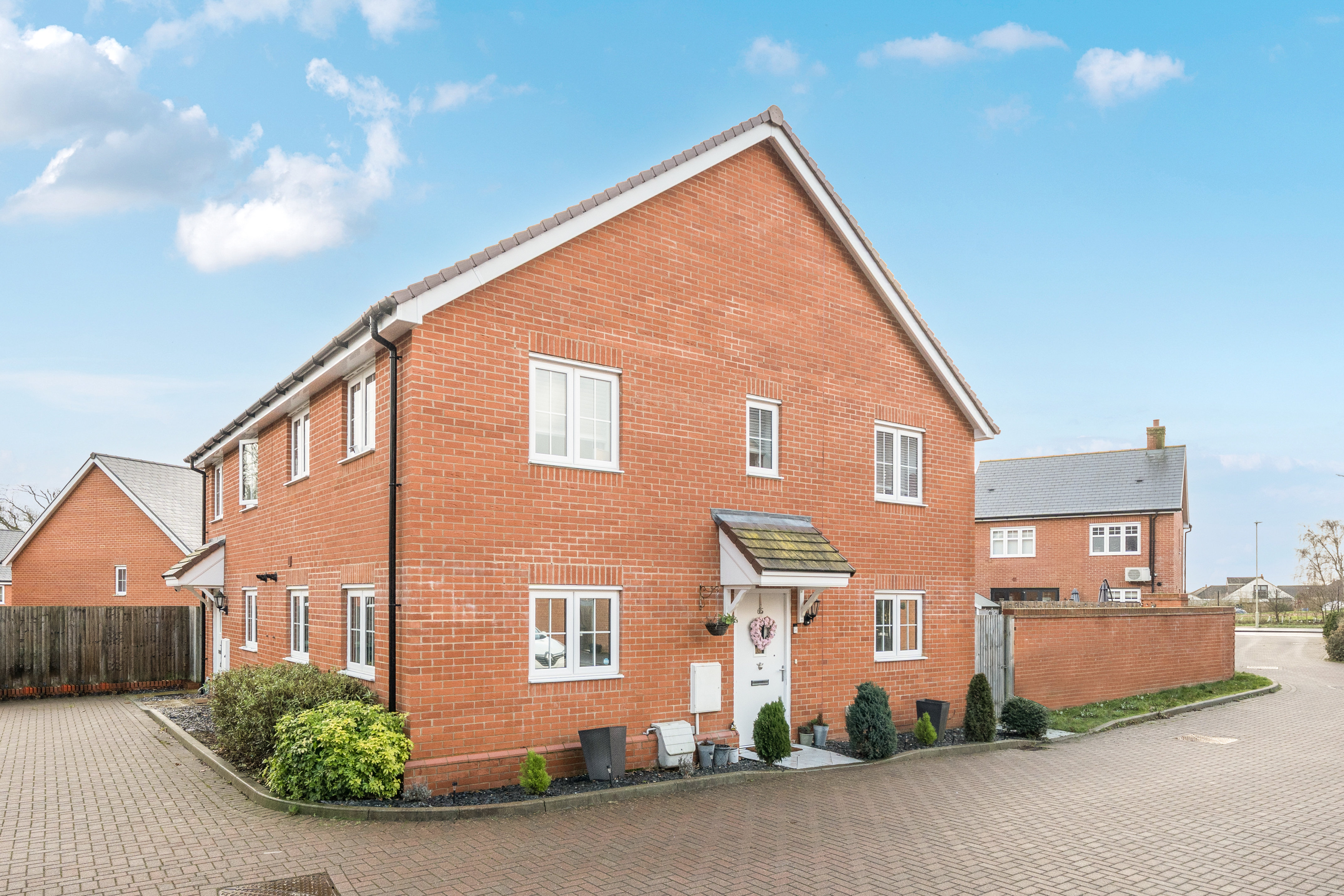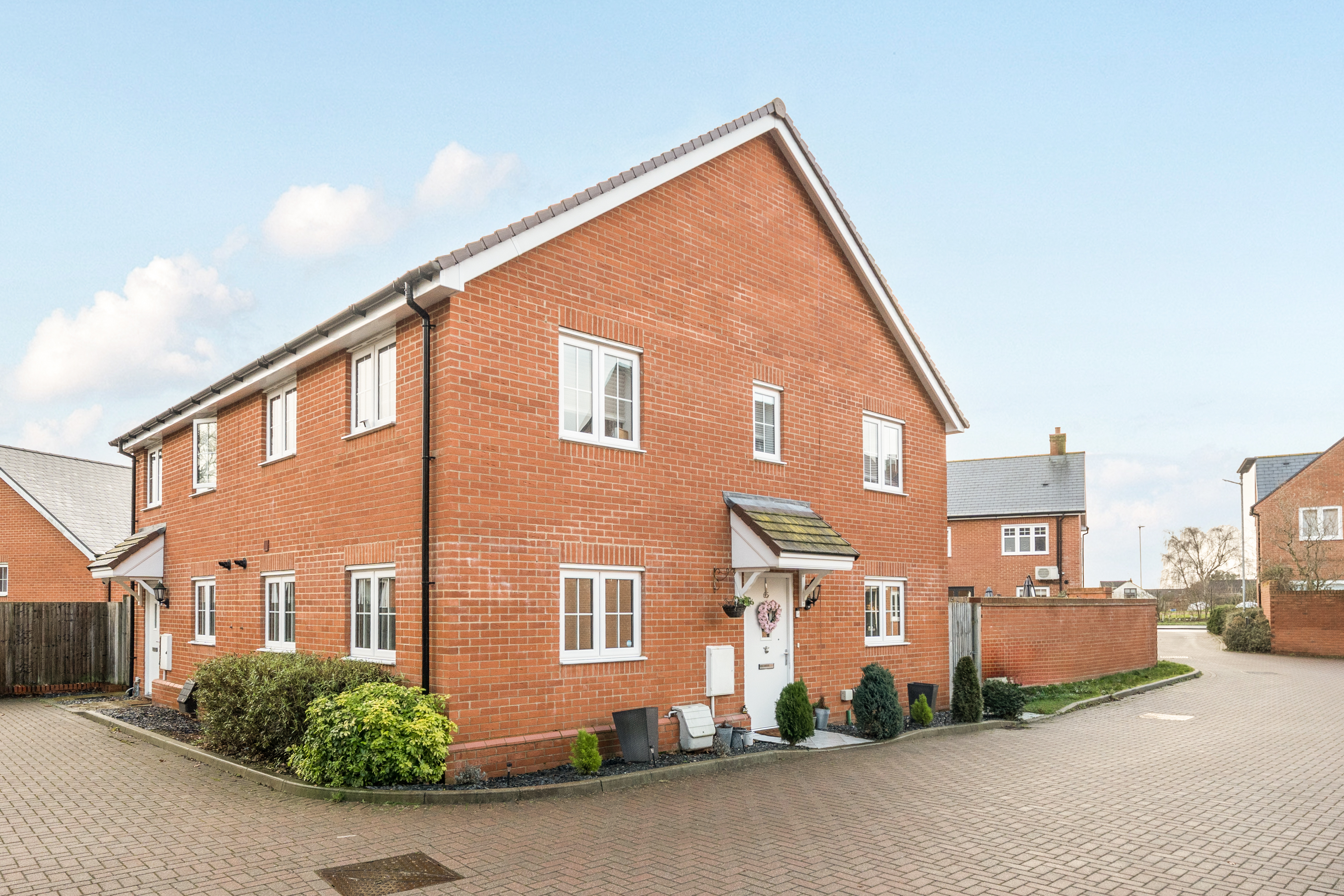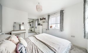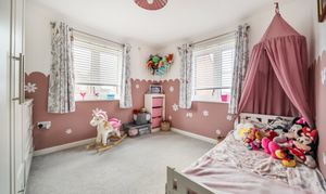 Upstairs, the first floor offers two generous double bedrooms. The main bedroom features a dressing area with built-in wardrobes and windows to the front and side elevations. The second double bedroom also enjoys dual-aspect windows, allowing plenty of natural light. The third bedroom is a versatile space, well suited as a home office, nursery, guest room, or child’s bedroom.