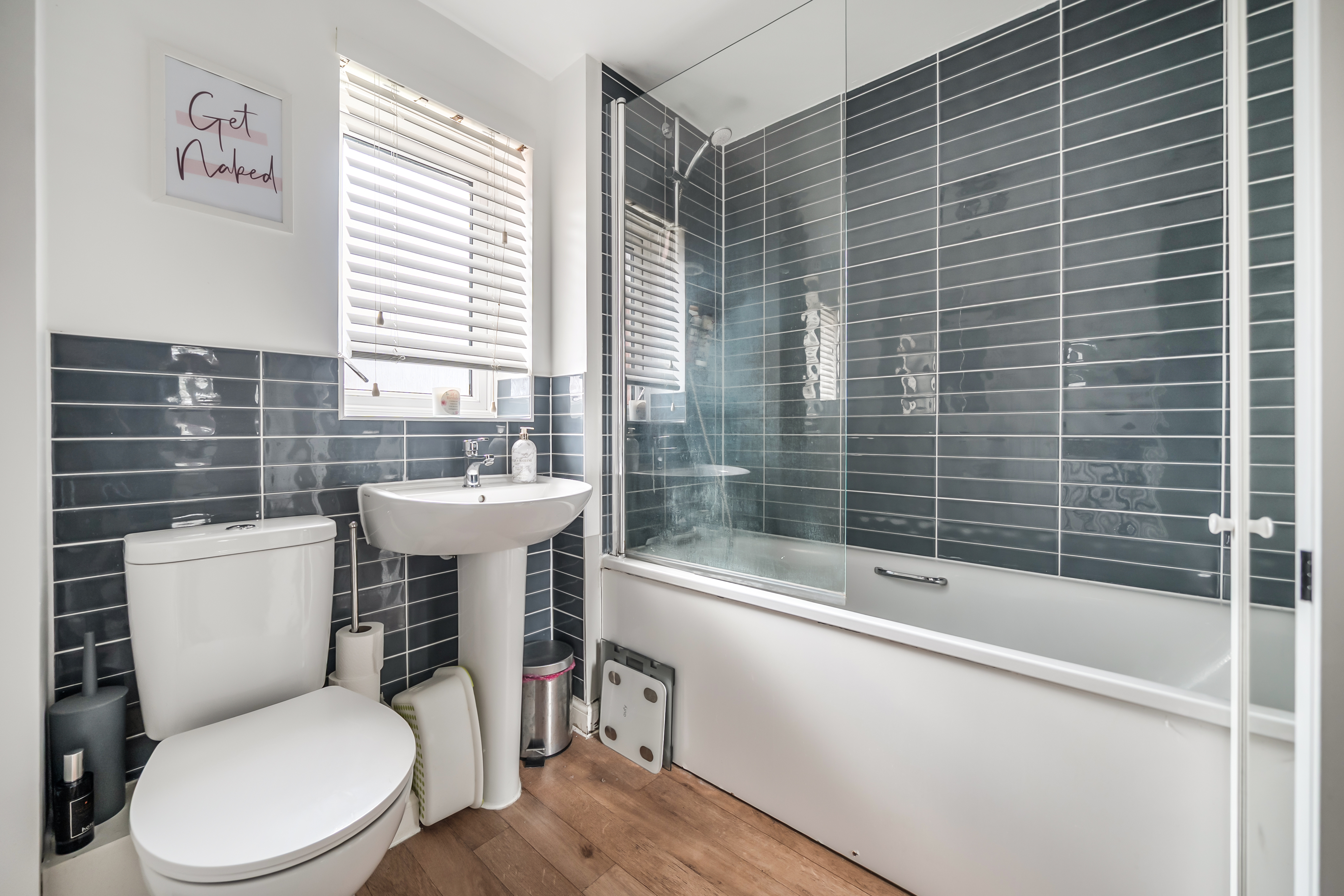 The family bathroom is neatly finished and comprises a bath with shower attachment and glass screen, WC, tiled walls, and a window to the side elevation.