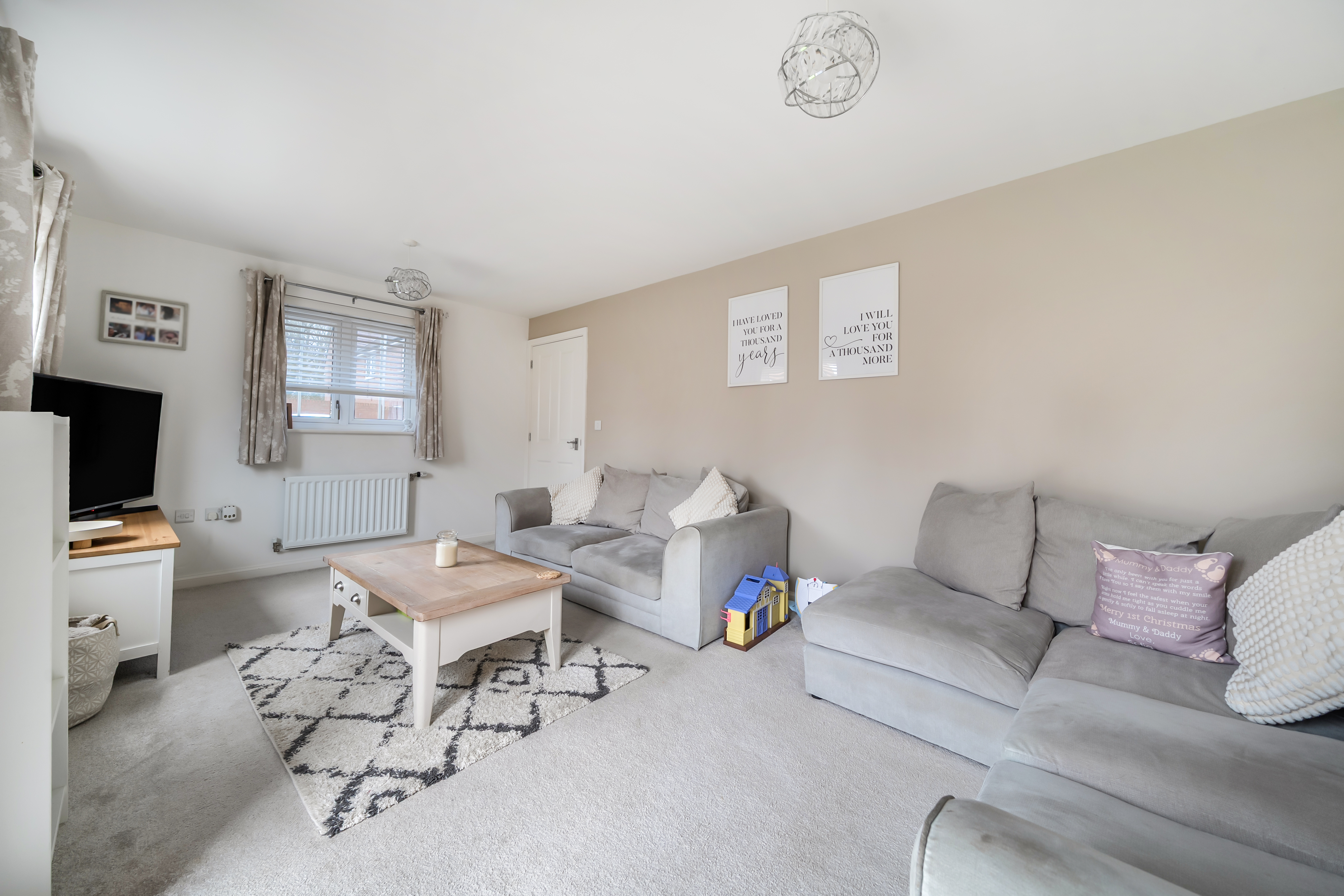 The living room is light and inviting, with windows to the front and side elevations and French doors opening onto the garden, making it an ideal space to relax or spend time with family.