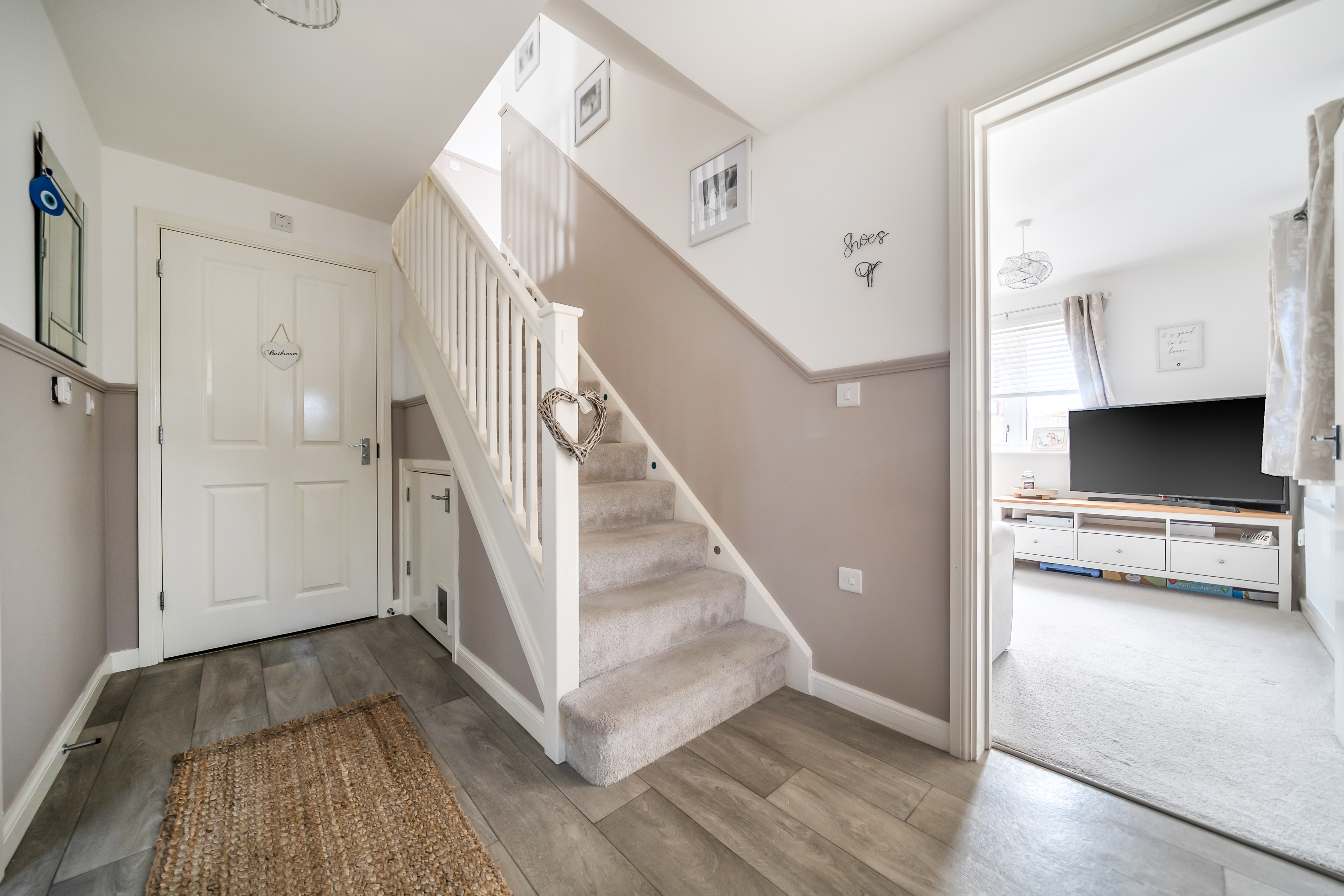 The ground floor welcomes you with a practical entrance hall, leading to a spacious kitchen diner on one side and a comfortable living room on the other. The kitchen diner is well arranged with a range of wall and base units, complemented by natural wood-effect work surfaces and white tiled splashbacks. It includes a stainless steel sink with drainer, an electric oven with gas hob and extractor hood, and space for a washer dryer and fridge freezer. The dining area enjoys windows to both the front and side elevations, creating a bright and sociable space for everyday meals or entertaining.