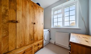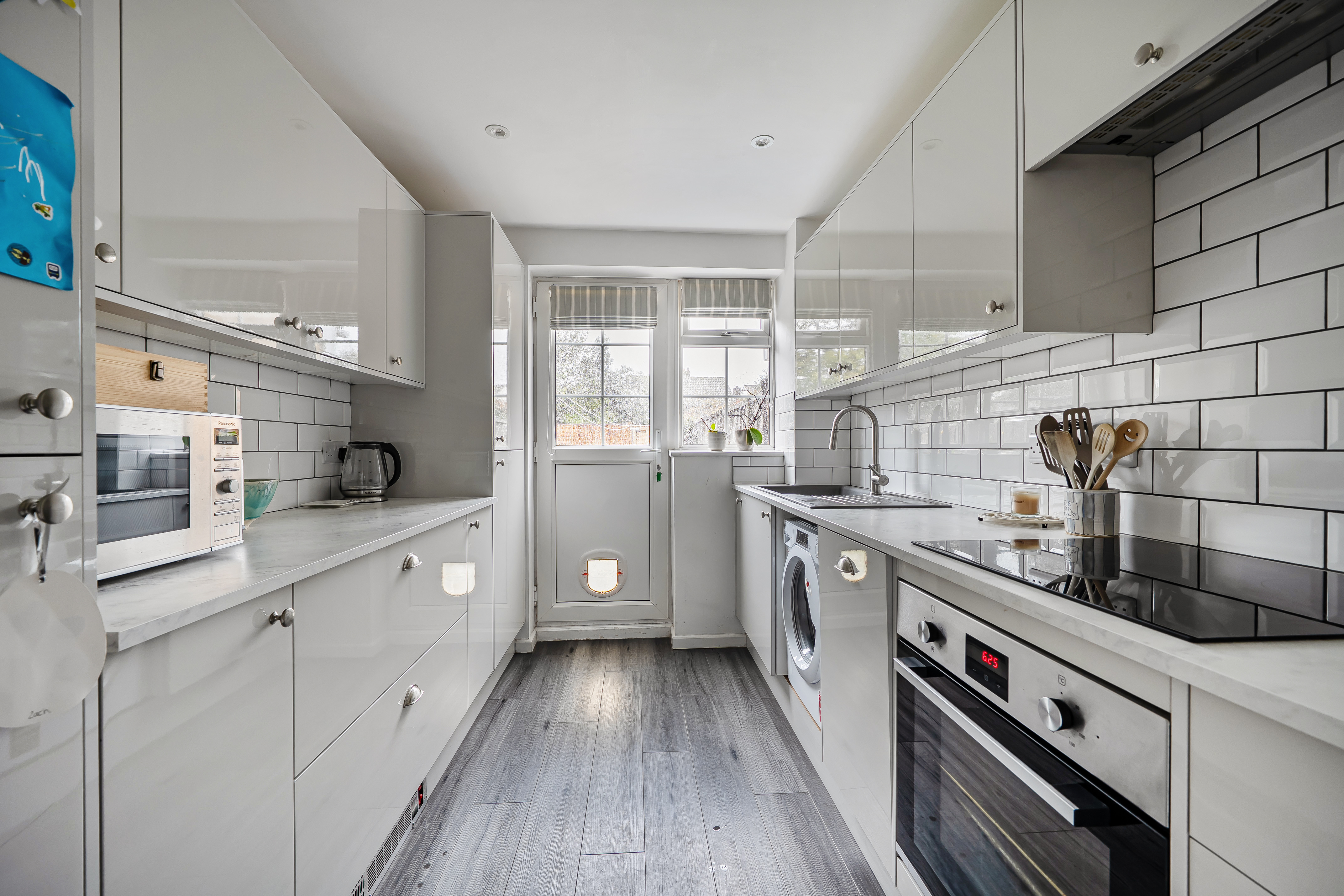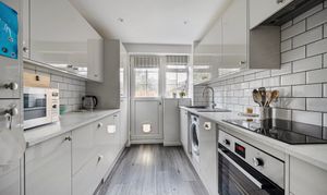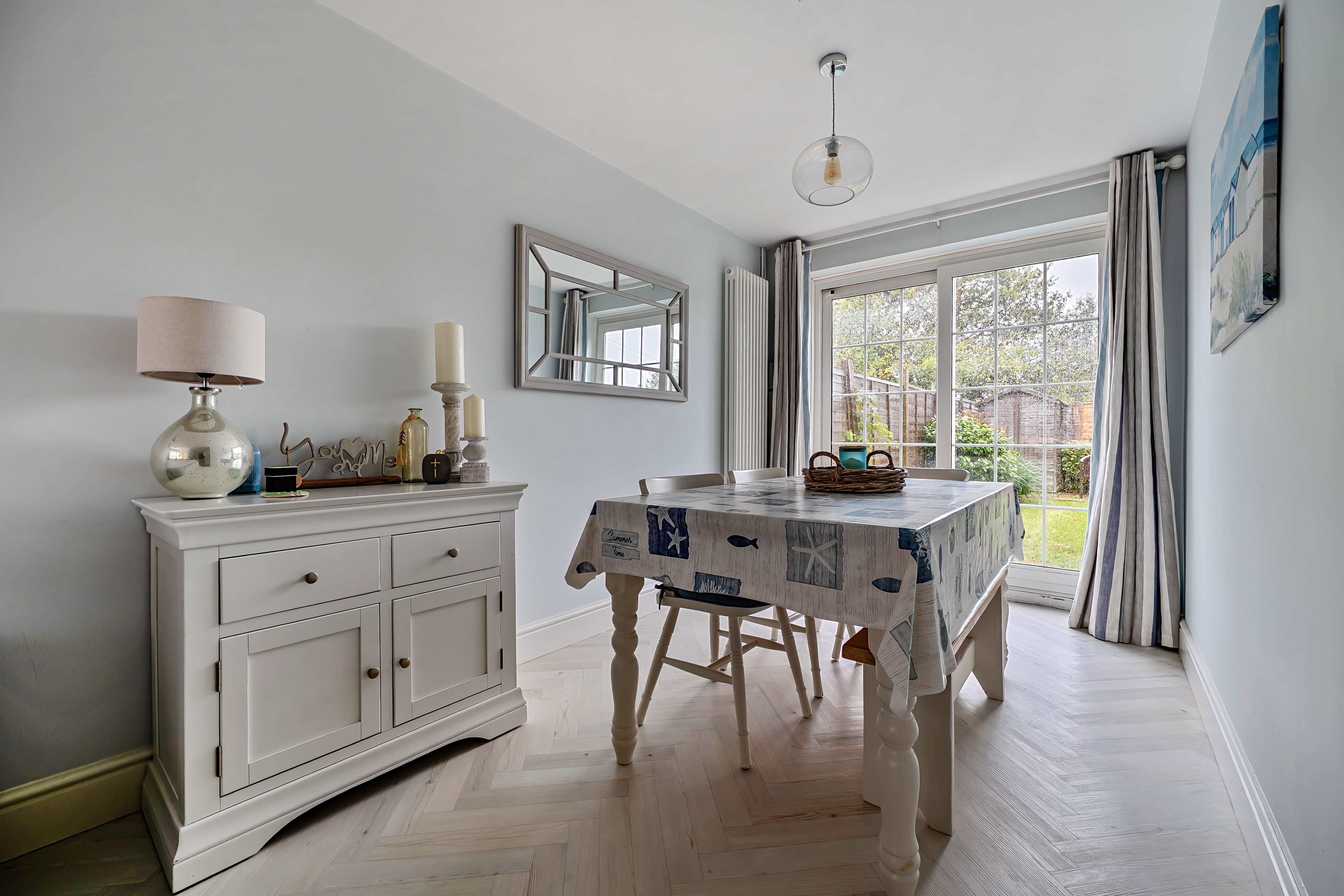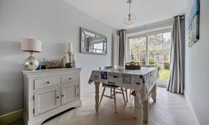 The house has been thoughtfully improved in recent years, featuring a re-fitted contemporary kitchen with quality integrated appliances and a modern gas-fired central heating system. The accommodation includes an inviting entrance hall, a cloakroom with WC, and a bright open-plan living and dining room with patio doors opening onto the rear garden, creating a seamless flow between indoor and outdoor spaces. The modern fitted kitchen provides direct access to the garden and offers a perfect blend of functionality and style.