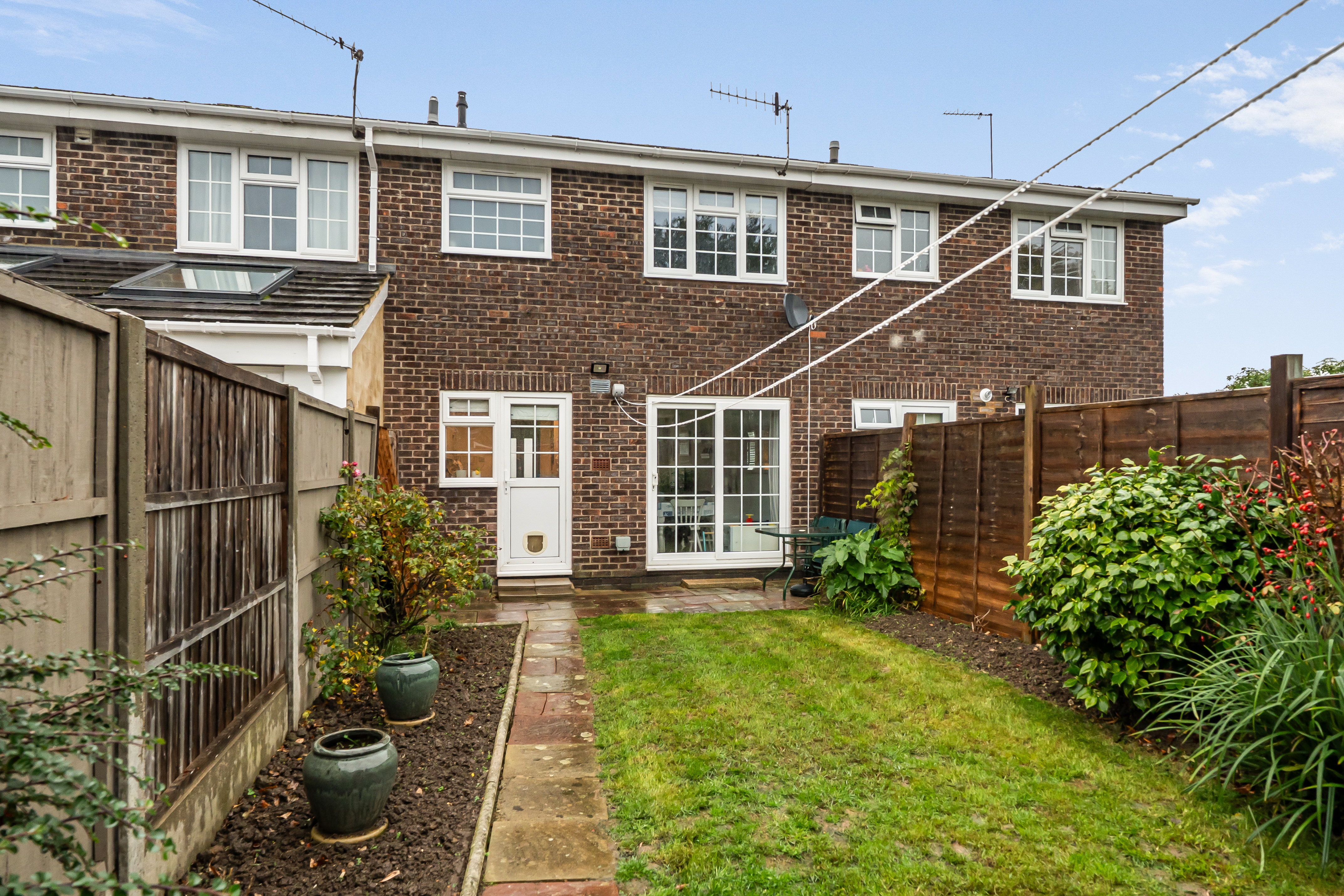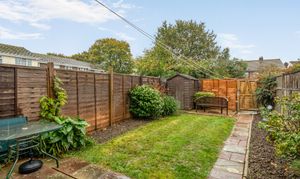 Outside, the property enjoys well-maintained gardens to the front and rear, the latter being south-facing and ideal for relaxation or entertaining. The garage is conveniently located immediately behind the house accessed via a gate to the rear of the garden and drive to the side of the terrace, offering secure parking and additional storage.