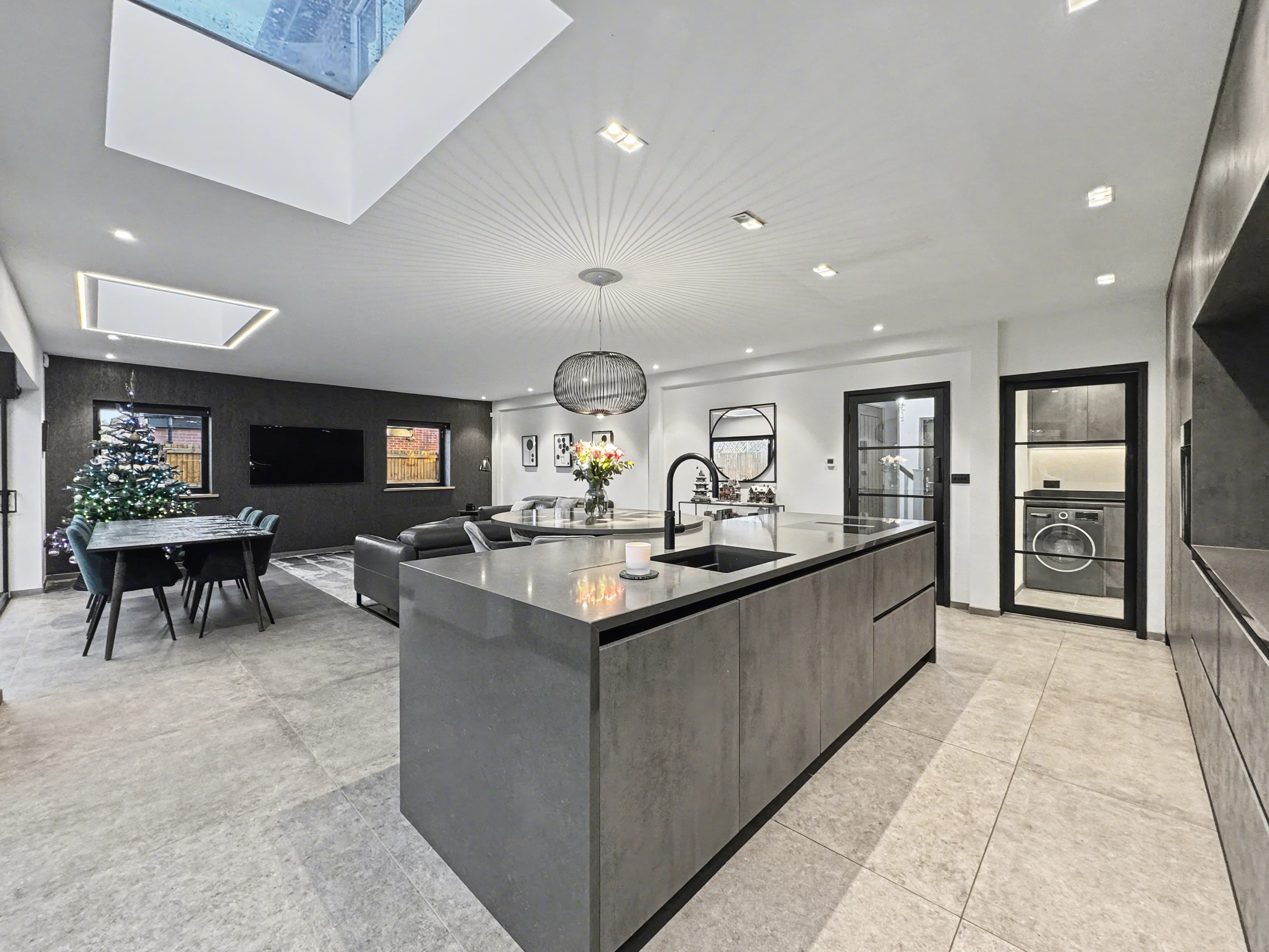 The current owners have thoughtfully extended and enhanced the home to an exceptional standard, creating spacious and versatile accommodation ideal for modern lifestyles. At the heart of the property is a stunning open-plan kitchen, dining and living space, flooded with natural light from skylight windows and bi-folding doors that open directly onto the rear garden. The sleek central island with breakfast bar and integrated appliances makes this space perfect for both everyday living and entertaining. A separate utility room sits just off the kitchen, adding further practicality.