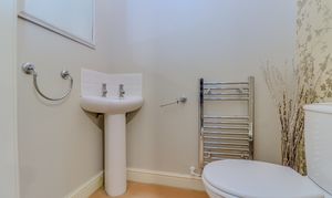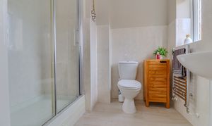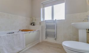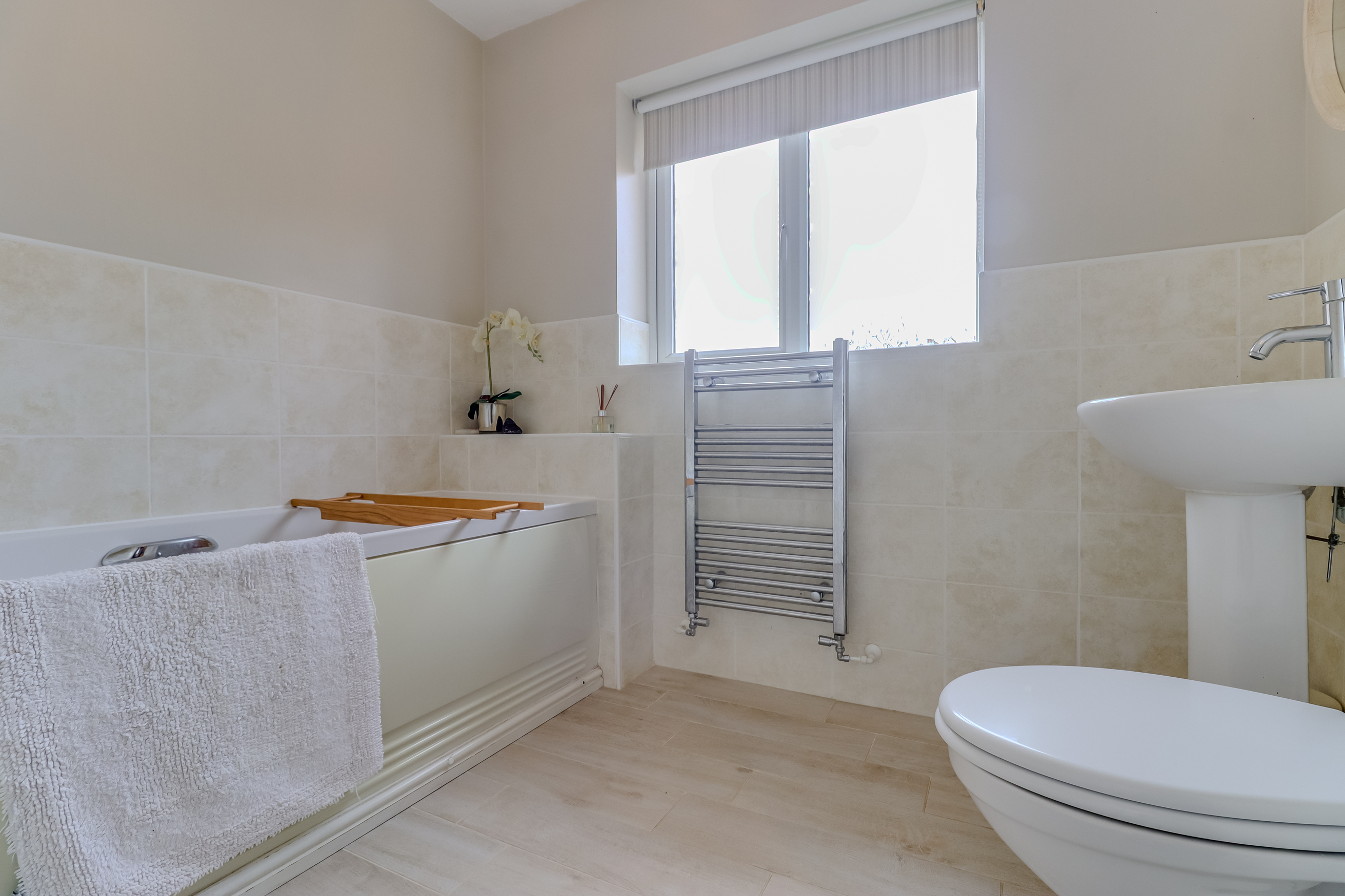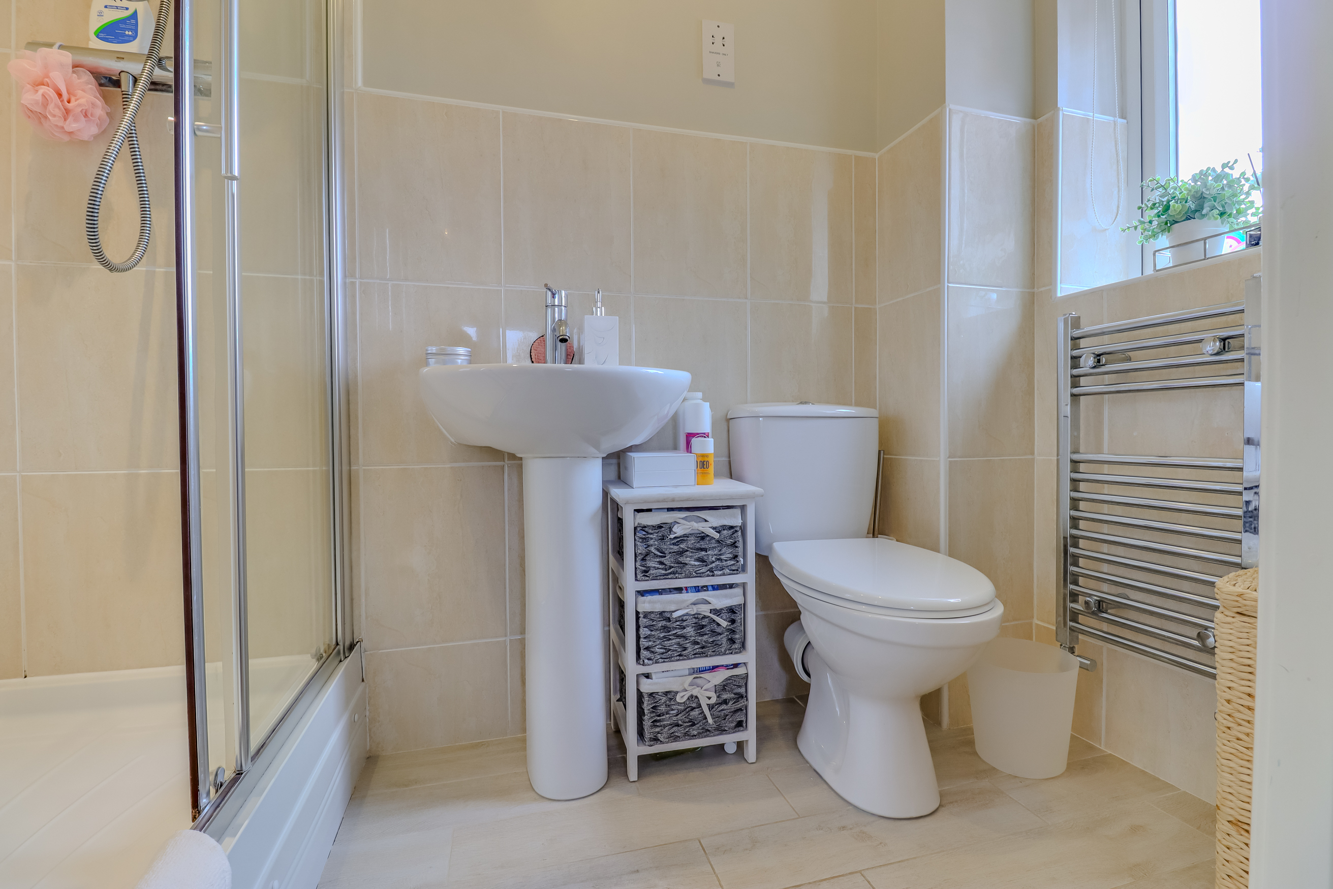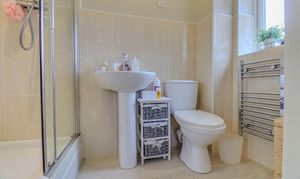 The family bathroom is fitted with a panelled bath, separate shower cubicle, WC, pedestal wash basin, heated towel rail, and tiled walls and flooring.