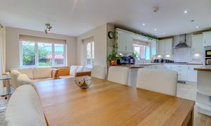 The spacious, L-shaped dining kitchen is fitted with an extensive range of modern units, soft-close drawers, and high-quality integrated appliances, including an AEG oven, combination microwave, gas hob with extractor, Electrolux dishwasher, and fridge-freezer. The room also benefits from tiled flooring, spot lighting, and multiple windows allowing for plenty of natural light. French doors open onto the garden, creating a perfect space for family dining and entertaining.
