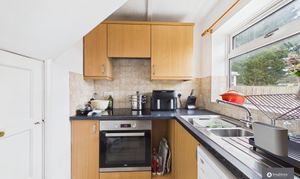The property benefits from a large, bright living area that provides plenty of natural light and ample space for both relaxing and dining. The kitchen is practical and functional, offering good workspace and storage, with access to a useful outdoor building that provides additional storage or utility space.