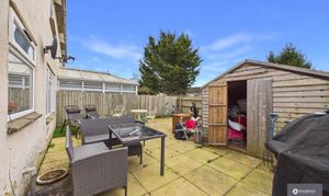 The outdoor building leads through to a patio area, which in turn opens onto a substantial south-east facing plot. The generous garden enjoys plenty of morning and early afternoon sunshine and offers excellent scope for gardening, entertaining, or further landscaping.