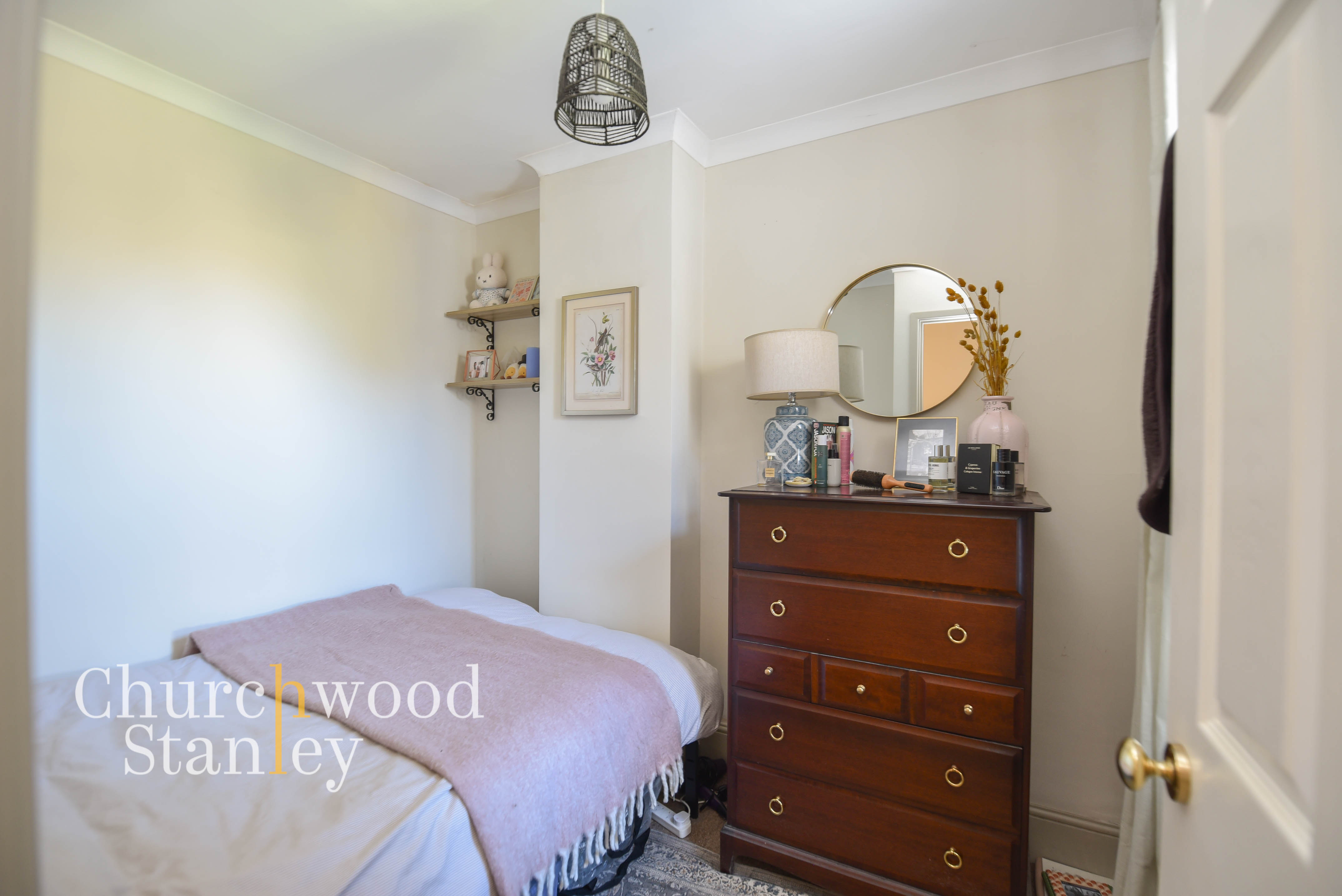 Upstairs, the layout remains straightforward and efficient. Two bedrooms sit off the landing, with the principal room positioned to the front and offering a comfortable double with built-in storage and retained character features. The second room is flexible, easily serving as a guest bedroom, workspace or nursery depending on requirements.