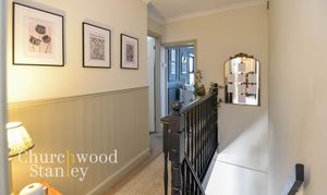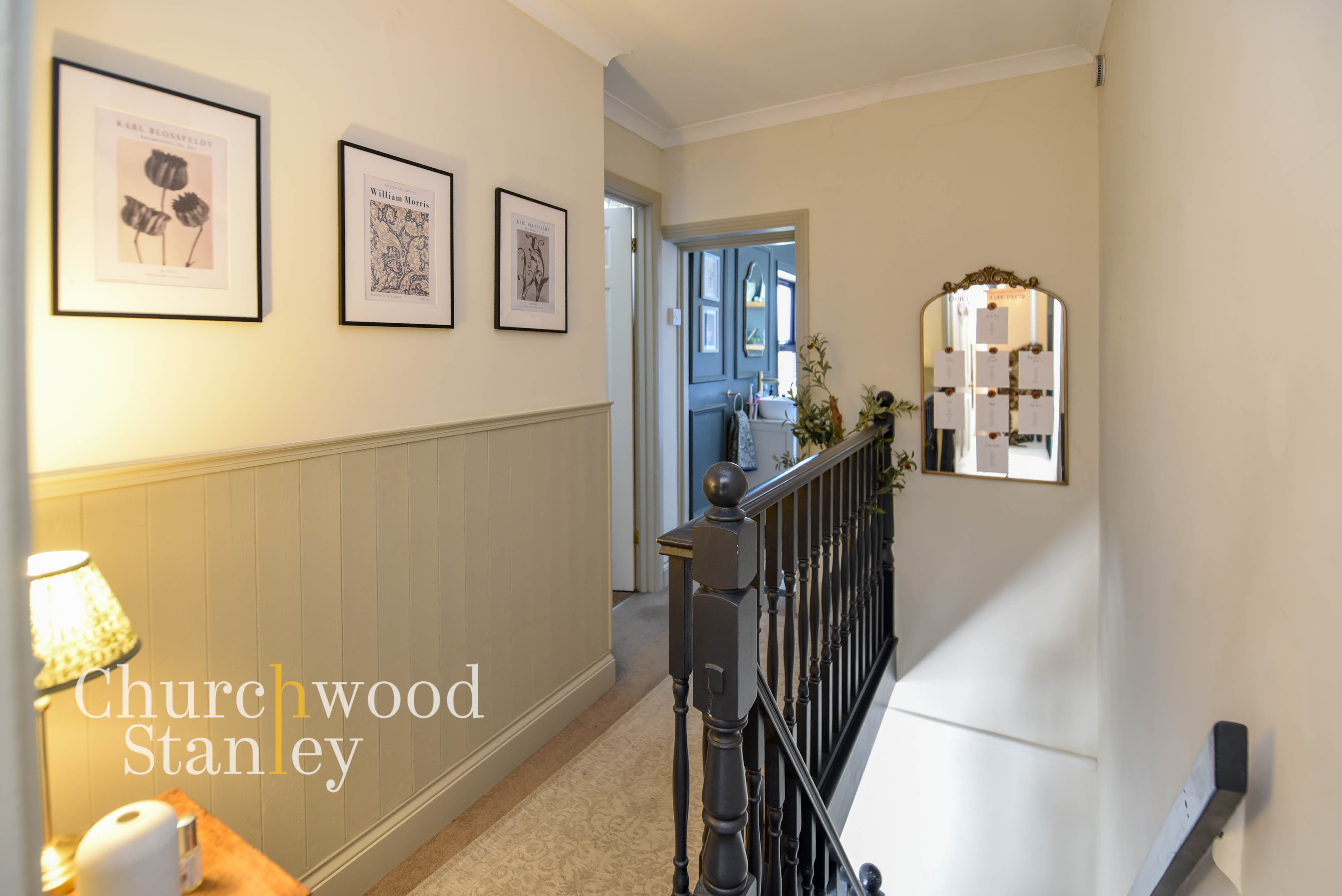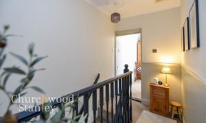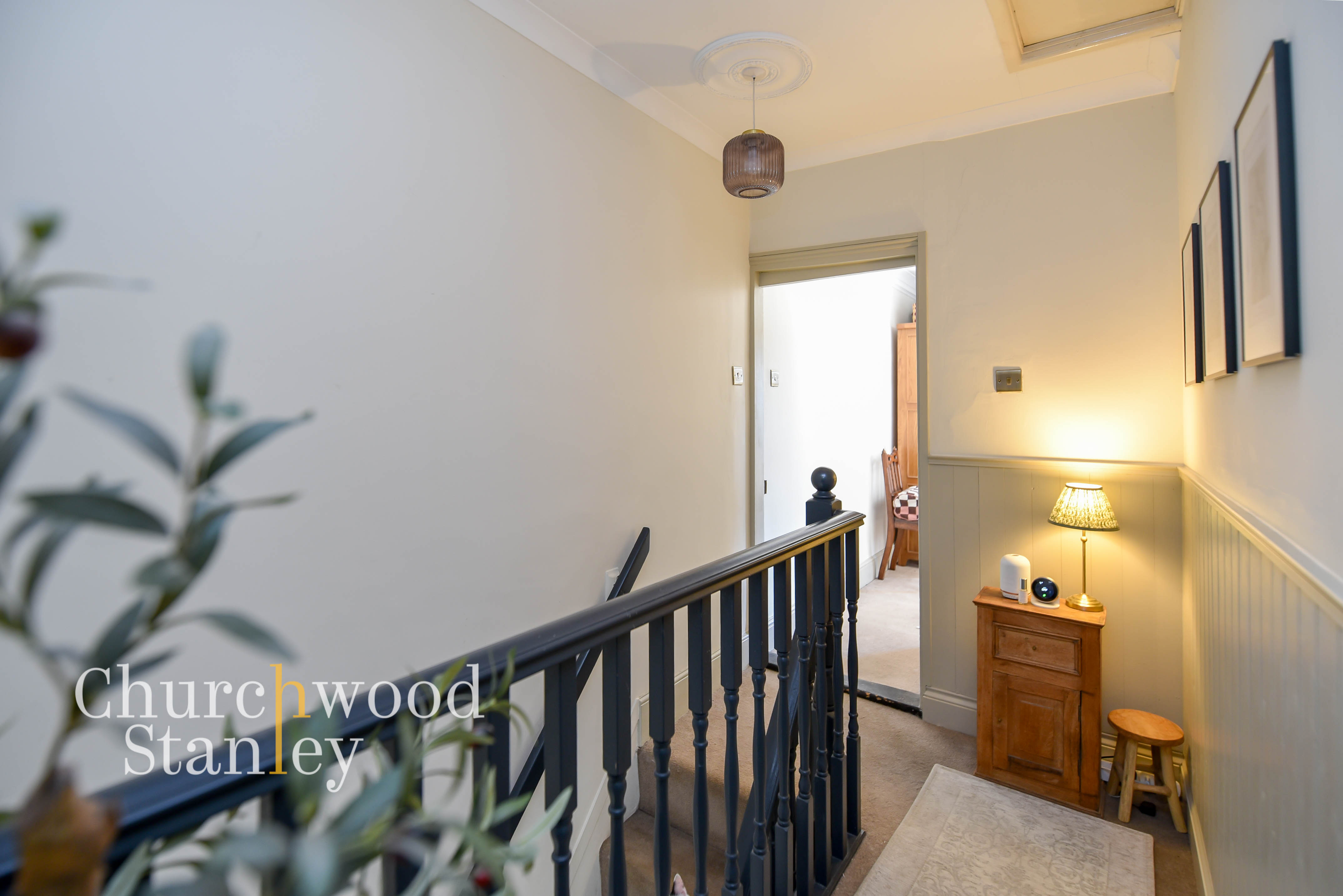 A beautiful character landing with painted balustrade and panelled detailing. Doors lead off to both bedrooms and the bathroom in a traditional layout.