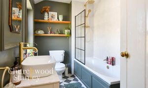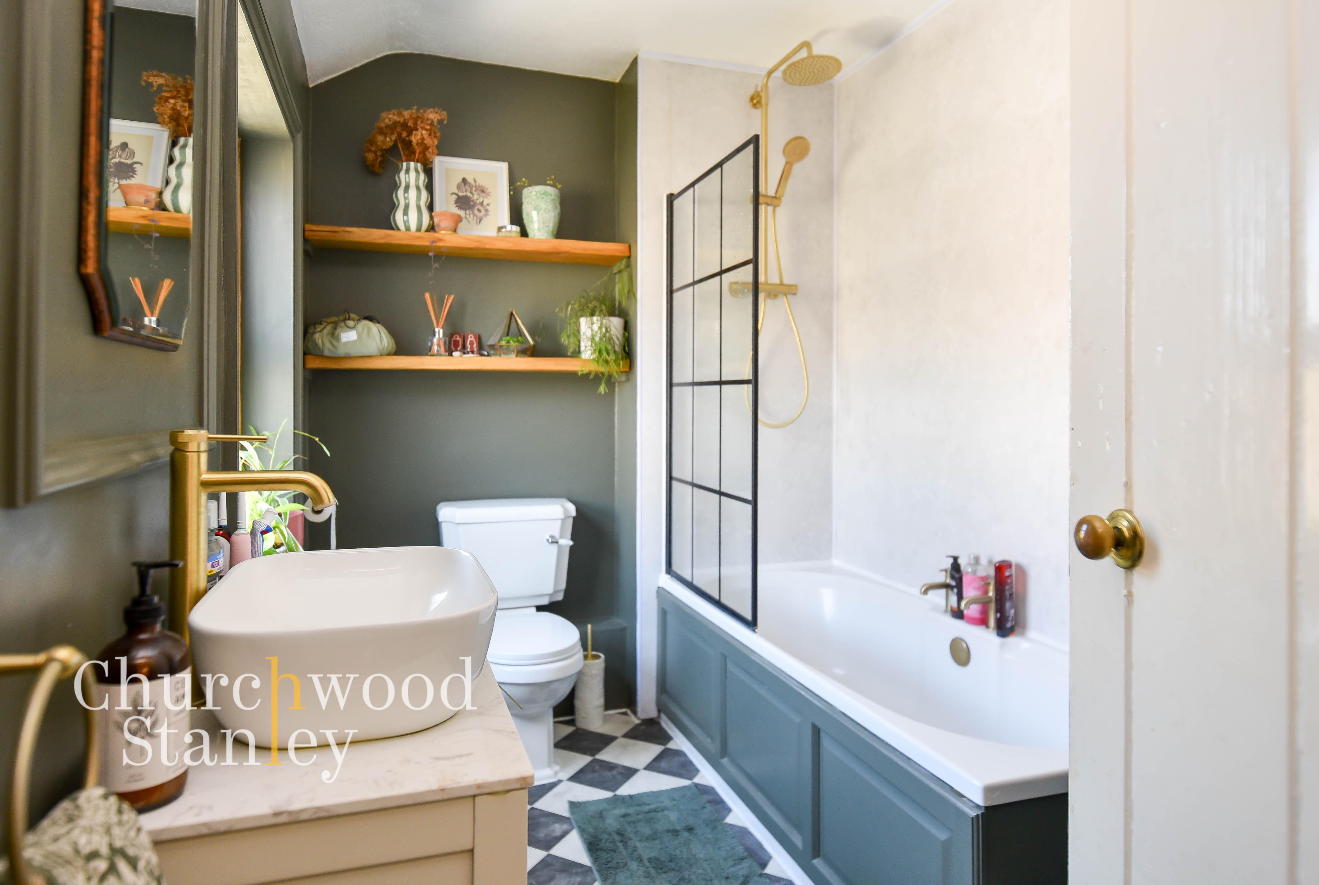A well-finished bathroom that balances style with practicality. A panelled bath with shower over is paired with a contemporary screen and striking brass fittings, giving the space a more period feel. The wash basin sits neatly on a vanity unit, with storage and display shelving built in above the WC. There’s a good mix of materials here, from the tiled splashbacks to the patterned flooring, all working together to compliment the room. An airing cupboard provides useful additional storage, keeping everyday essentials neatly tucked away.