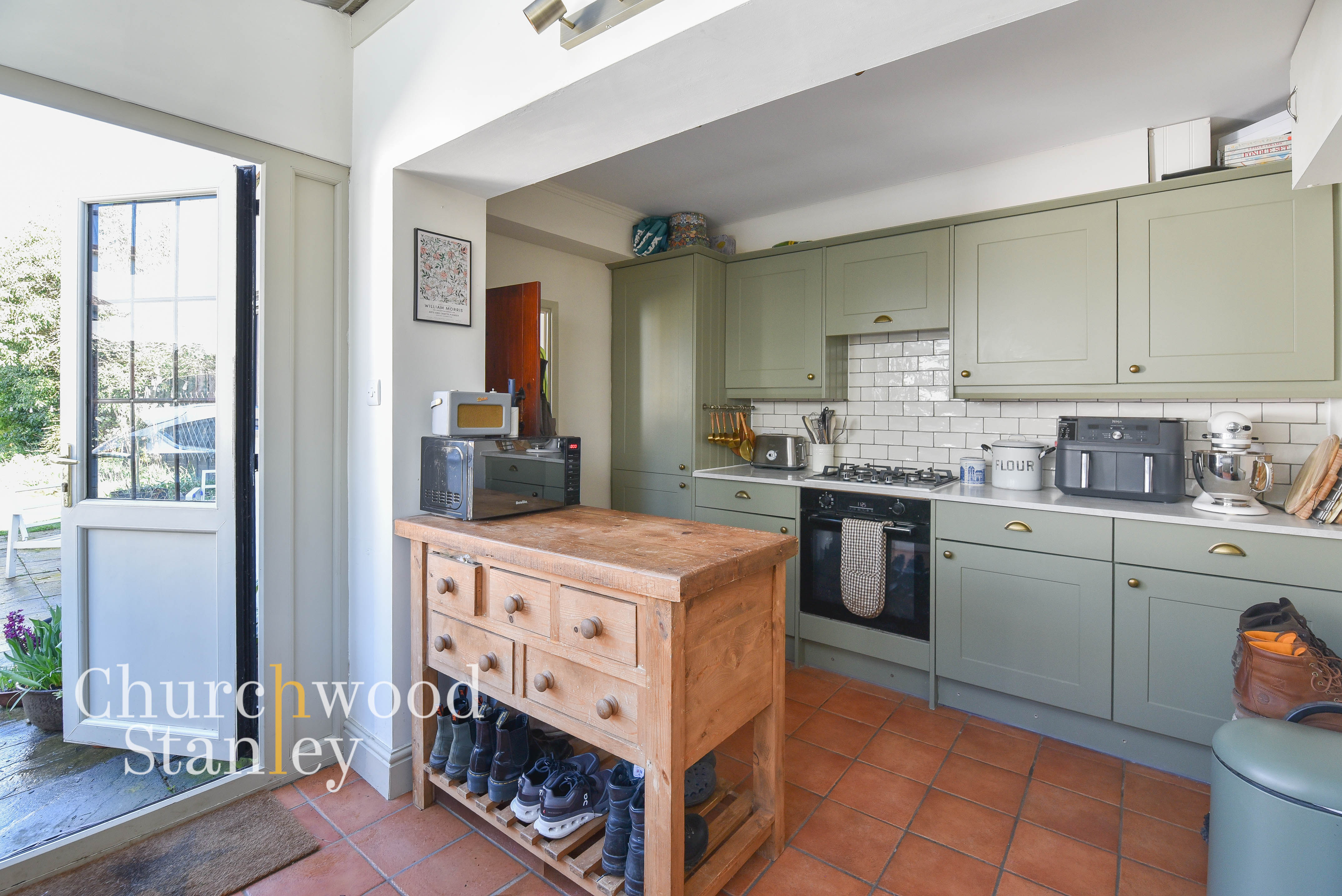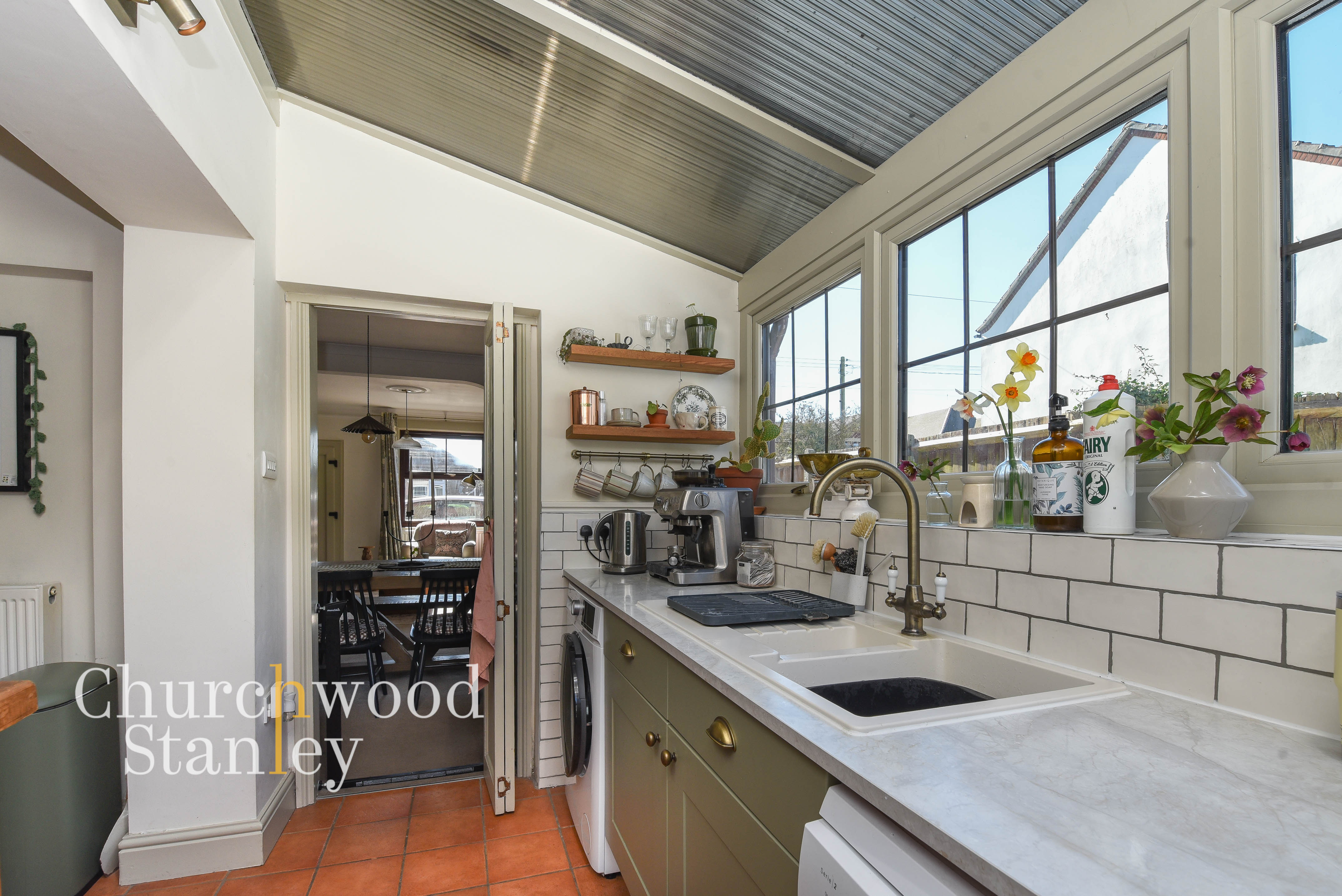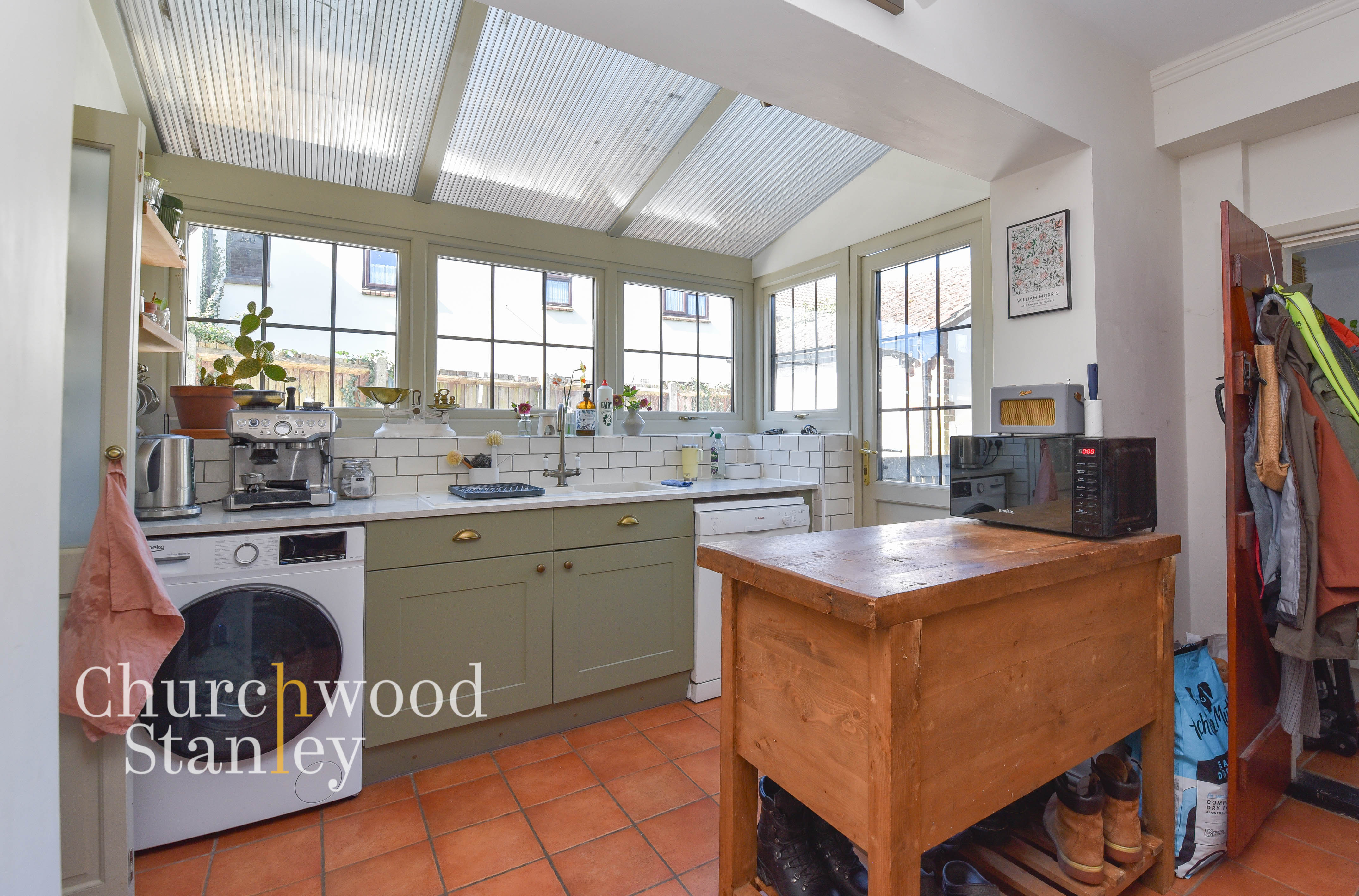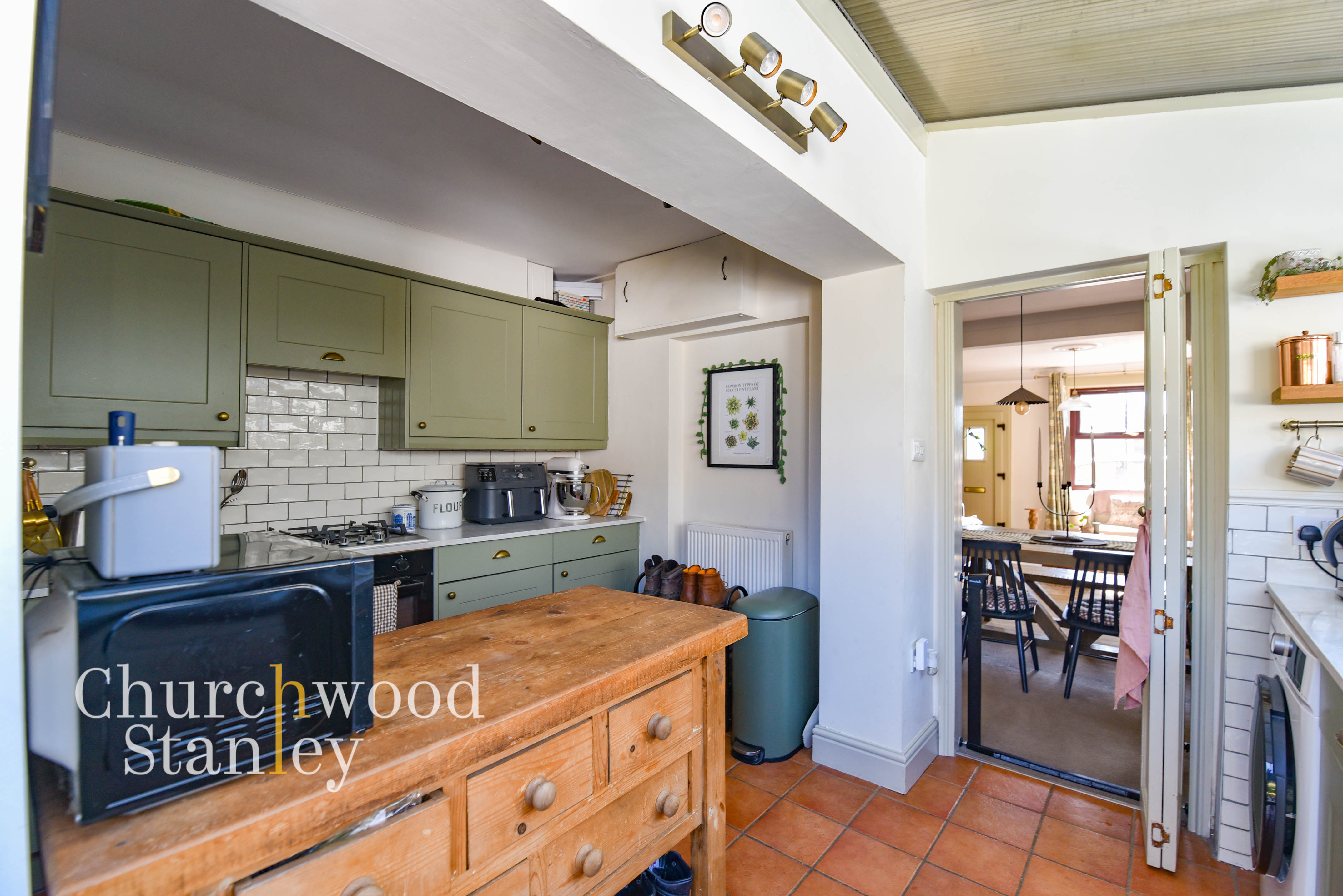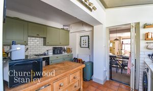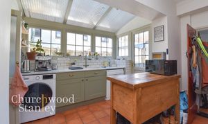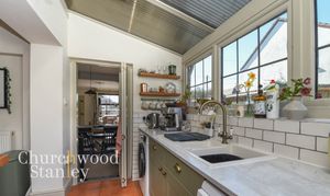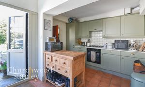 Positioned at the rear, the kitchen is a naturally bright and functional space, enhanced by a vaulted ceiling with glazed panels that draw light deep into the room. A wide run of windows sits above the main work surface, making the sink area feel particularly well placed. The cabinetry is finished in a classic shaker style, paired with solid worktops and tiled splashbacks, offering a good balance of storage and preparation space. The layout works well in practice, with clear zones for cooking, washing and prep, all within easy reach. A door leads directly out to the garden, ideal for everyday use, while a useful rear lobby sits just off the kitchen, providing access to the cloakroom and additional practical storage space.