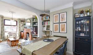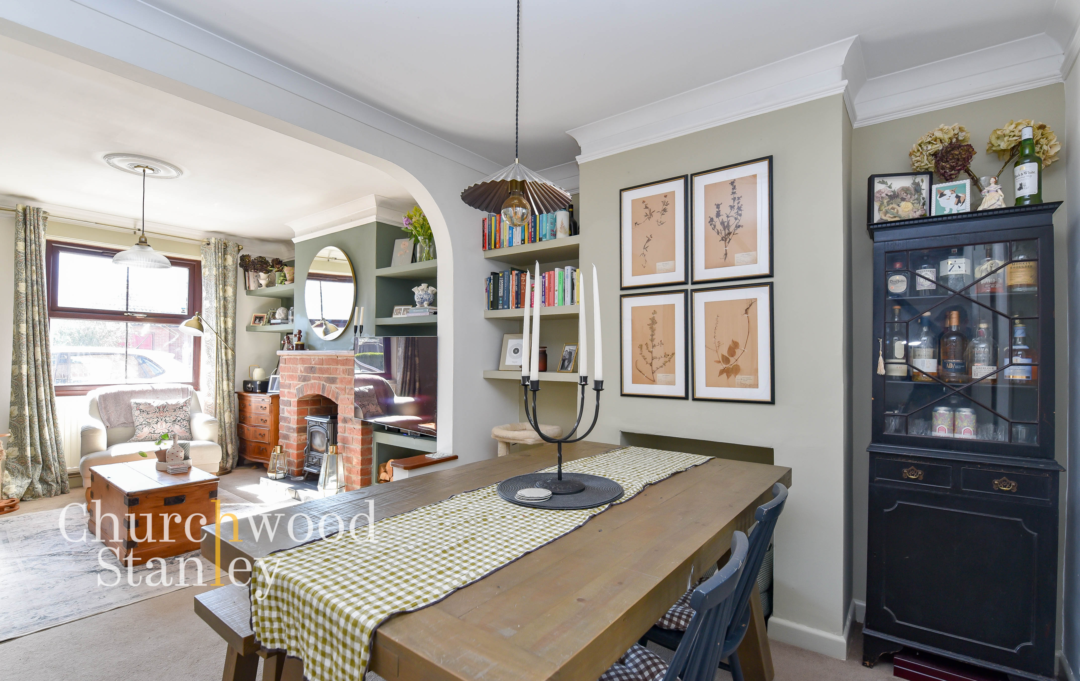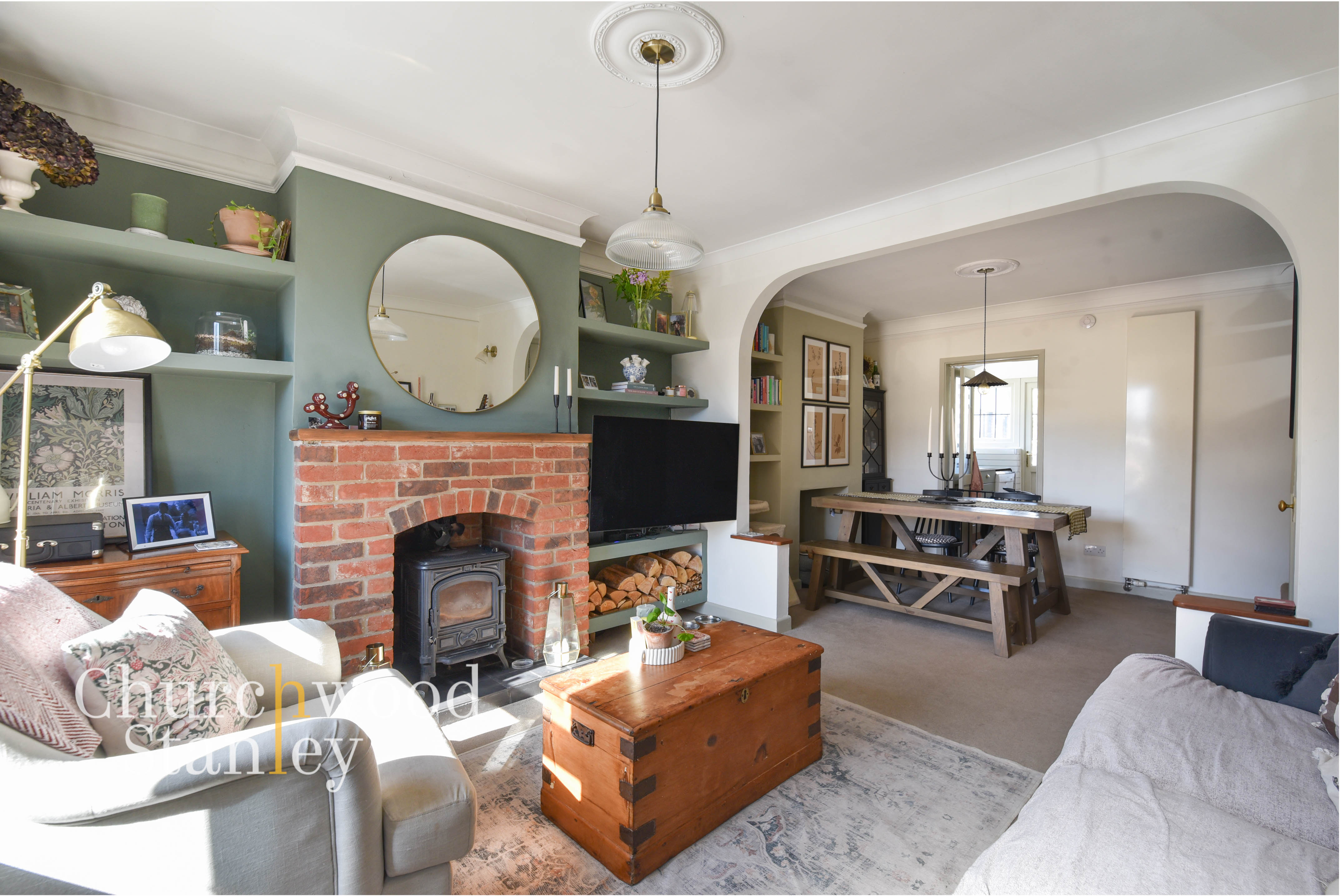 Positioned at the front of the house, this is a space that immediately feels settled and comfortable, with a natural balance between character and everyday usability. A front window draws in good levels of light, while the proportions allow for a proper seating arrangement without feeling tight. The focal point is the exposed brick fireplace with inset wood burning stove, giving the room both presence and purpose through the colder months. Built-in shelving and alcoves frame the chimney breast neatly, adding storage without encroaching on the floor space and reinforcing that sense of a room that’s been thoughtfully arranged. There’s a softness to the finishes that works well here, with neutral tones and subtle detailing, while the open archway to the dining room beyond keeps the space connected without losing its identity as a separate reception.
