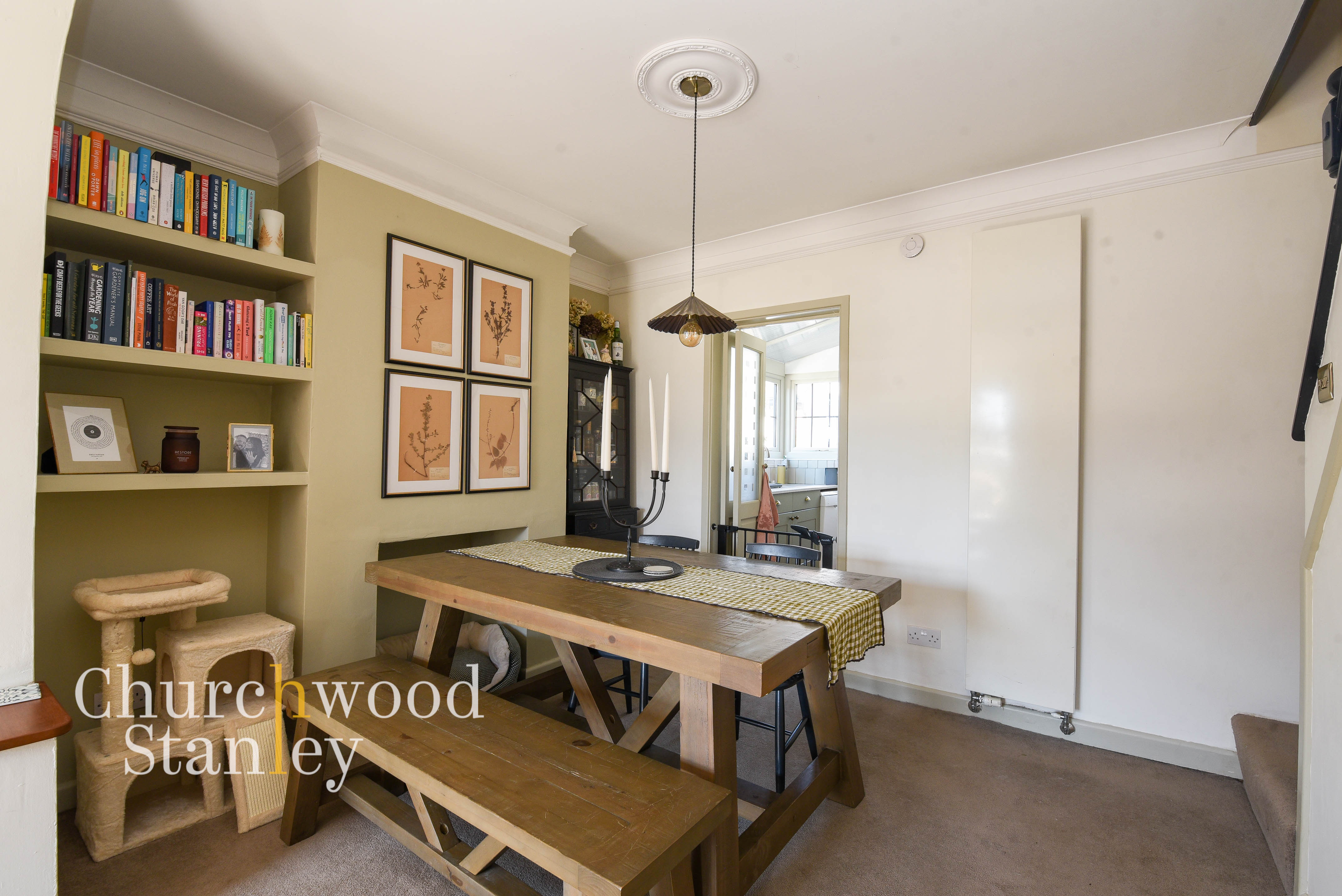 Set centrally between the living room and kitchen, the dining room works as the natural link through the ground floor, both visually and practically. The open archway keeps a clear connection back to the front reception, allowing light to carry through and making the whole ground floor feel open. There’s ample space here for a proper dining table and bench seating, with the layout comfortably accommodating everyday meals as well as larger gatherings. Built-in shelving provides a useful mix of storage and display, adding a sense of character while keeping the room functional. The staircase rises neatly from this space to the first floor, positioned without interrupting the usable floor area.
