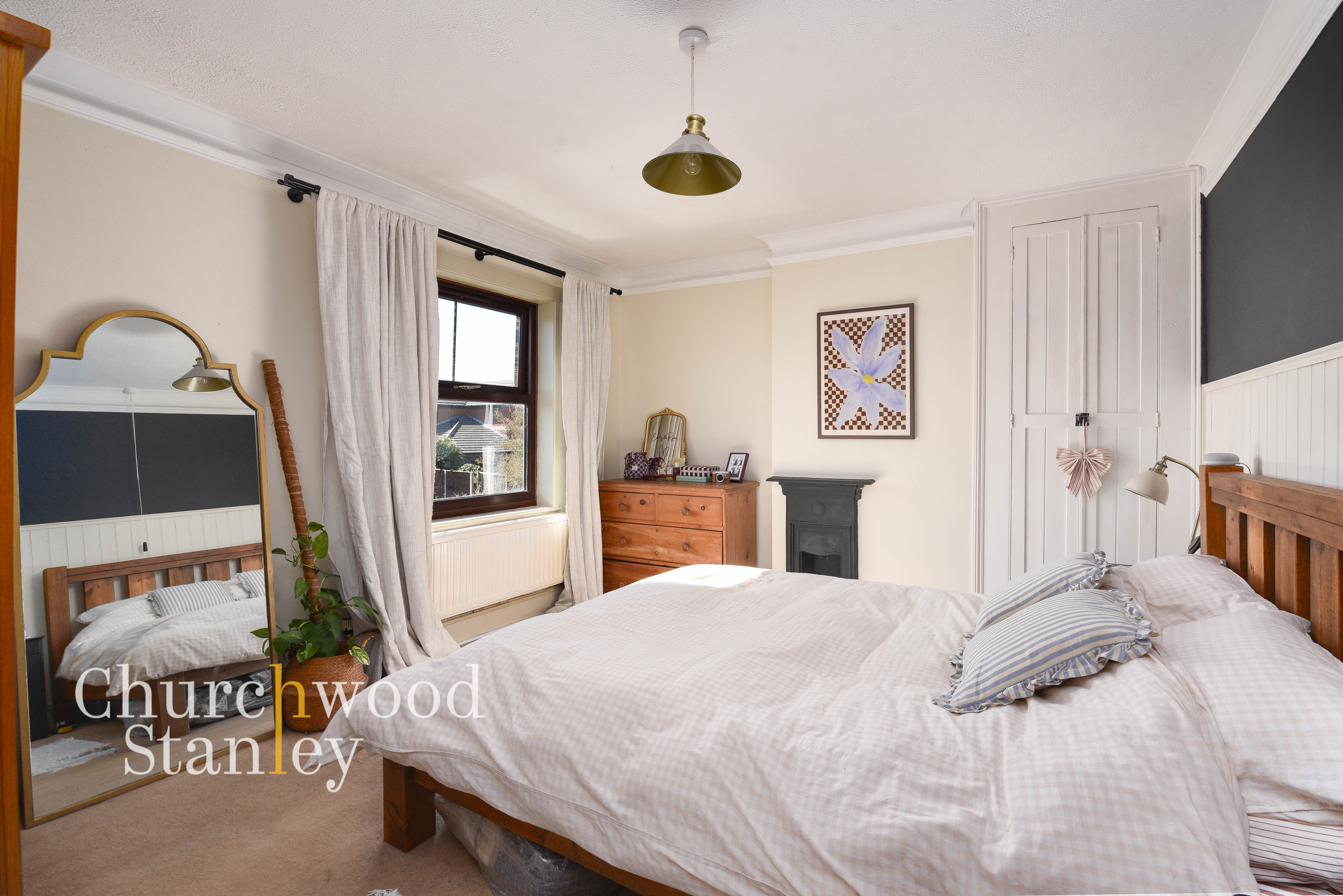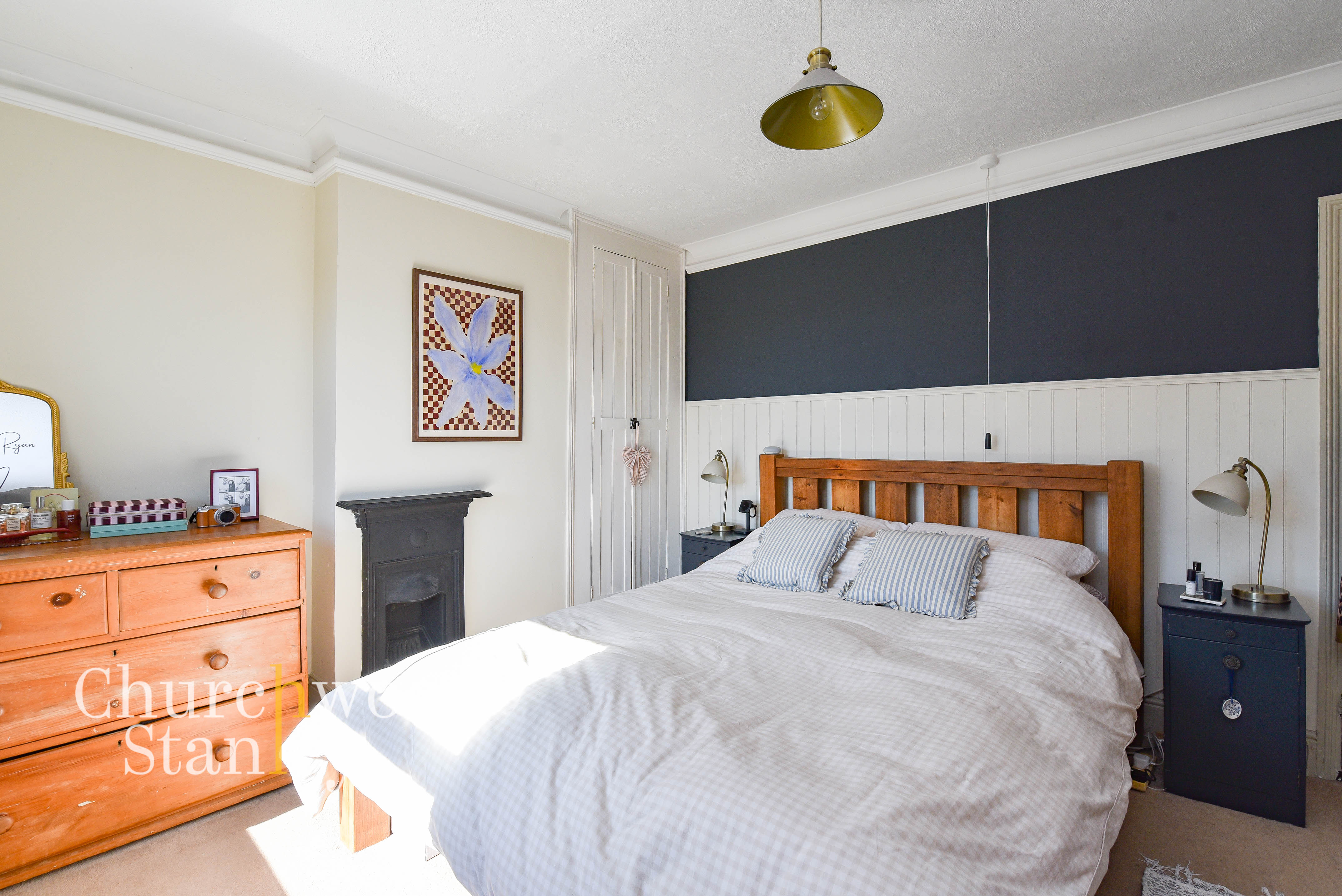 Positioned to the front, the main bedroom is a well-proportioned double that feels calm and settled, with good natural light coming through the window. There’s space for a full bed and freestanding furniture without crowding, allowing the room to function comfortably day to day. Character features remain present, including a decorative fireplace and panelled detailing, adding interest without overpowering the space. Built-in storage is neatly tucked to one side, helping keep the room organised.