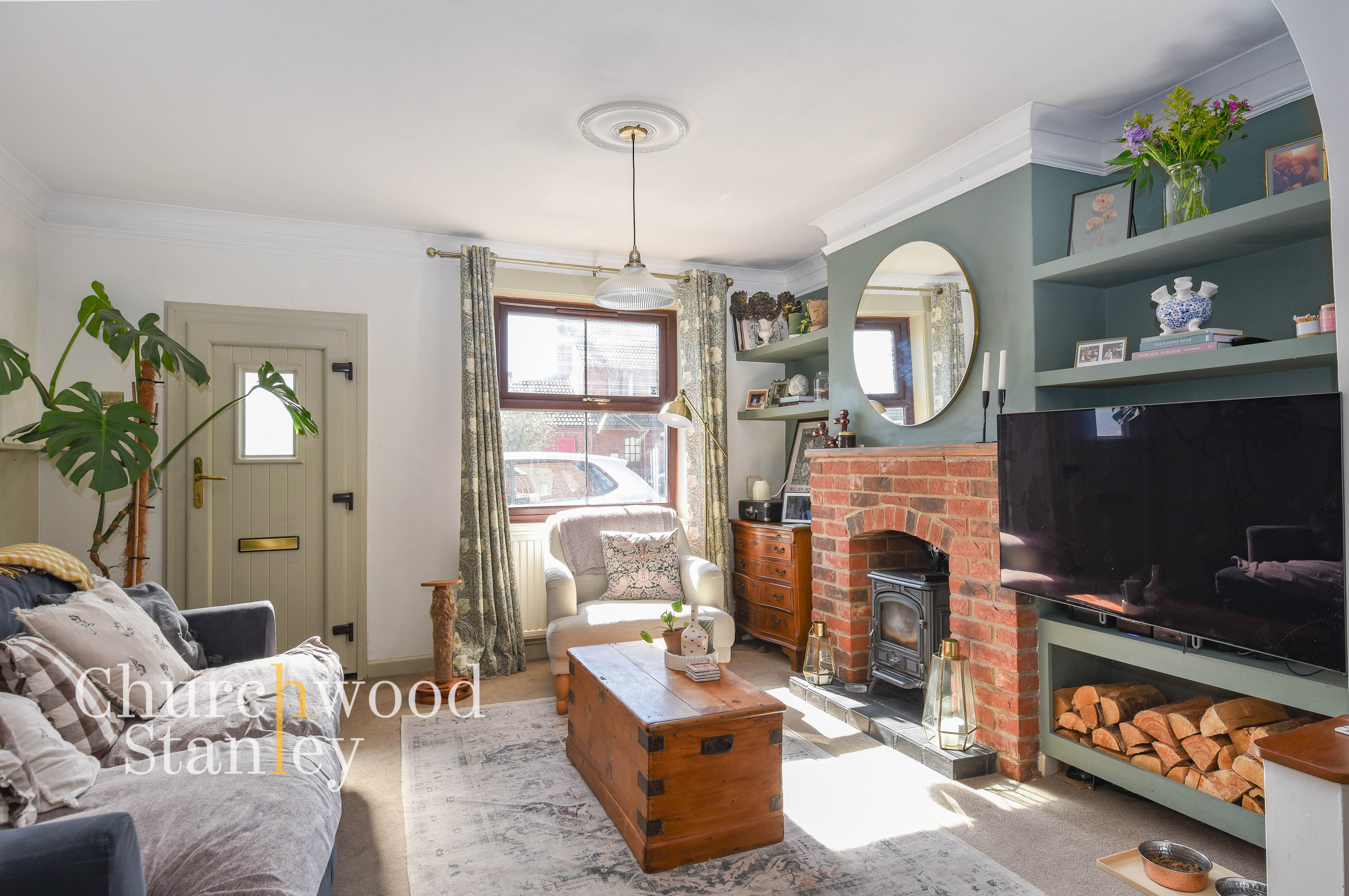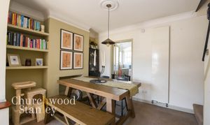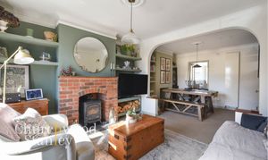 Step inside and the layout unfolds in a traditional sequence. The front reception room is a comfortable place to settle, centred around a wood burning stove with built-in shelving framing the chimney breast. A wide opening leads through to the dining room, positioned centrally and working as the natural link between spaces, allowing light to pass through while still retaining a sense of separation.