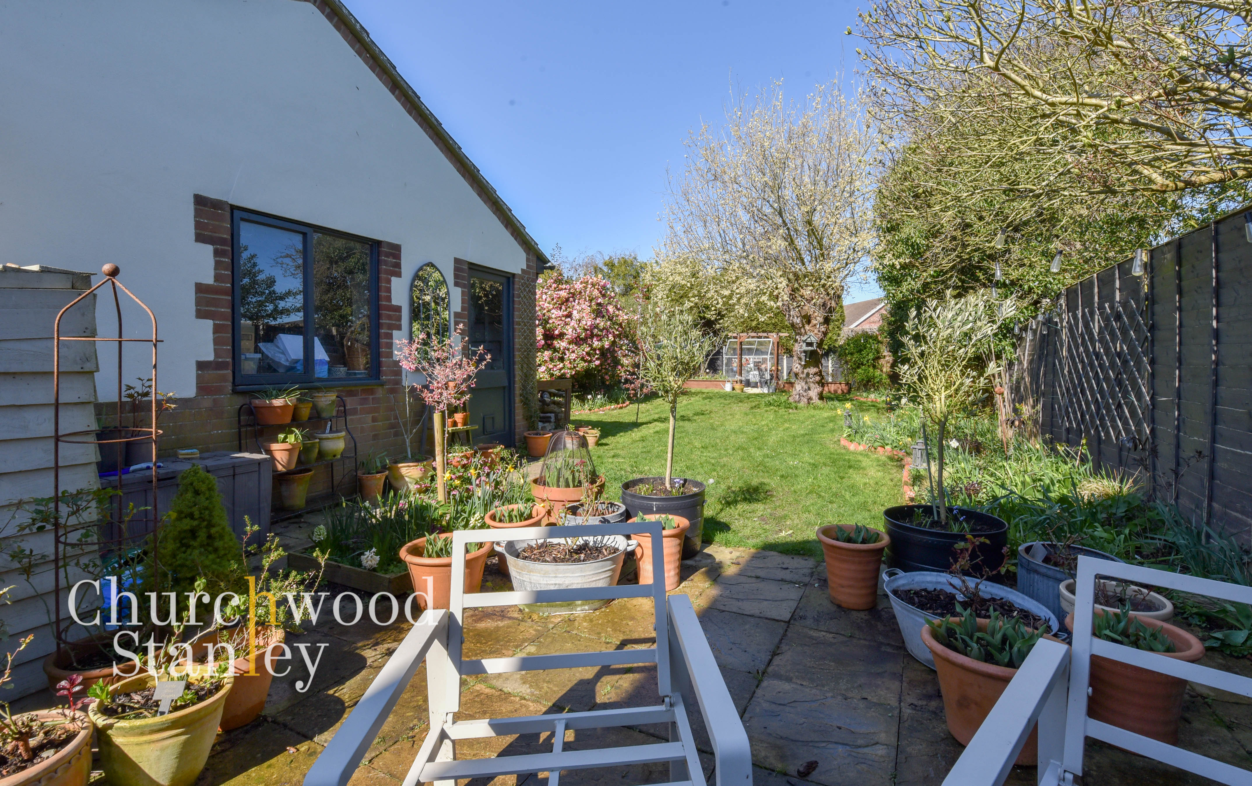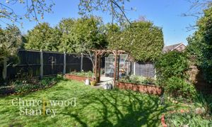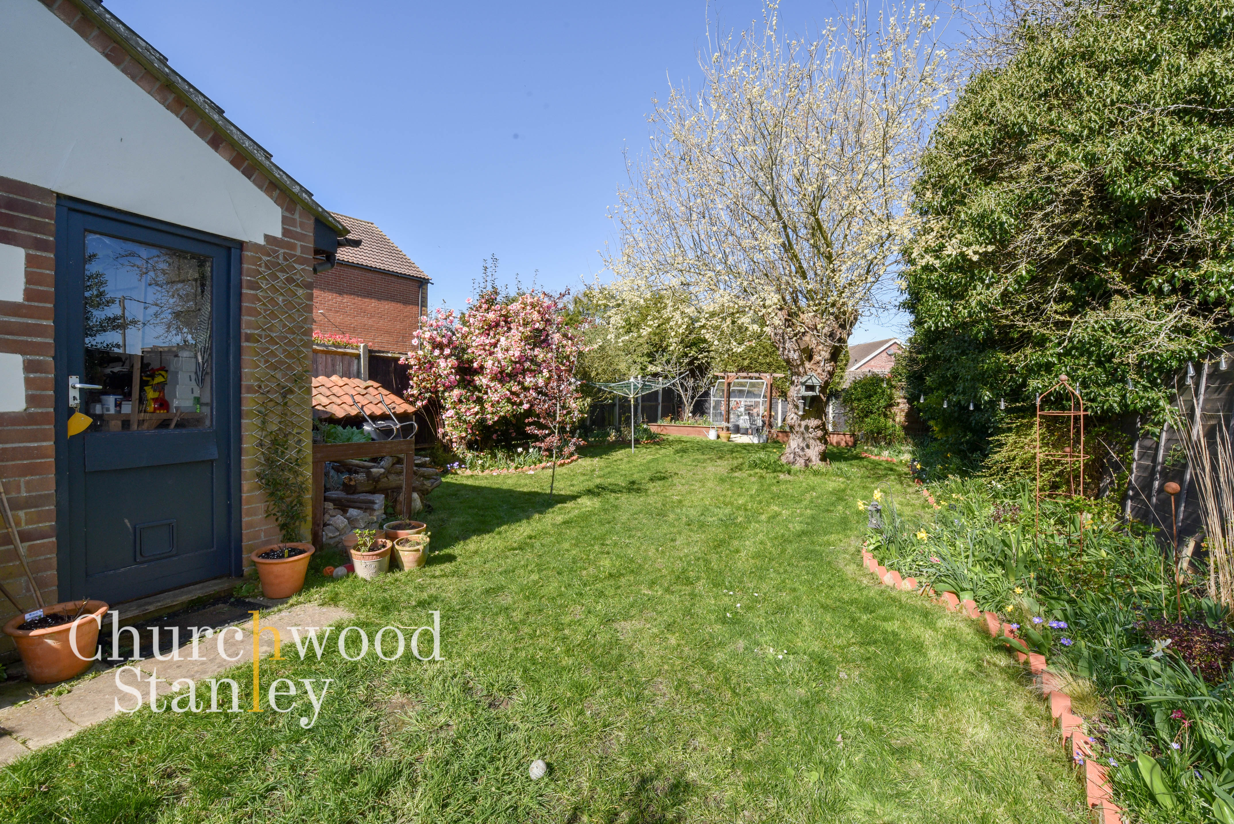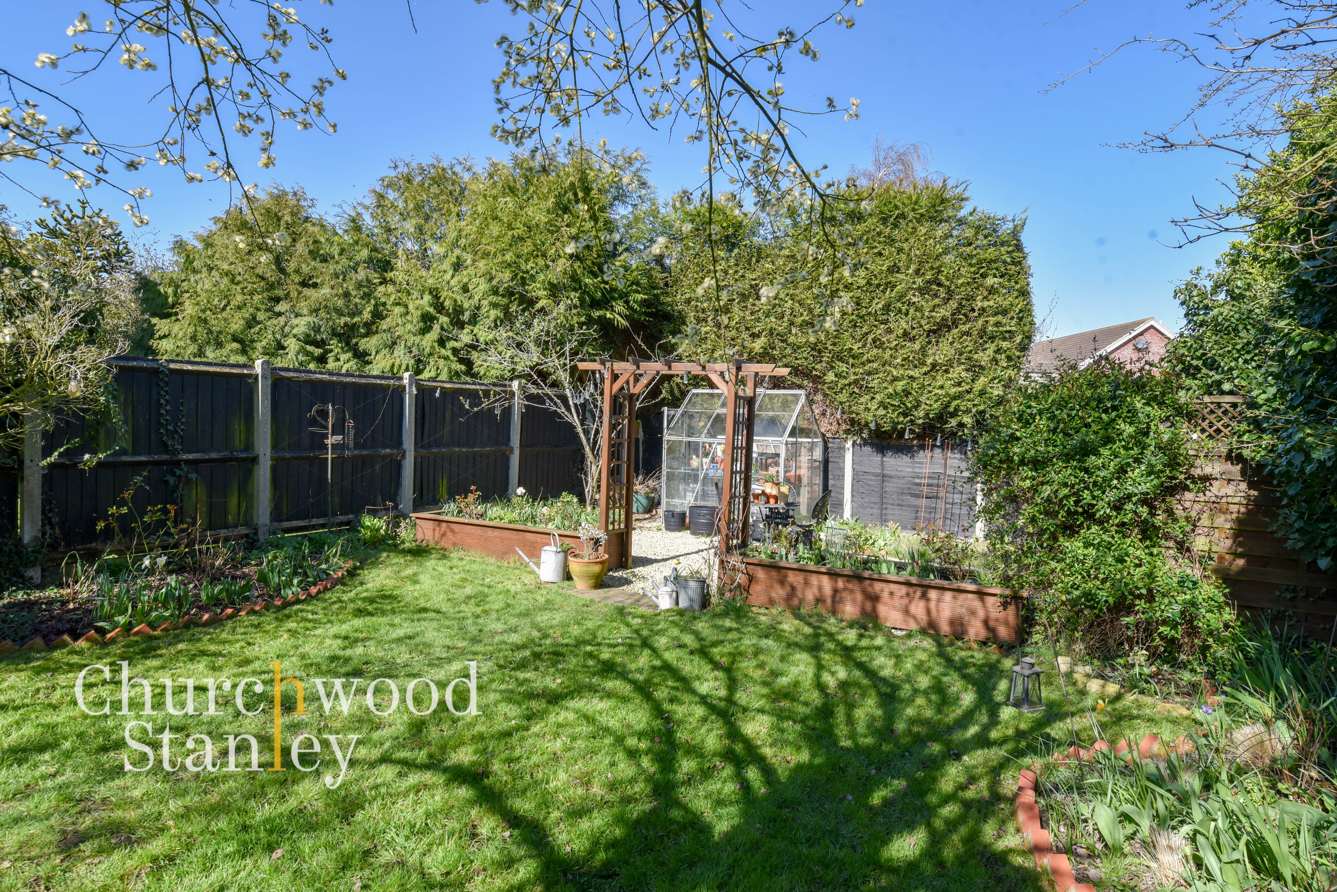 A garden that feels established and genuinely usable, extending well beyond the rear of the house (approximately 90'). Immediately outside, a patio area provides a natural spot for seating and dining. Beyond this, the garden opens out into a lawn bordered by well-stocked beds, with a variety of planting that adds colour and interest across the seasons. There’s a mature feel here, with trees and shrubs creating a sense of privacy without closing the space in. Towards the rear, a more productive section includes raised beds, a greenhouse and a timber pergola, offering scope for those with an interest in growing or simply wanting a more structured outdoor area. The garage sits to the side, and there’s a practical division near the house for storage and day-to-day use, keeping the main garden space clear and enjoyable.