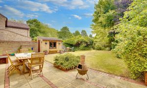 To the rear, a private, wildlife-friendly garden—mainly laid to lawn—provides a tranquil setting for outdoor activities. A brick-built shed with power and updated lighting (2024) offers practical storage or workspace. The garden is well-lit with three security lights installed in 2020 and further protected by Blink outdoor cameras—one at the front and two at the back.
