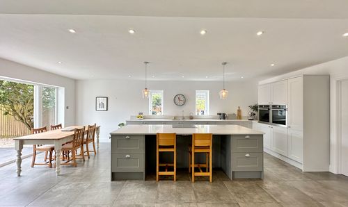 The open-plan kitchen, dining and family room is the heart of the home. The kitchen is fitted with a generous range of base and wall units, complemented by granite work surfaces that provide ample preparation space. Integrated appliances include an oven with hob and microwave oven, an overhead extractor and a dishwasher. A water softener is installed beneath the sink unit. There is space for a fridge/freezer and washing machine. A breakfast bar provides the perfect spot for informal dining, and the porcelain tiled floor leads seamlessly to the engineered oak flooring of the dining/family room providing a spacious family and entertaining area. French doors open directly onto the decking and garden, allowing the space to extend outdoors during warmer months.