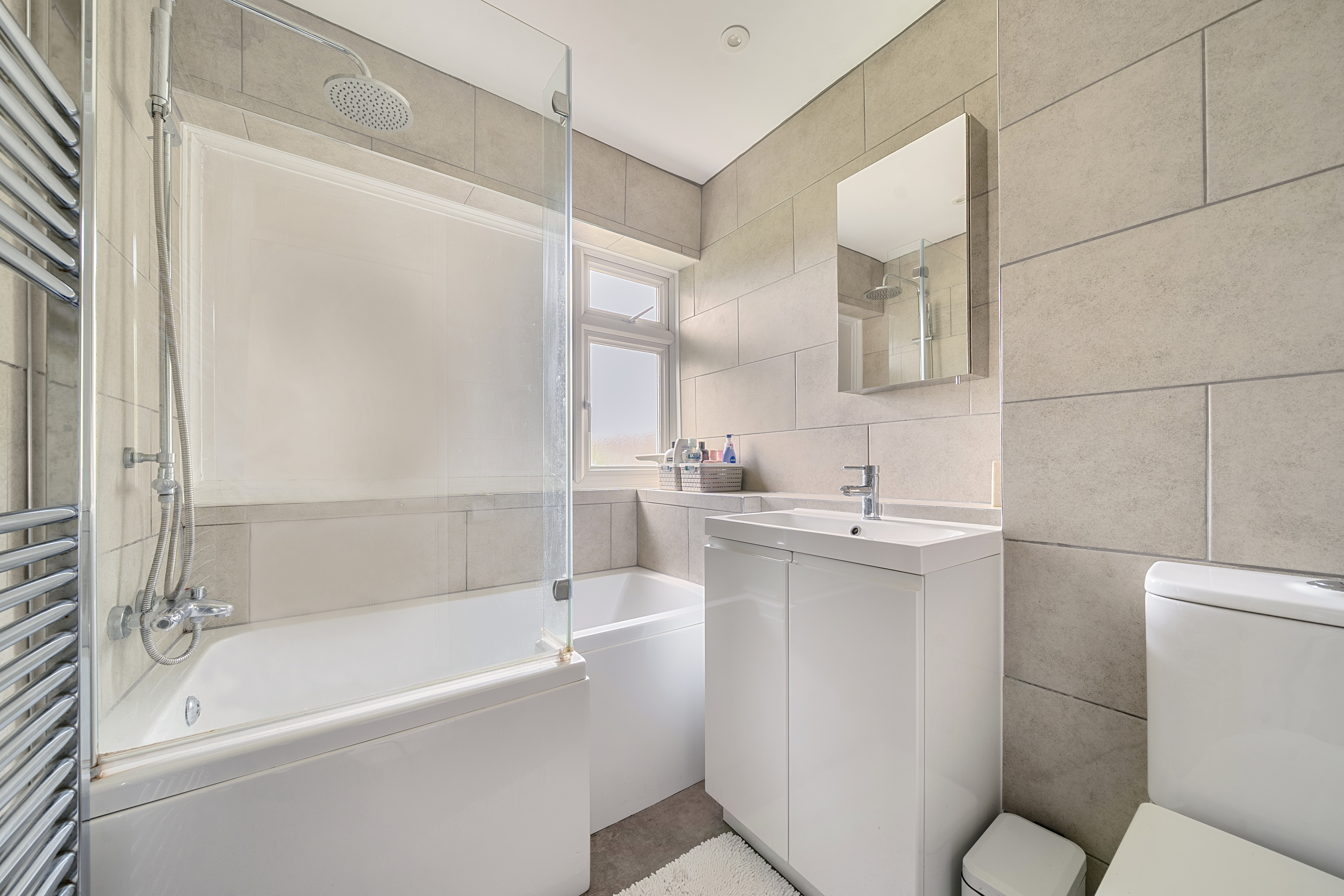 - Refurbished bathroom with shower bath and tiled walls.