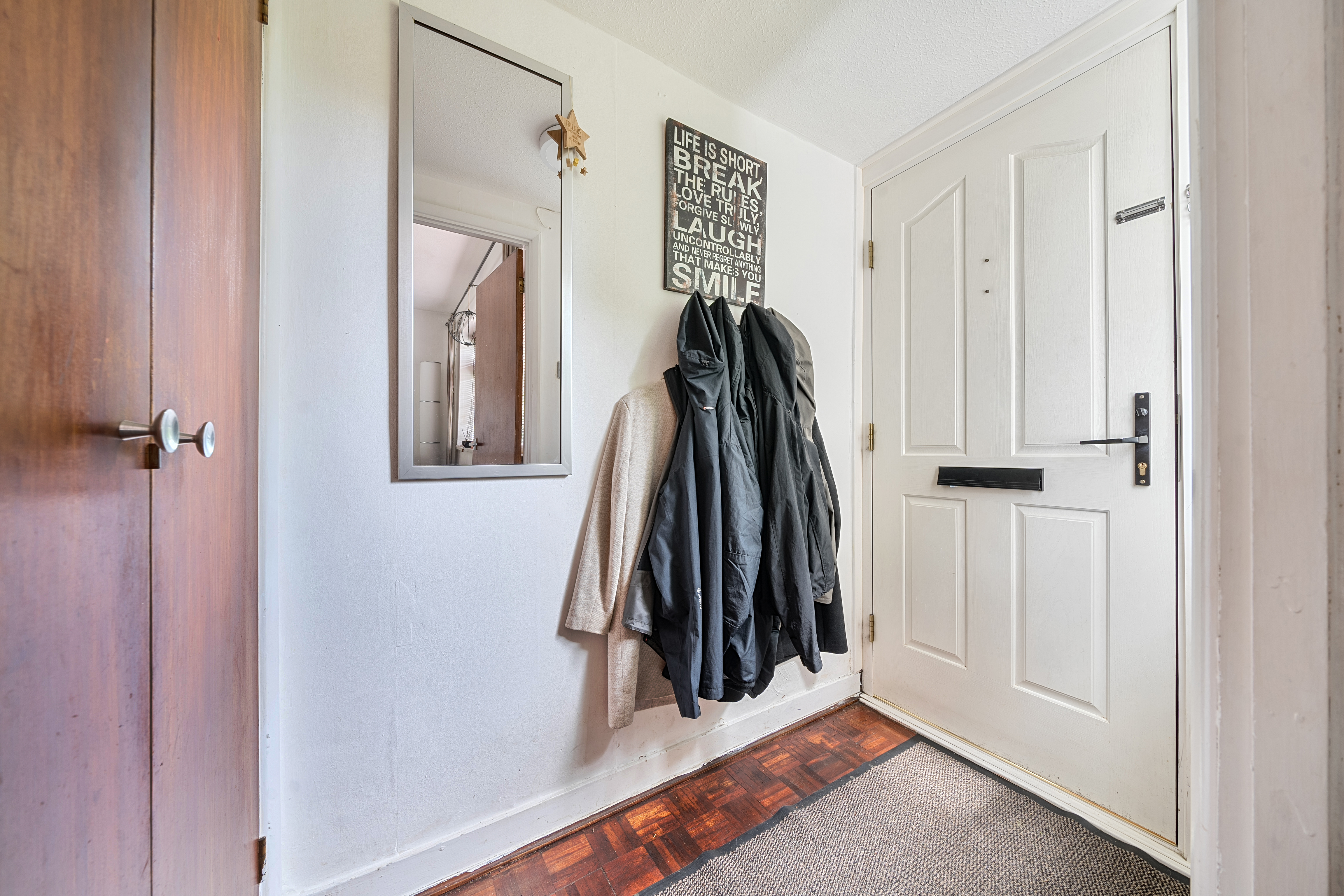 Entrance door leading through to... ENTRANCE HALL: Double doors to cloaks cupboard with hanging and shelving over, double glazed side window, woodblock flooring.