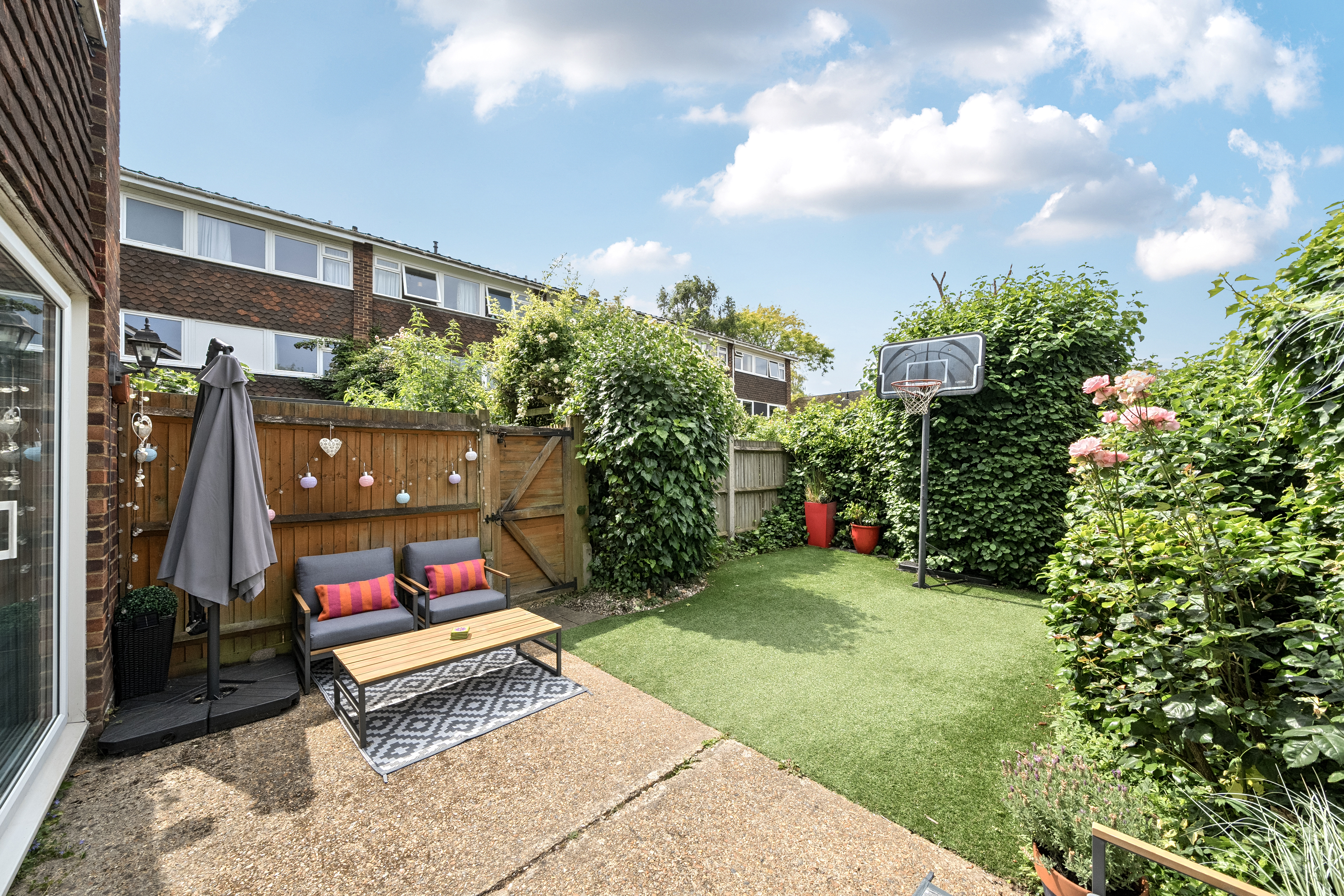 Side passageway and side access gate into REAR GARDEN: patio to immediate rear of house, outside tap, easygrass lawn with established borders, rose bush, rear personal door into GARAGE.