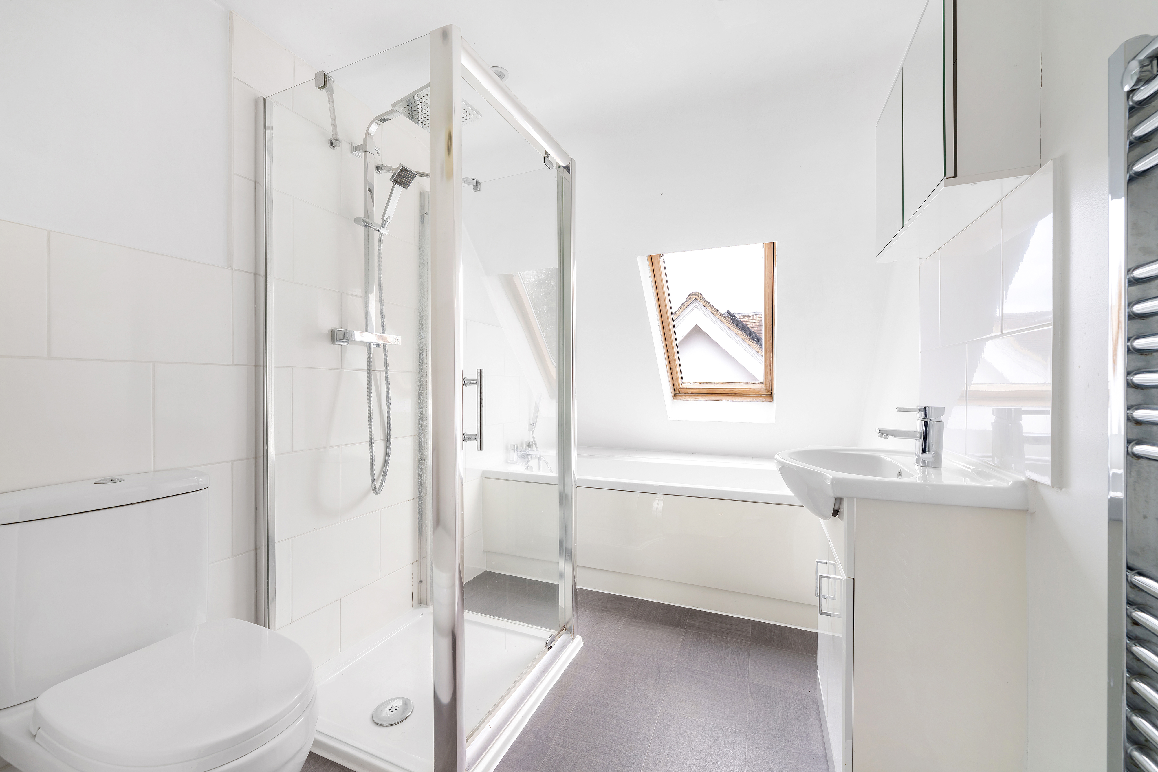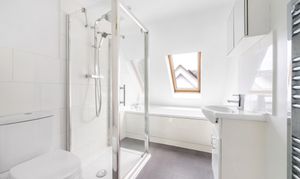 - Bathroom with walk in shower cubicle, bath tub, WC and wash hand basin with vanity unit
