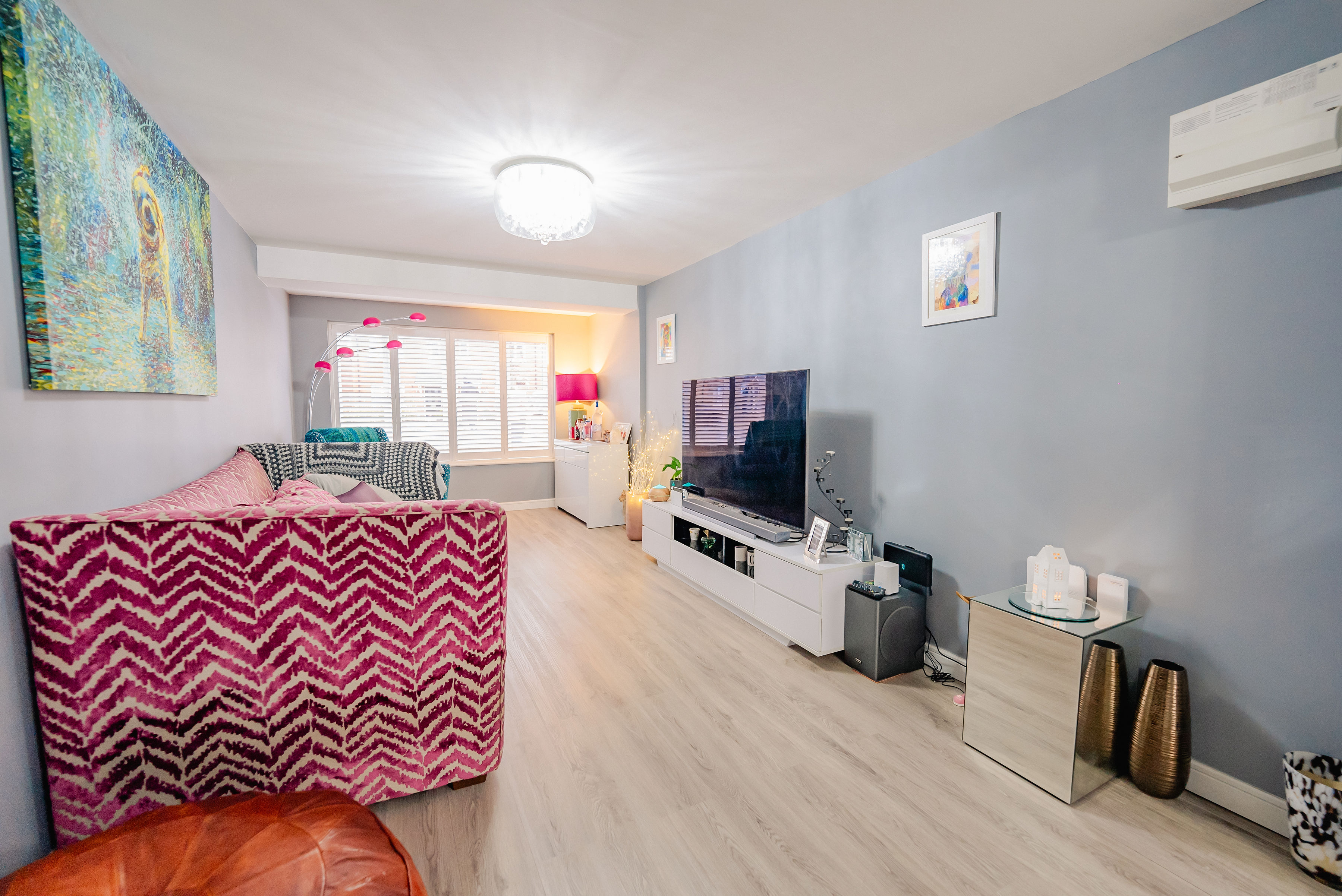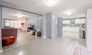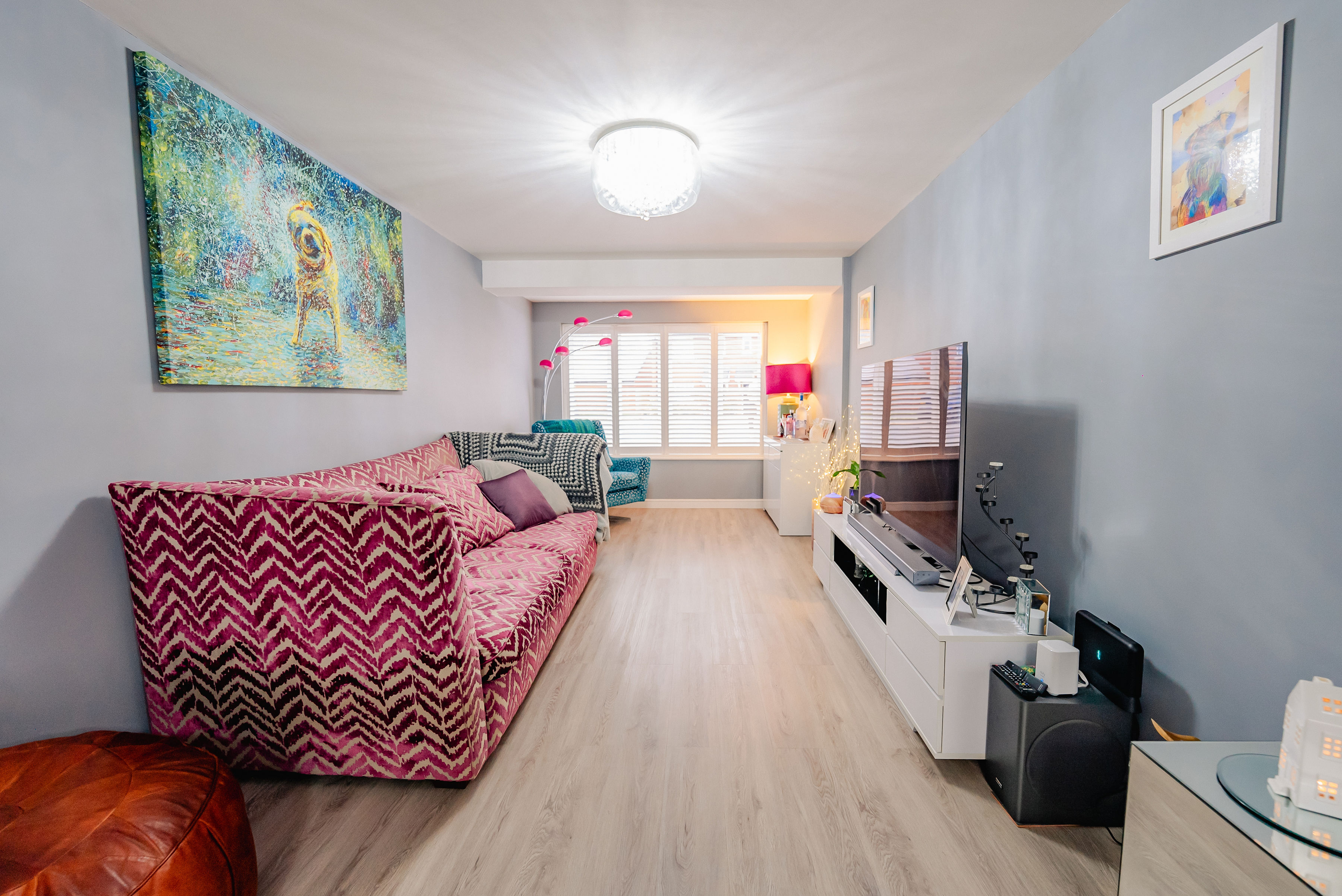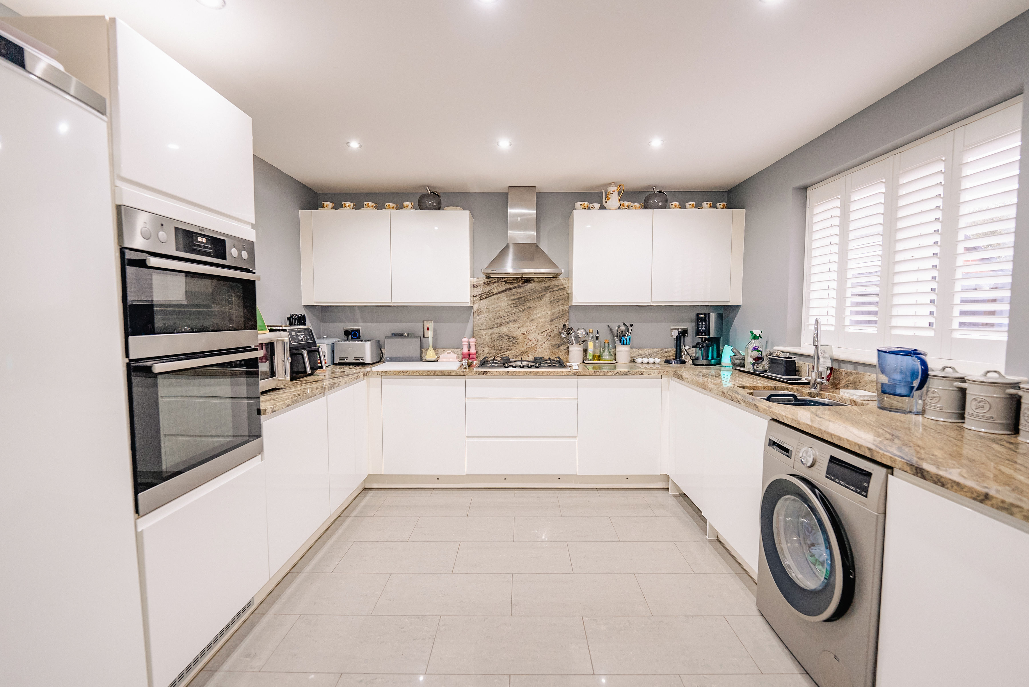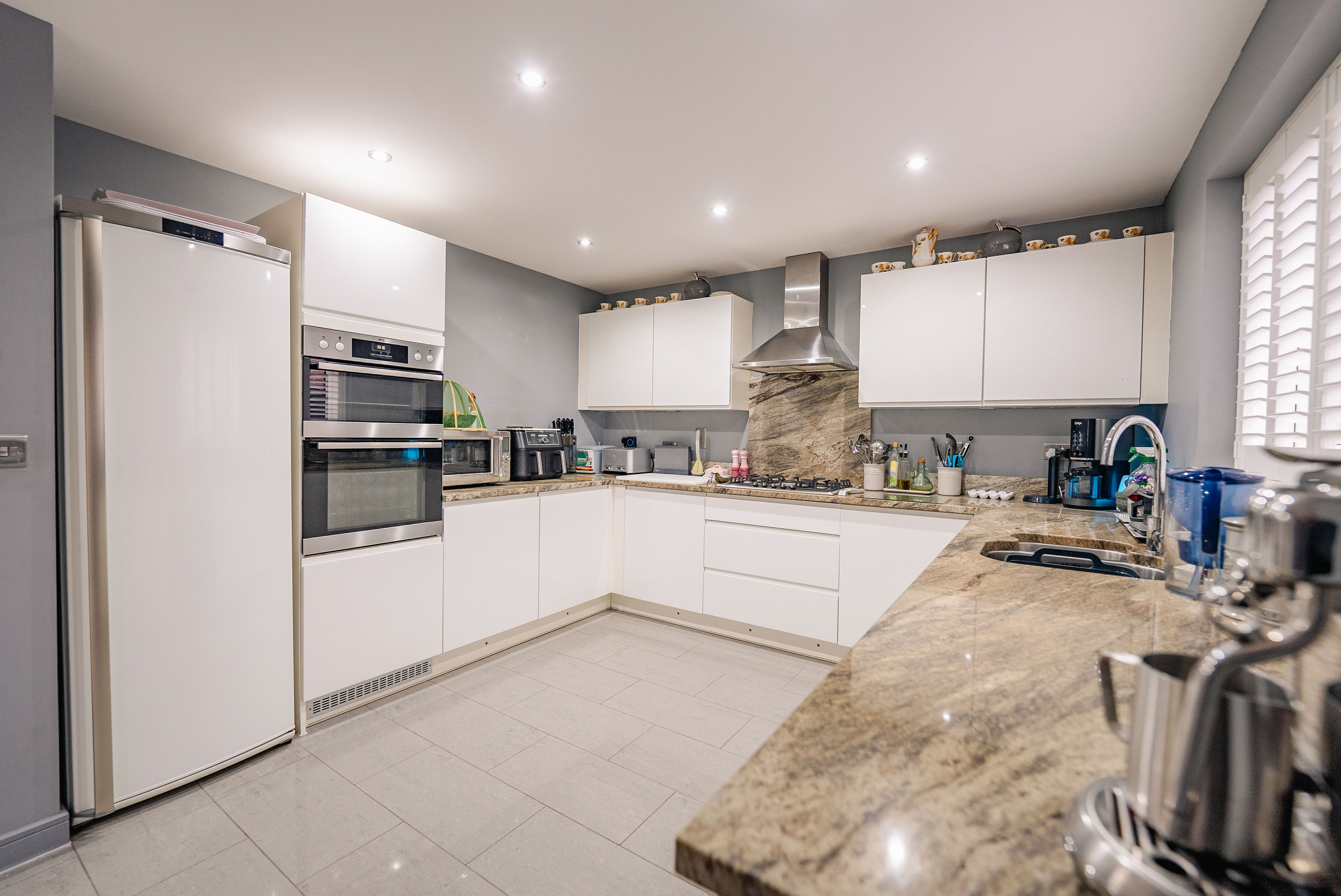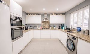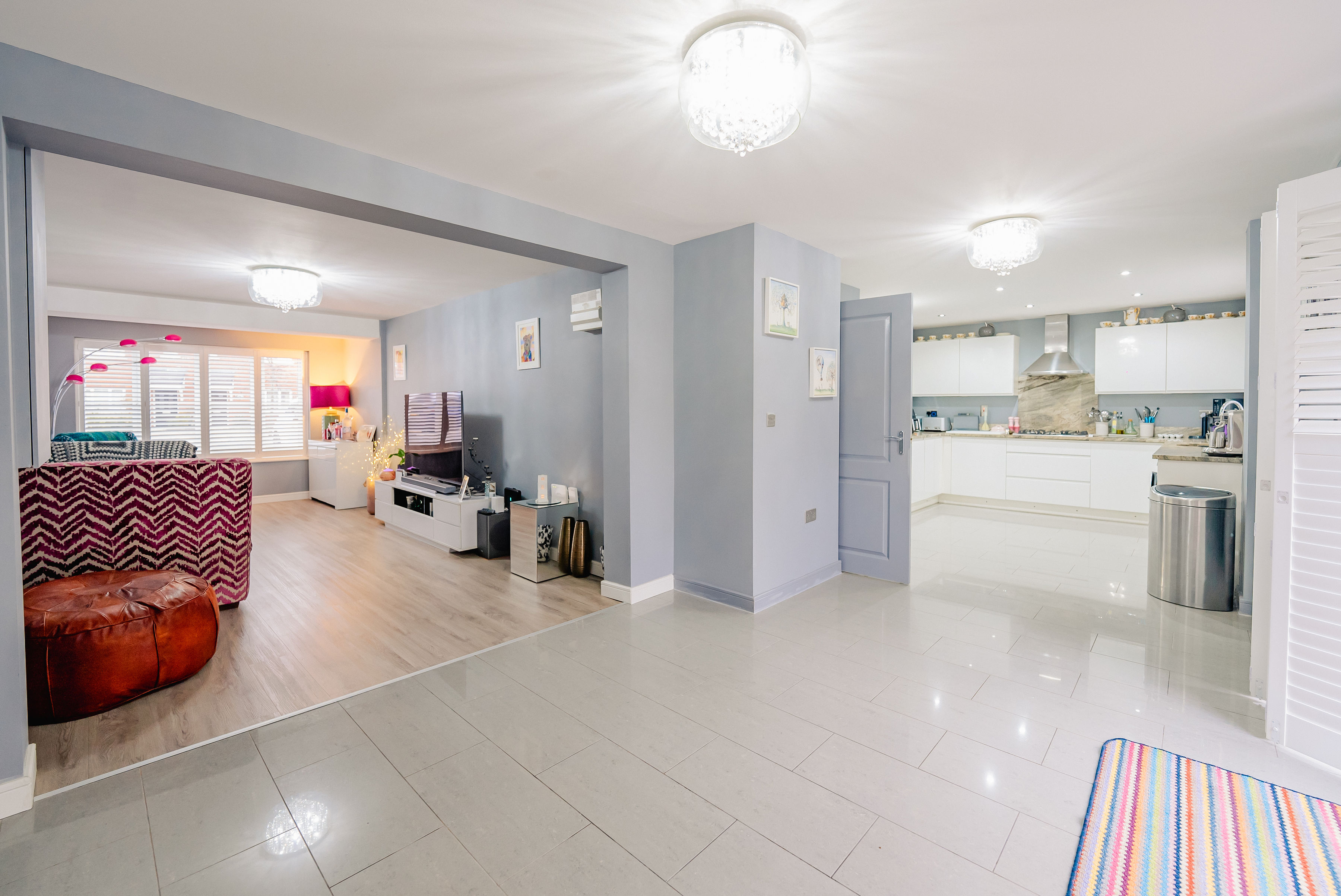 On the ground floor there is a spacious living room to the front of the property and an open plan kitchen/dining room to the rear. The garage has been converted to extend the open plan living space, making a further sitting room room. The kitchen makes a wonderful space for entertaining with double doors opening to the large patio. There is a gated lawn area to the garden, neatly separating the patio area from the greenery. There are a range of sleek wall and base units to the kitchen, with integrated appliances to include an oven with five-ring gas hob, dishwasher and space for a freestanding fridge/freezer. A convenient cloakroom can be found from the generous hallway, while a driveway provides parking for two vehicles to the fore.
