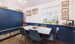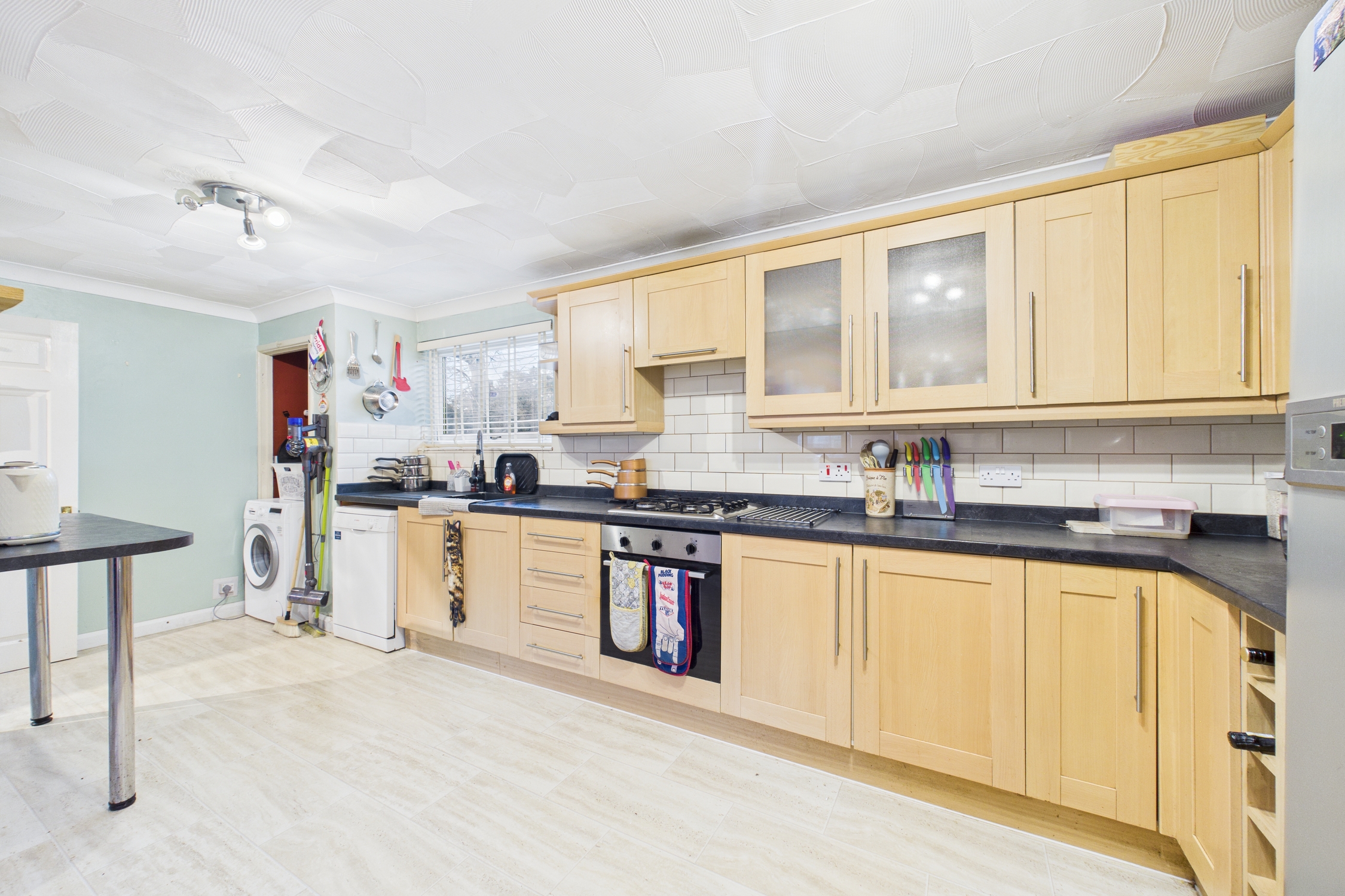 Window to rear, wall and base units with worktop over, inset one bowl sink unit with mixer tap over, matching up stand and tiled splash backs and laminate flooring. Built in single oven, gas hob with cooker hood over, further space for dishwasher and American style fridge freezer, breakfast bar, storage cupboard with space for washing machine and wall mounted gas combination boiler and opening to dining room.