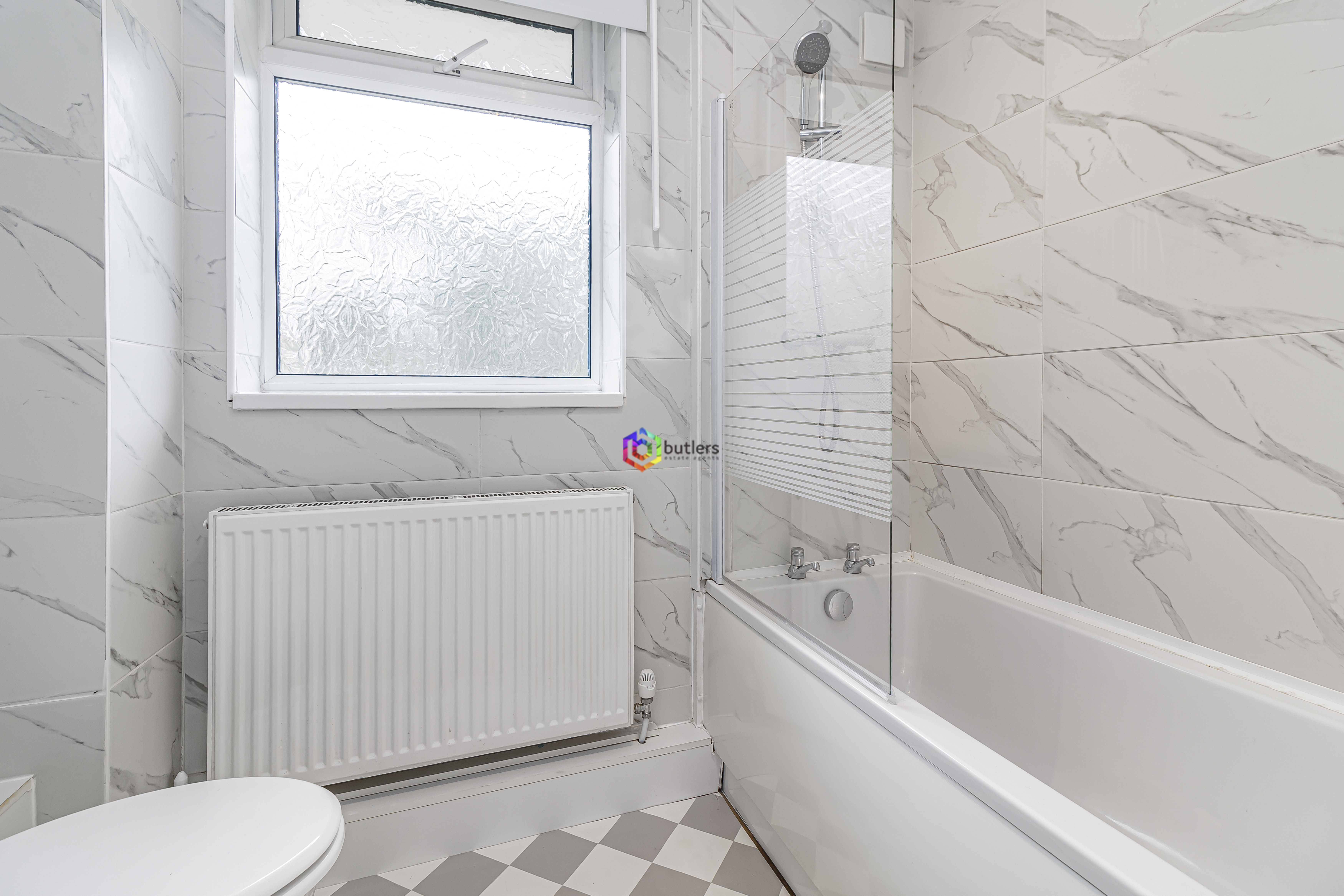 Fitted with a white bath with shower over and glass screen, there is a white wash hand basin and a white WC. Lovely modern space to enjoy a soak.