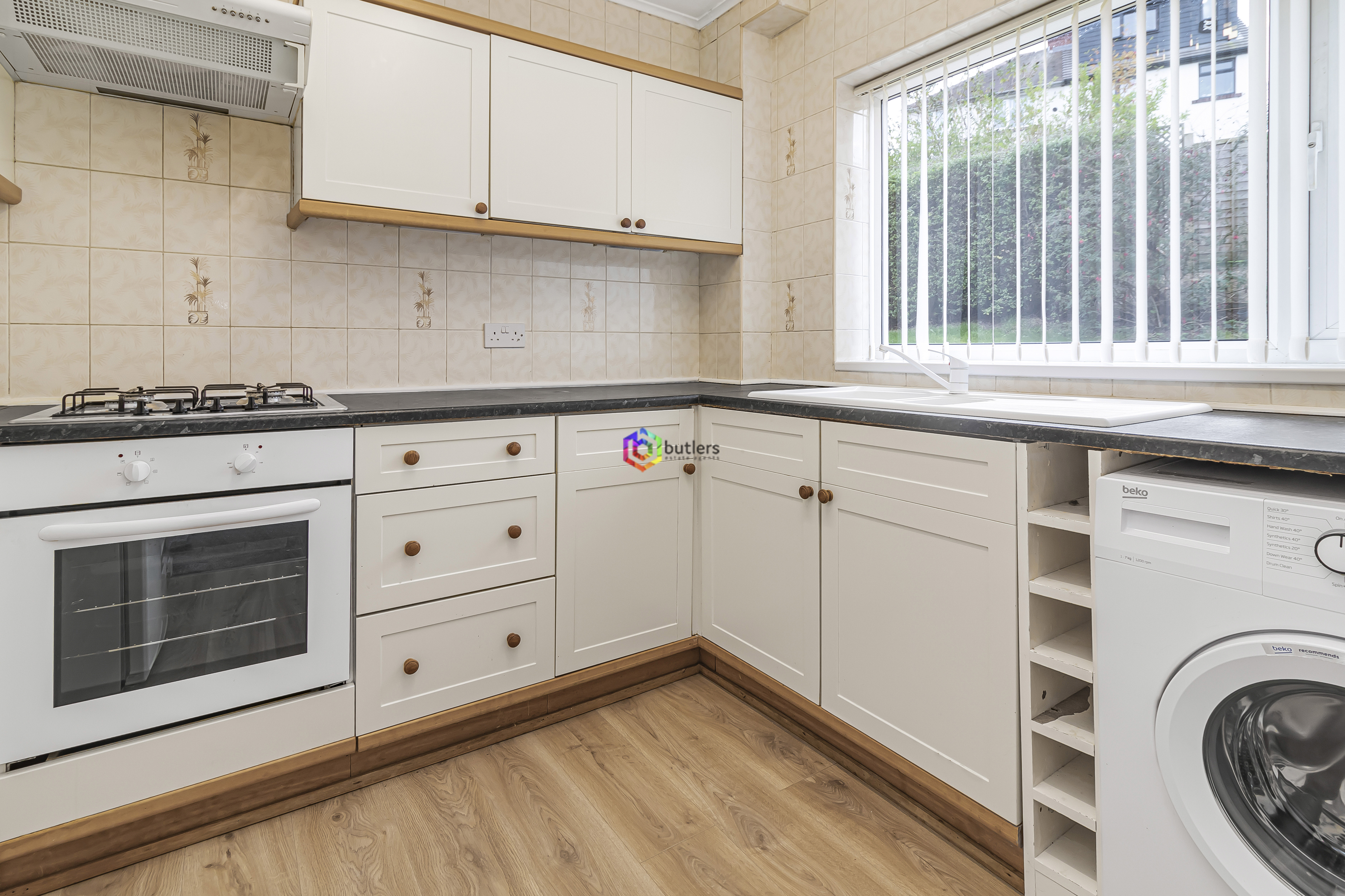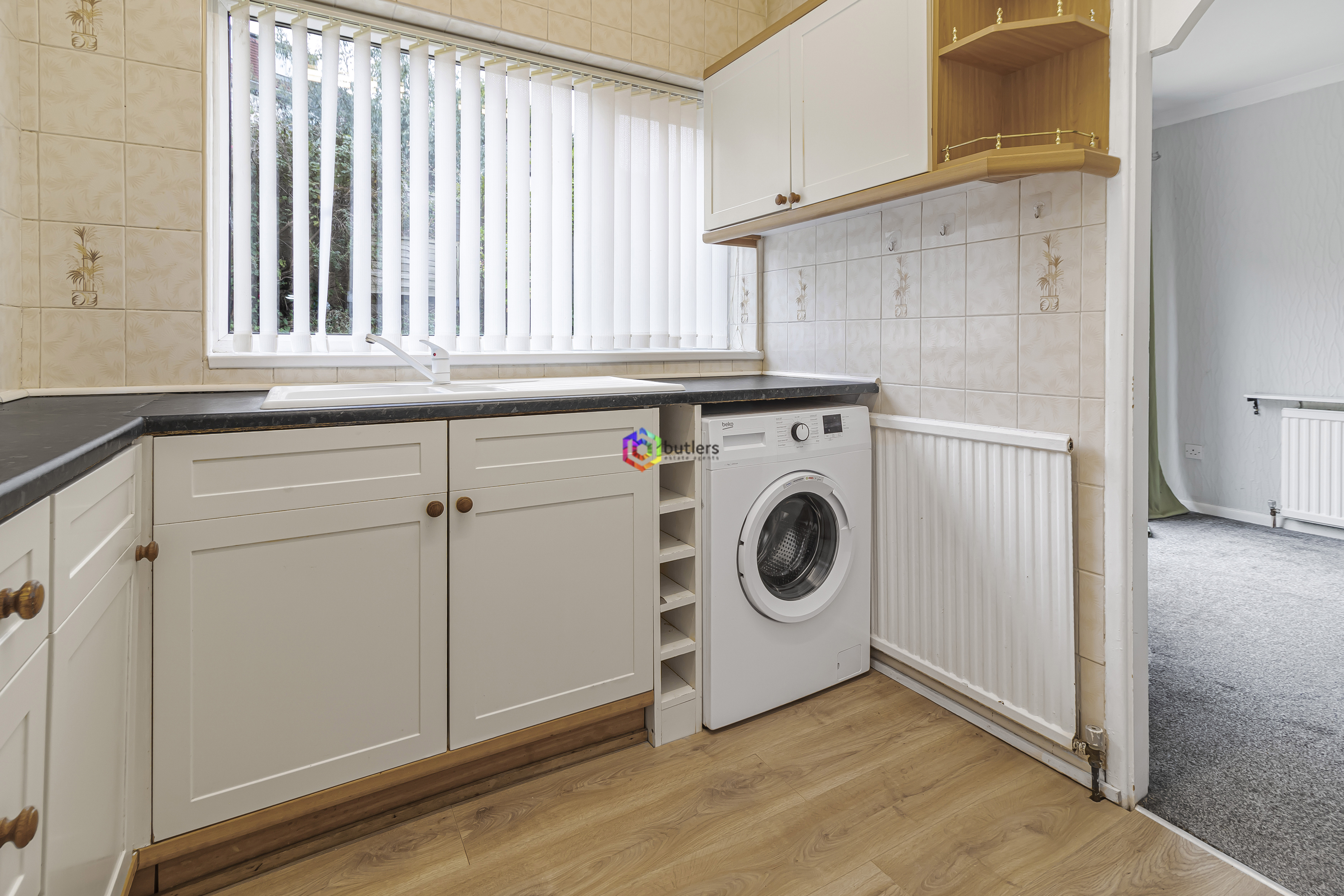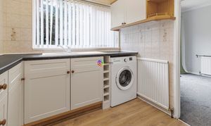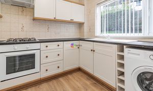 Fitted with a range of wall and floor mounted cream units with contrasting black worksurfaces. There is a white electric oven with four burner gas hob and extractor above. A white washing machine and fridge freezer. The sink is beneath the window overlooking the rear garden. Plenty of opportunity to create a large space by knocking through to the adjacent dining room subject to the necessary permissions.